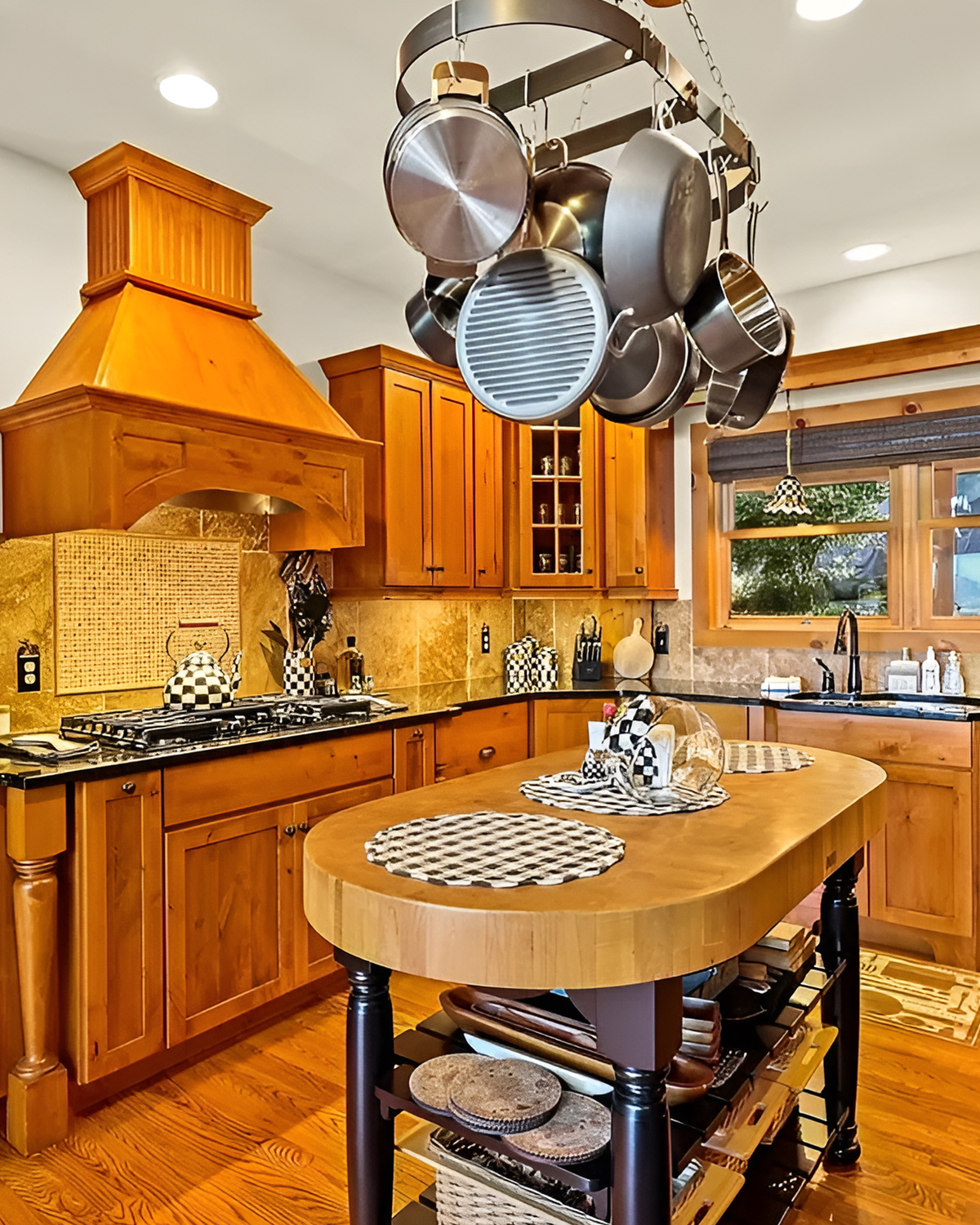 20) Classic Cabin Kitchen With a Copper Hood and Hanging Pot Rack