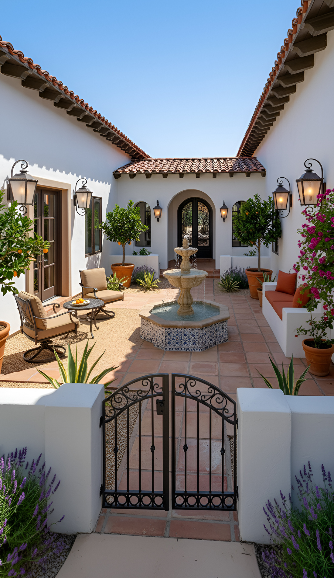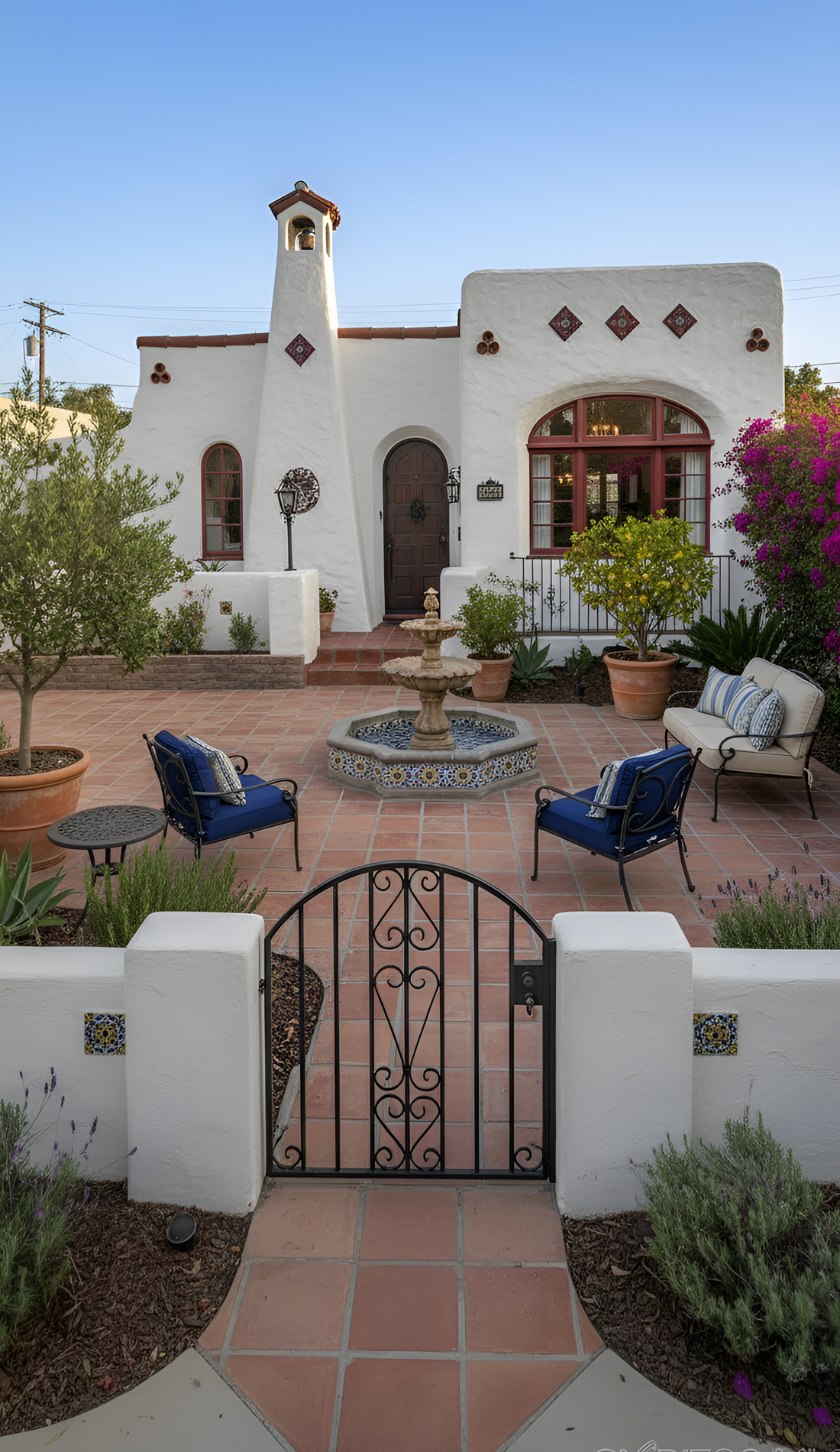 One of the easiest ways to make a front yard feel more Spanish is to give it a courtyard spirit. Even if you do not have a true enclosed courtyard, you can still borrow the look. Use low stucco walls, iron gates, and layered planting to shape a more intimate entry.