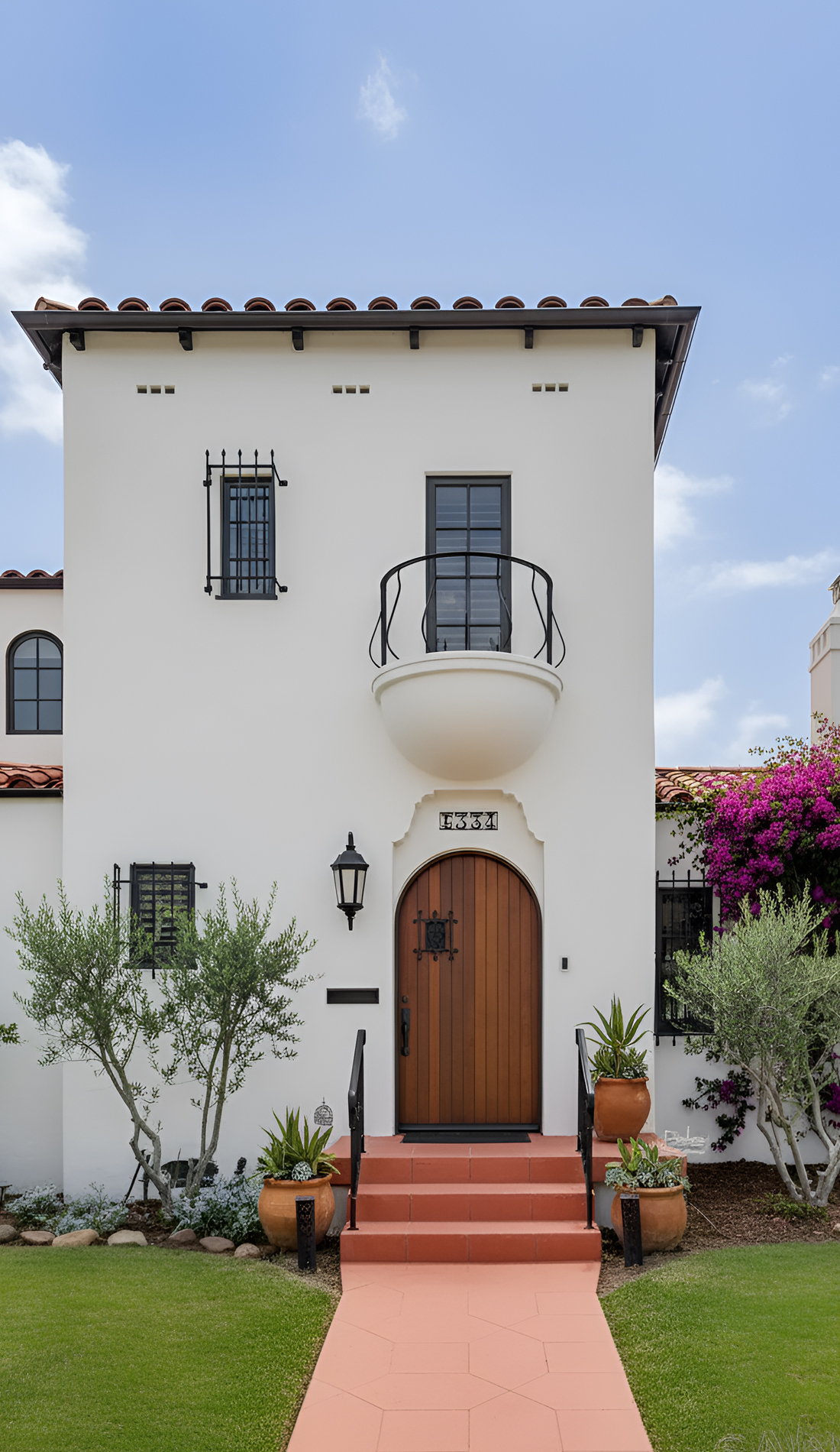 This idea works especially well on homes with arched doors, stucco walls, and symmetrical facades. The vertical shape of the trees draws the eye upward and gives the house a more stately look. At the same time, the greenery softens the hard lines of the architecture.