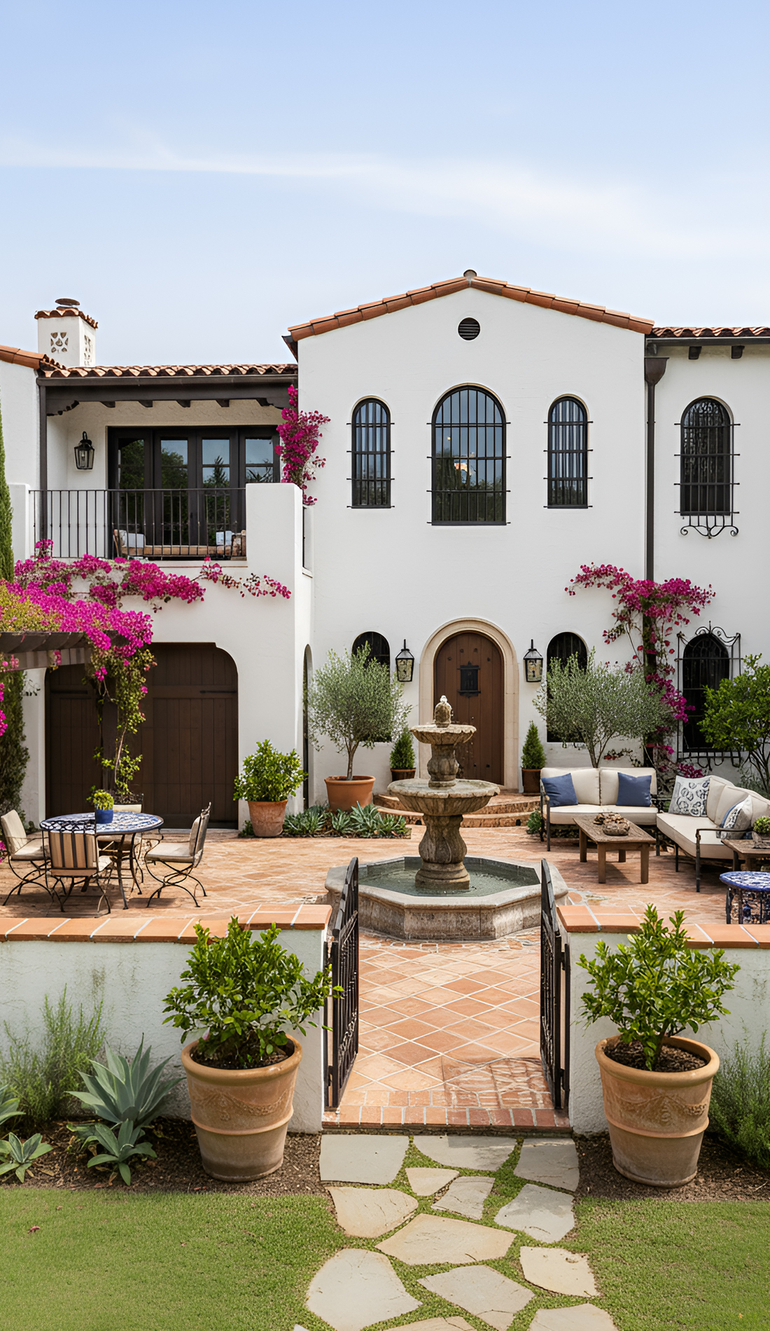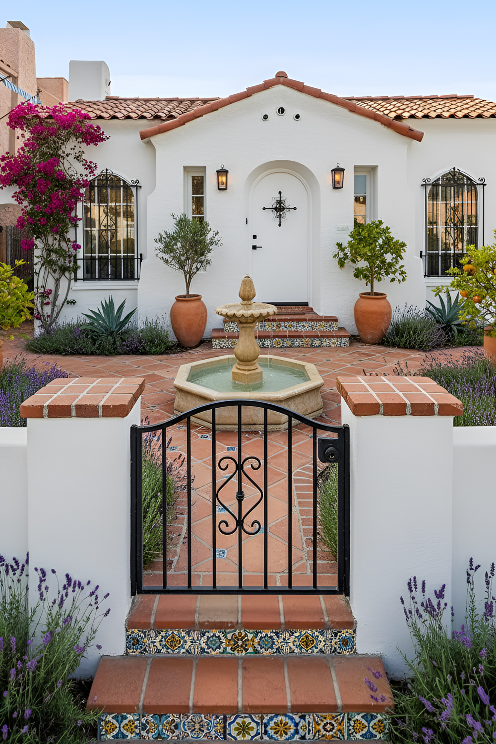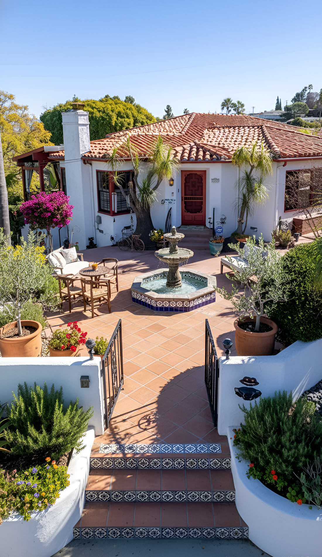 A fountain gives a Spanish style front yard instant character. It adds sound, movement, and a sense of calm. Even a small fountain can make the yard feel elegant and established.