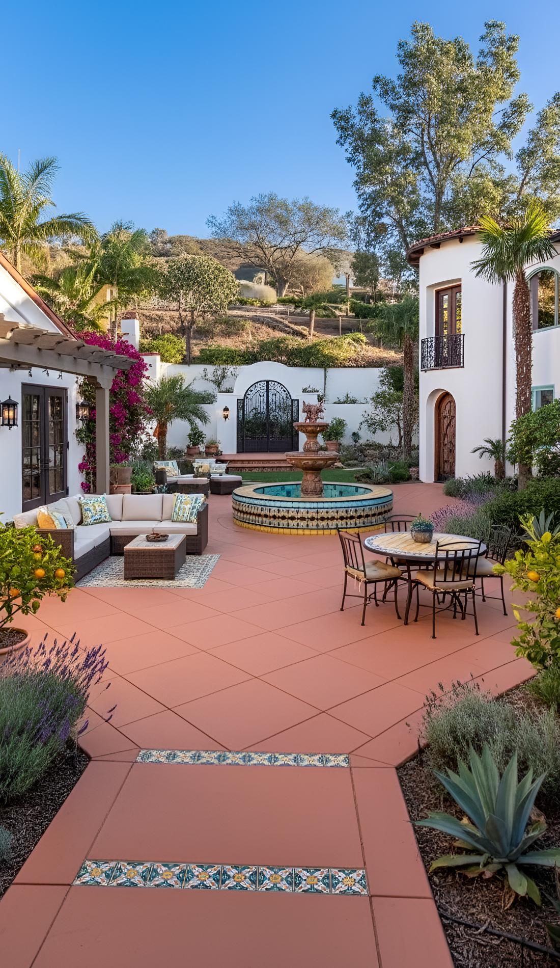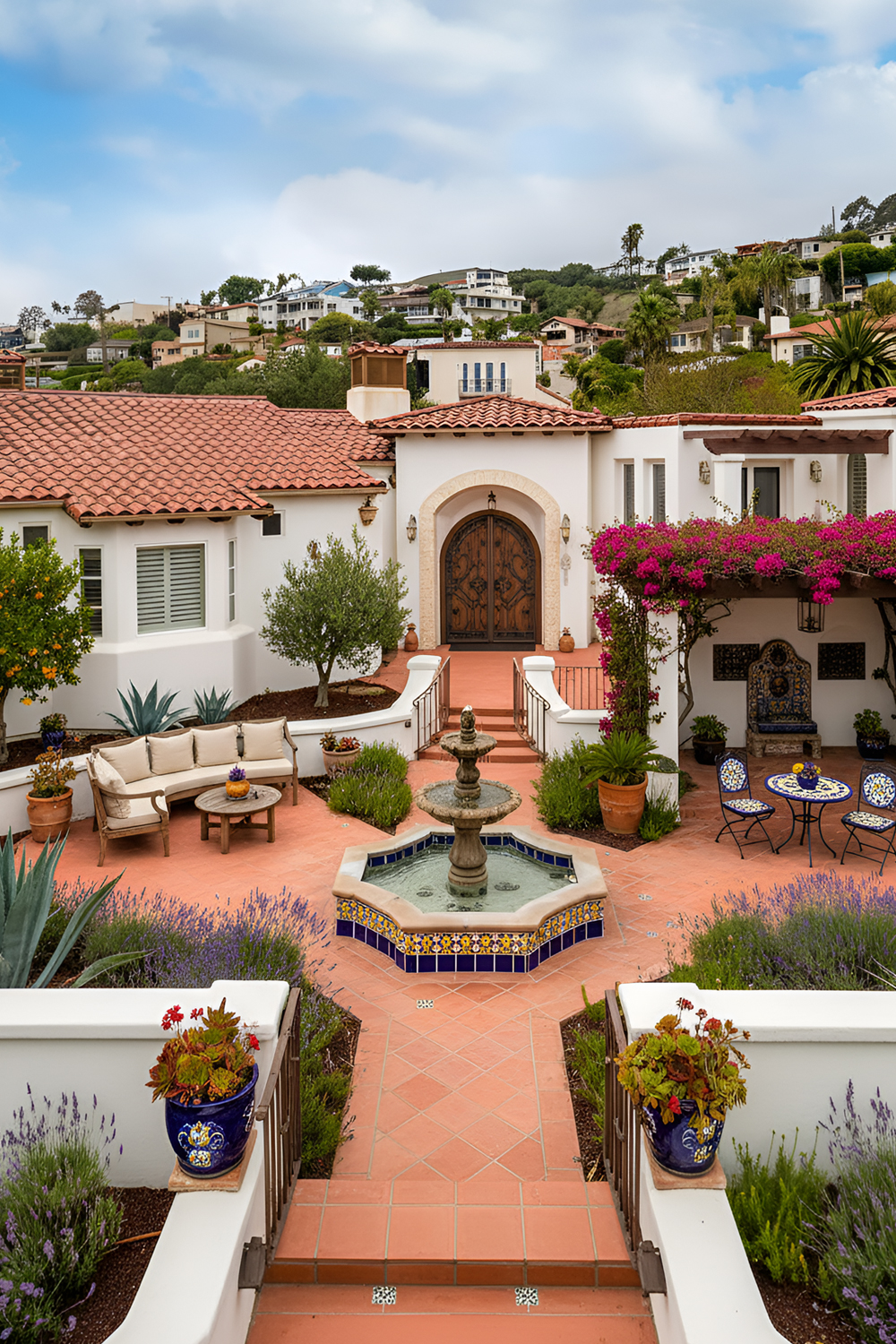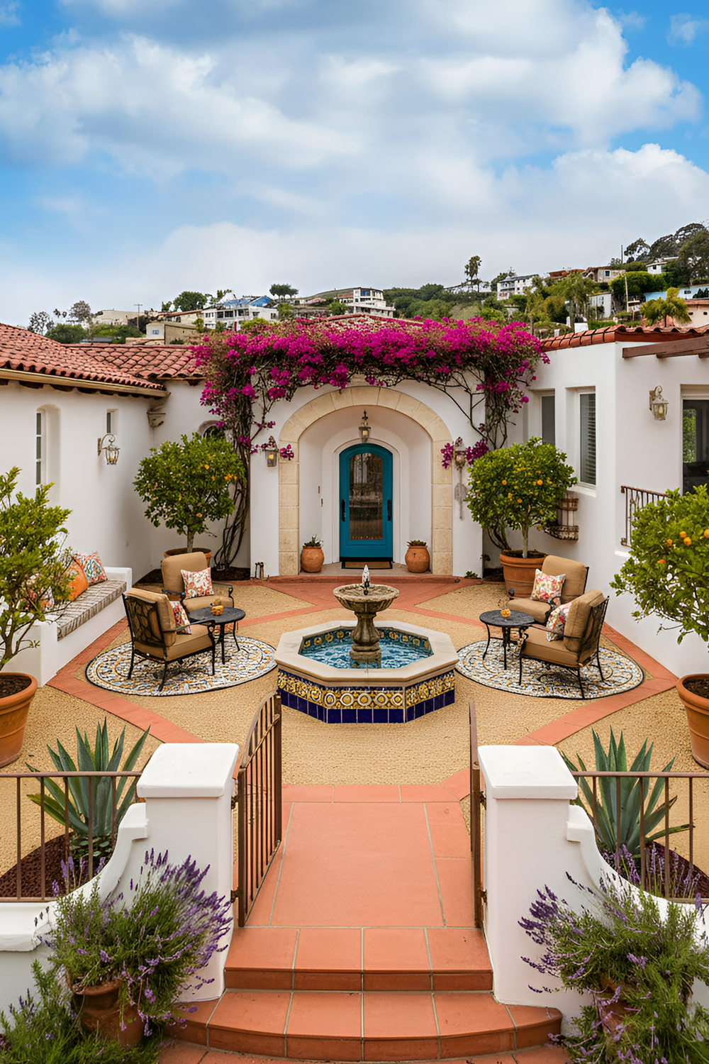 A fountain gives a Spanish style front yard instant character. It adds sound, movement, and a sense of calm. Even a small fountain can make the yard feel elegant and established.