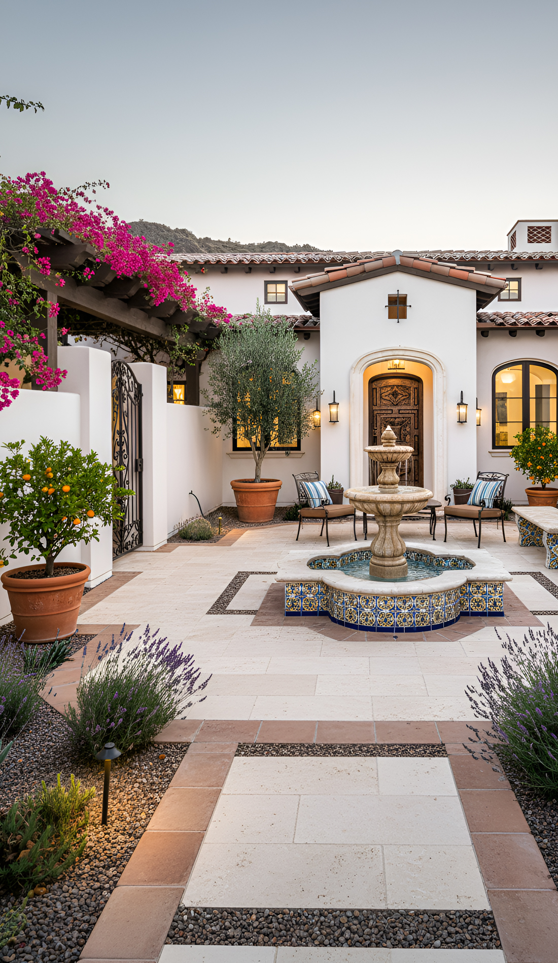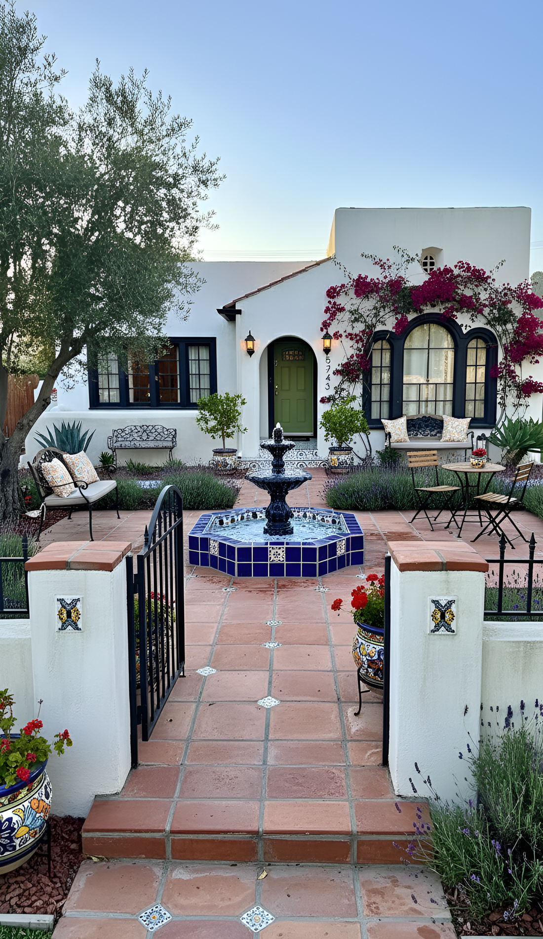 Not every Spanish style front yard has to feel old-fashioned. In fact, one of the best looks right now blends classic Spanish materials with a cleaner, more modern layout. You might use gravel, agave, terracotta pots, and a tiled fountain, but arrange them in a simpler, more open way.