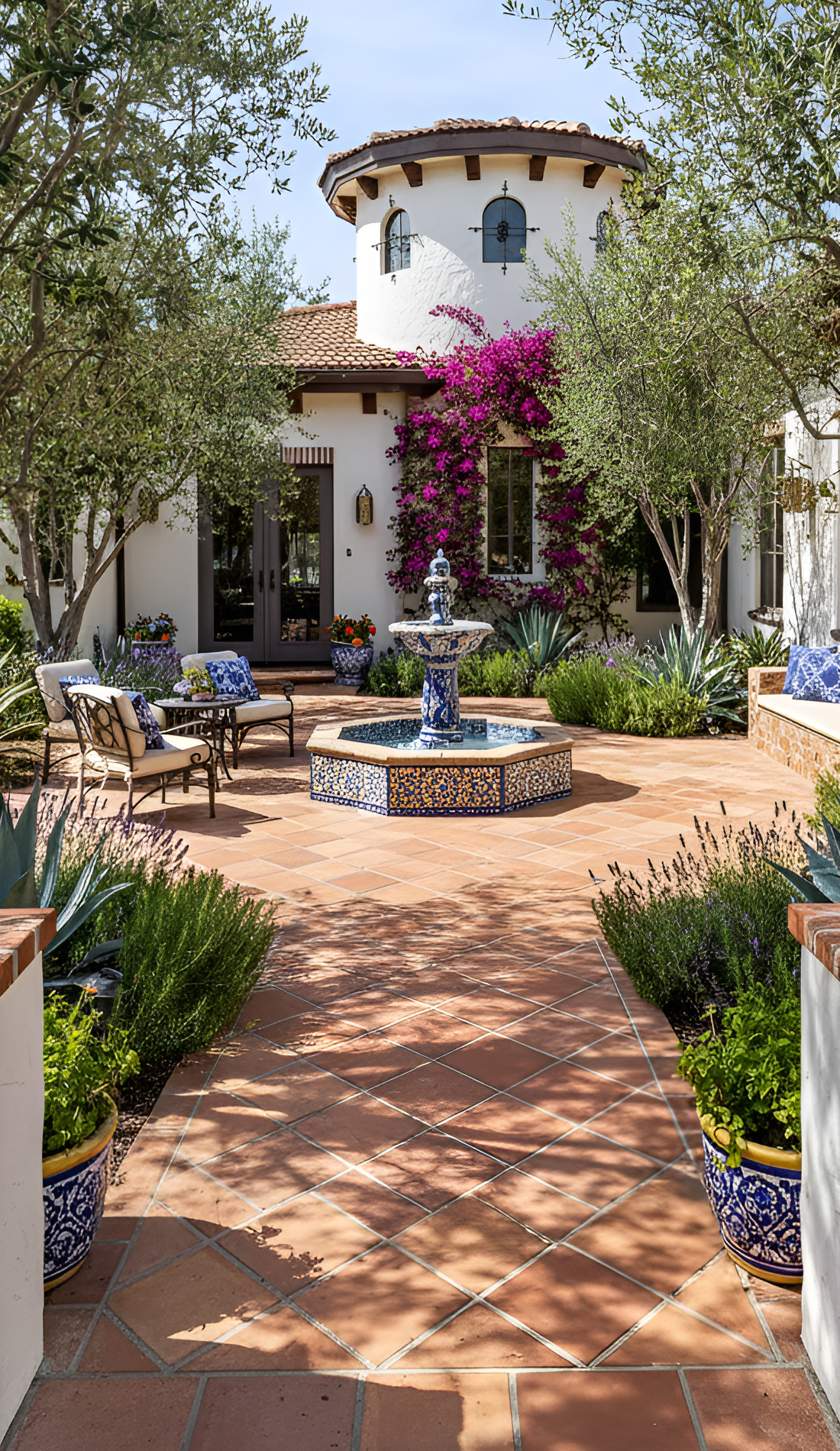 You do not need a grand stone fountain to make this work. A wall fountain, bowl fountain, or tiled pedestal fountain can all fit the style. The key is to choose something with old-world charm and place it where it feels intentional.