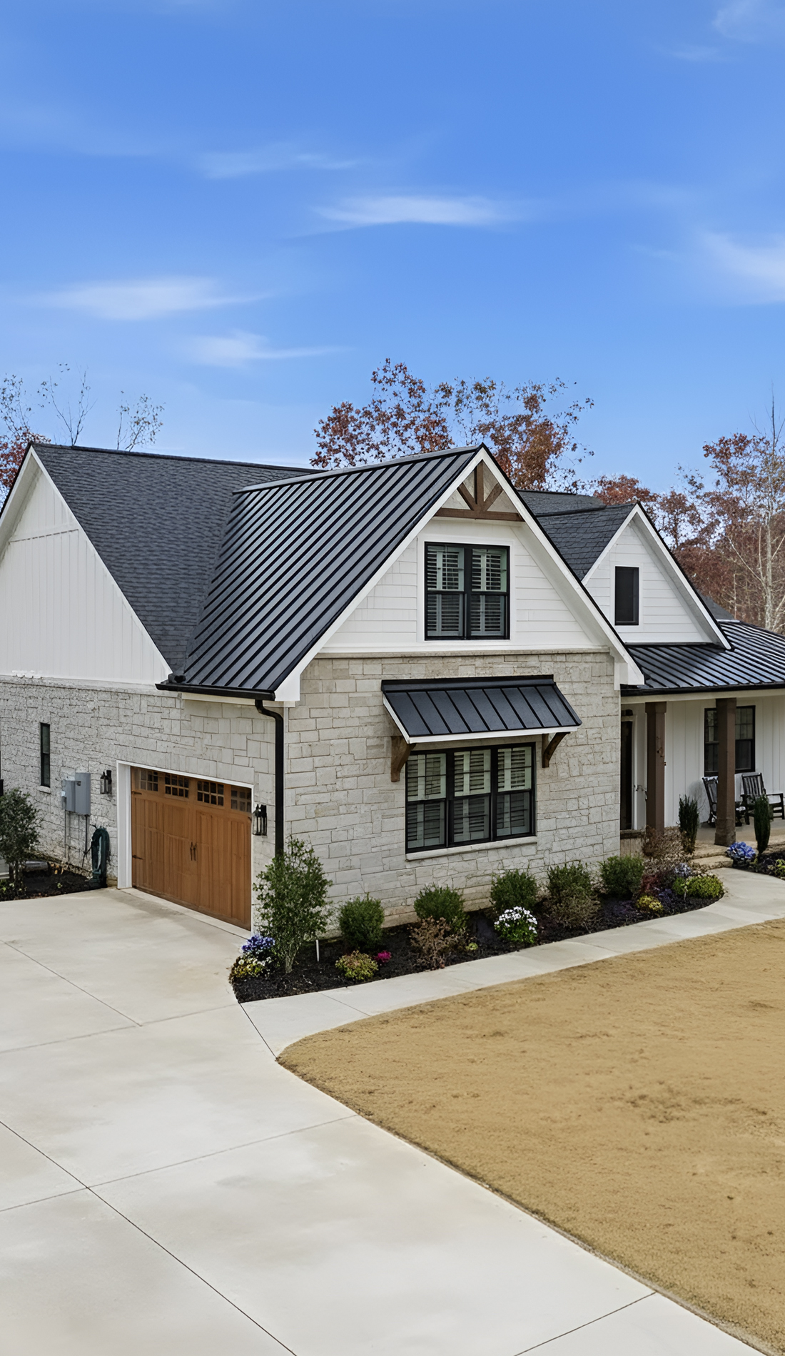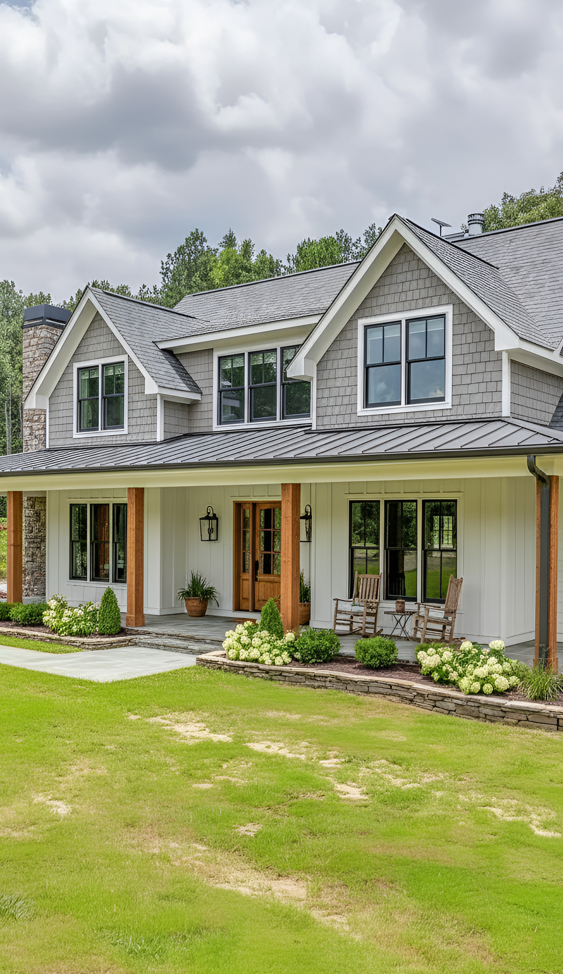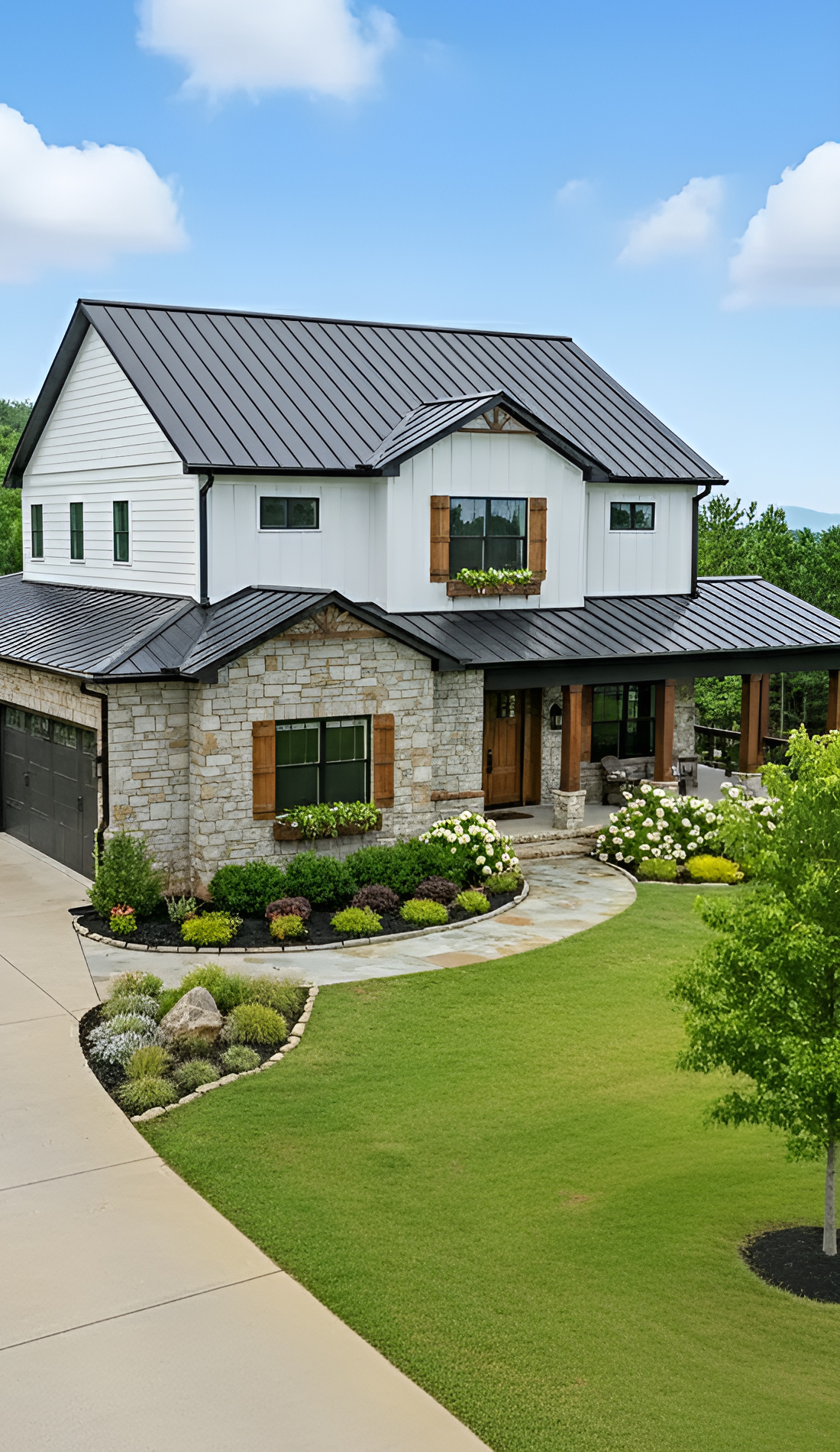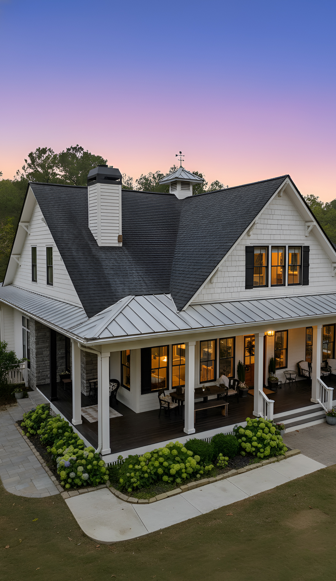 A matte black metal roof feels modern. Galvanized metal feels more rustic and traditional. Both pair beautifully with farmhouse siding and wood accents.