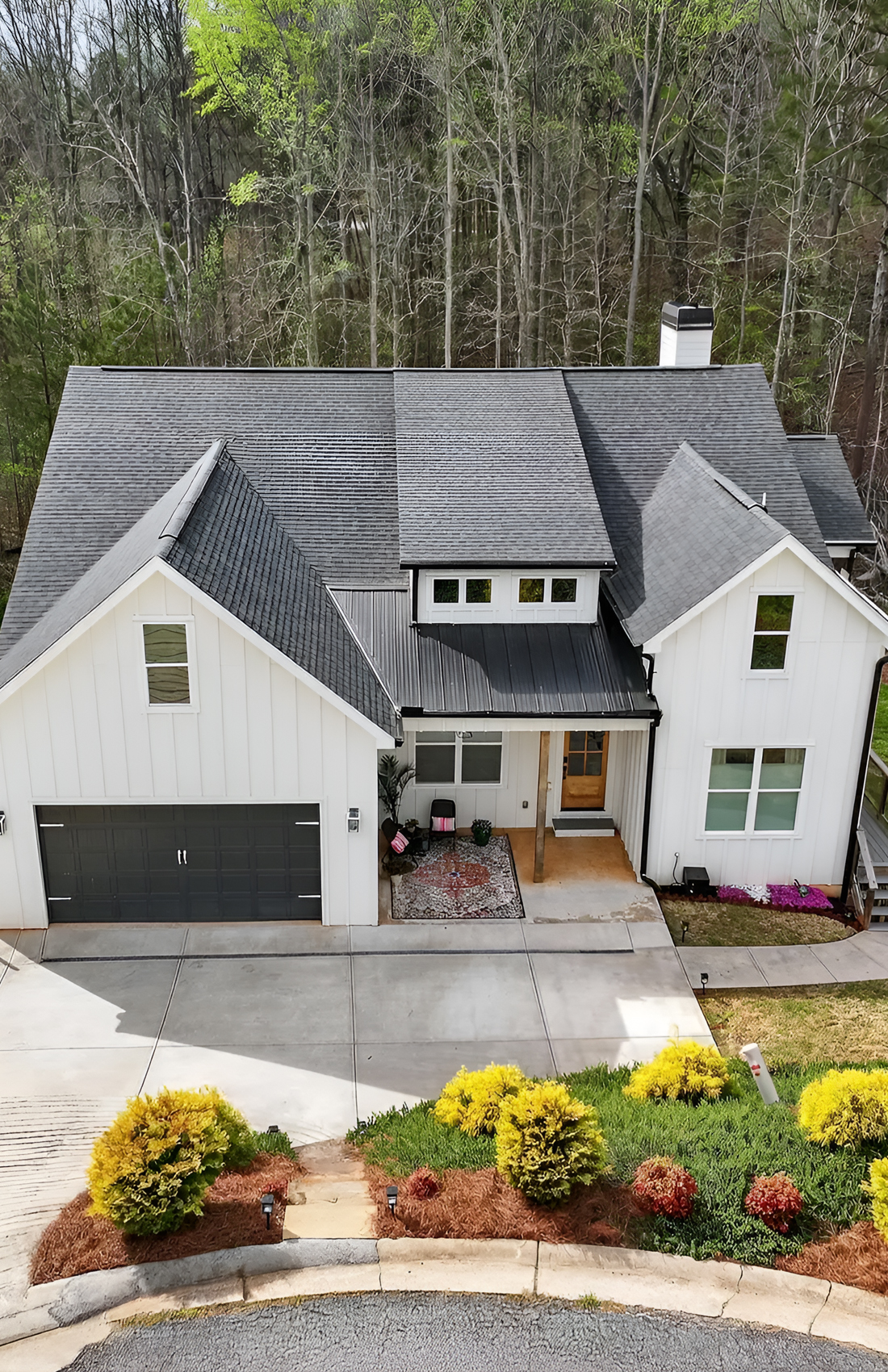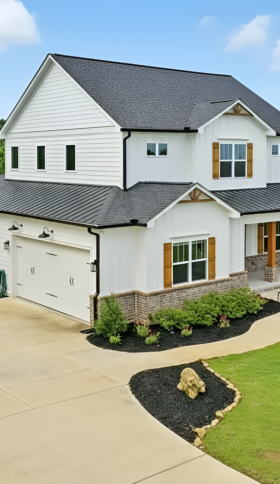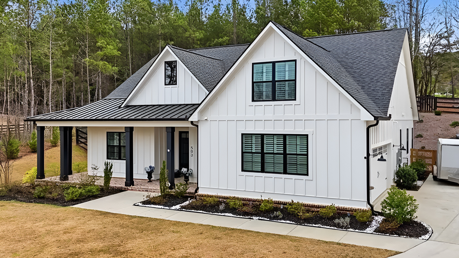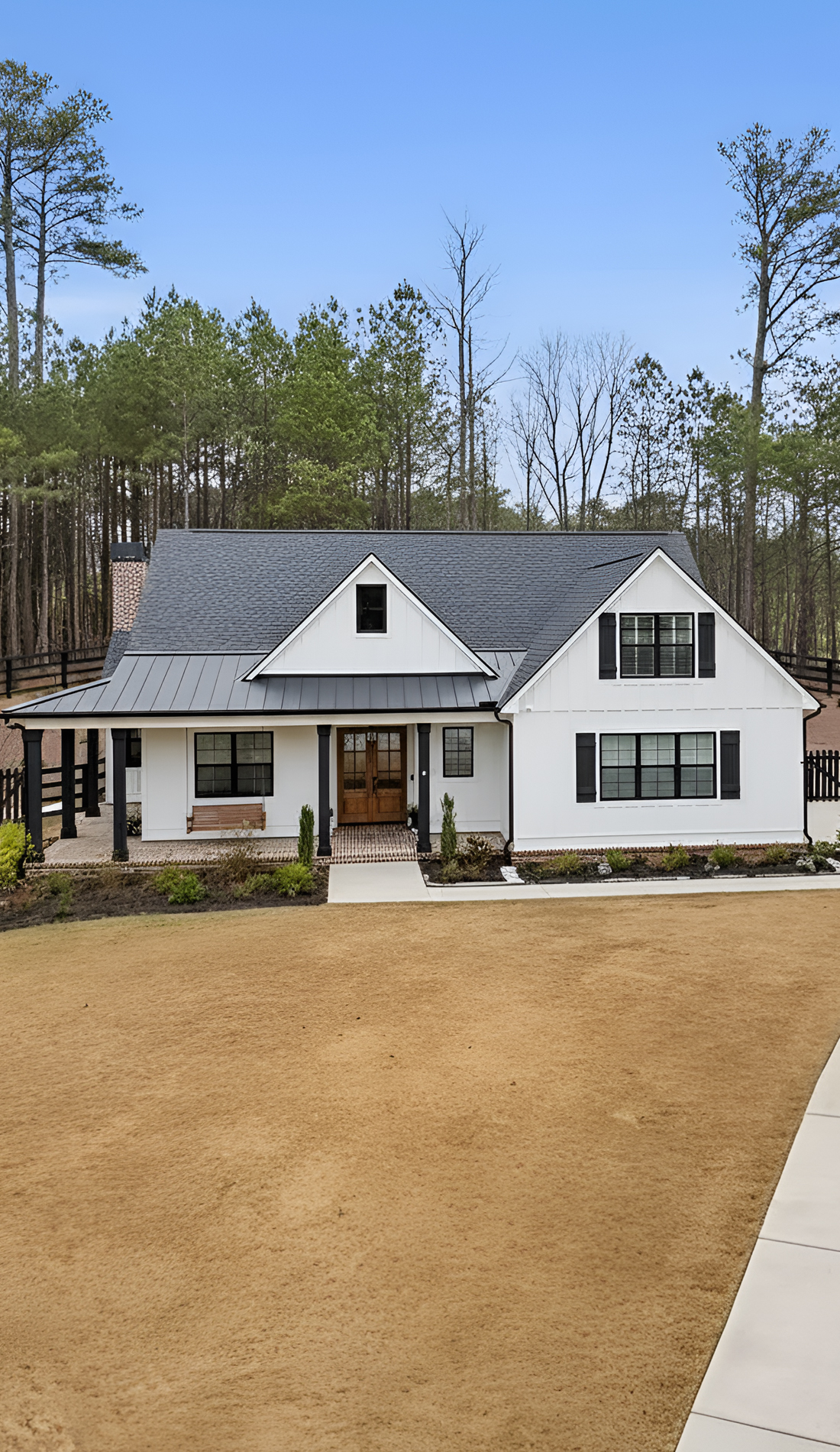 A matte black metal roof feels modern. Galvanized metal feels more rustic and traditional. Both pair beautifully with farmhouse siding and wood accents.