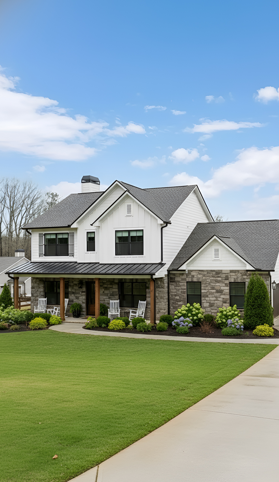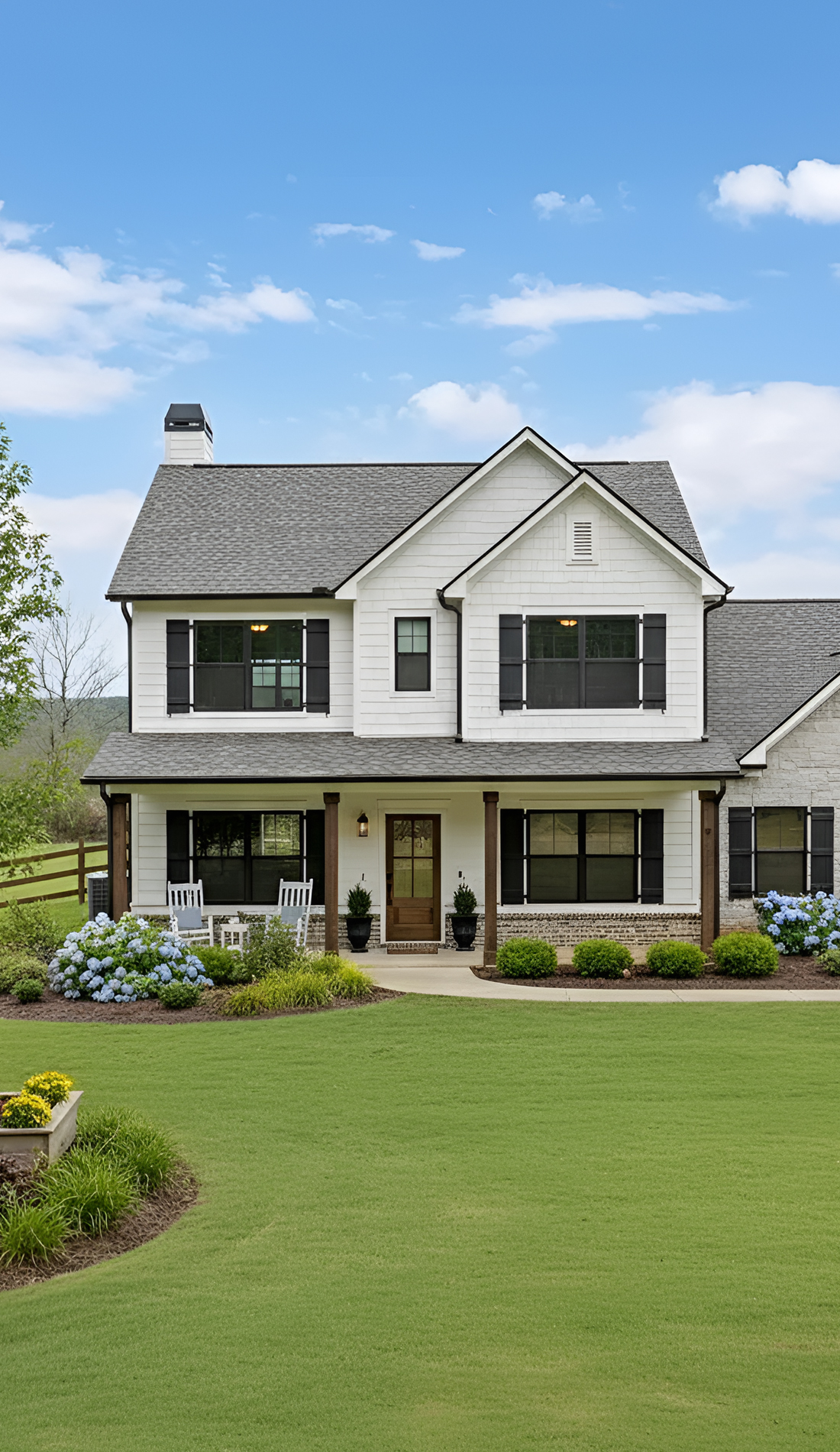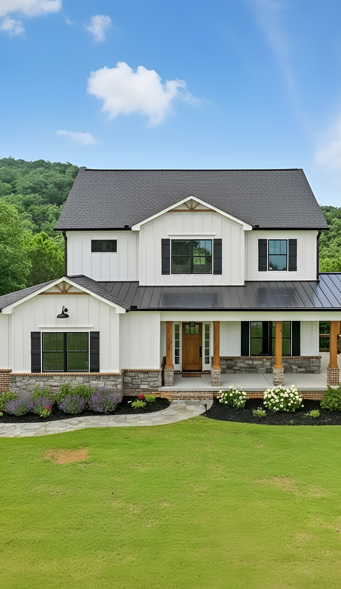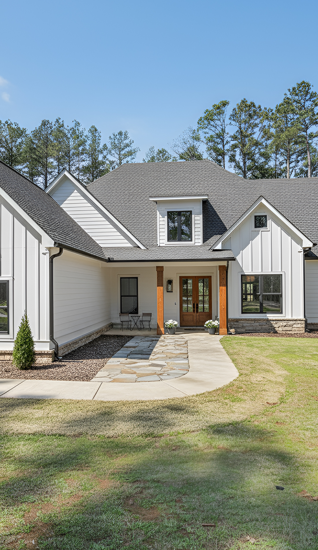 This look works best when the lines of the home are clean. A simple roofline, a welcoming porch, and uncluttered landscaping help the contrast shine. If the contrast feels too strong for your taste, soften it with wood elements. A stained front door, cedar posts, or warm planters can make the palette feel less stark.
