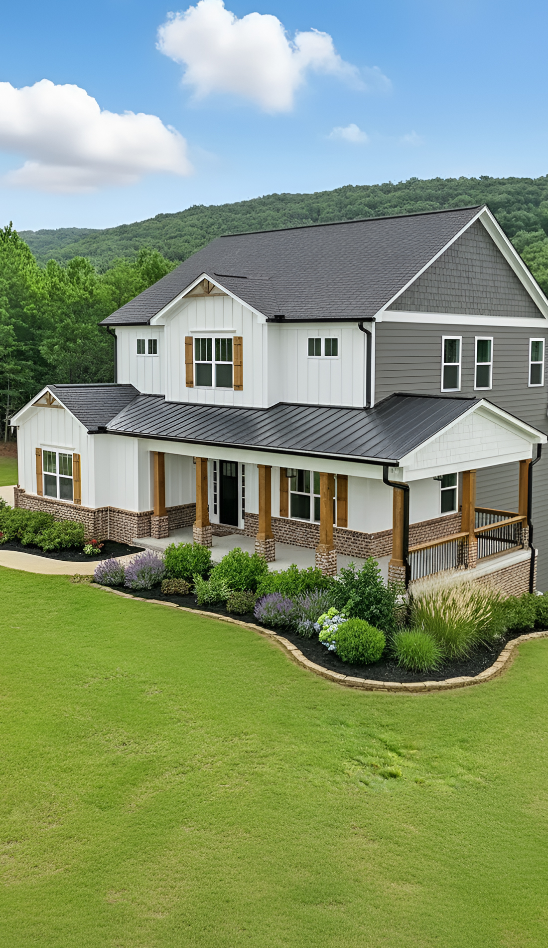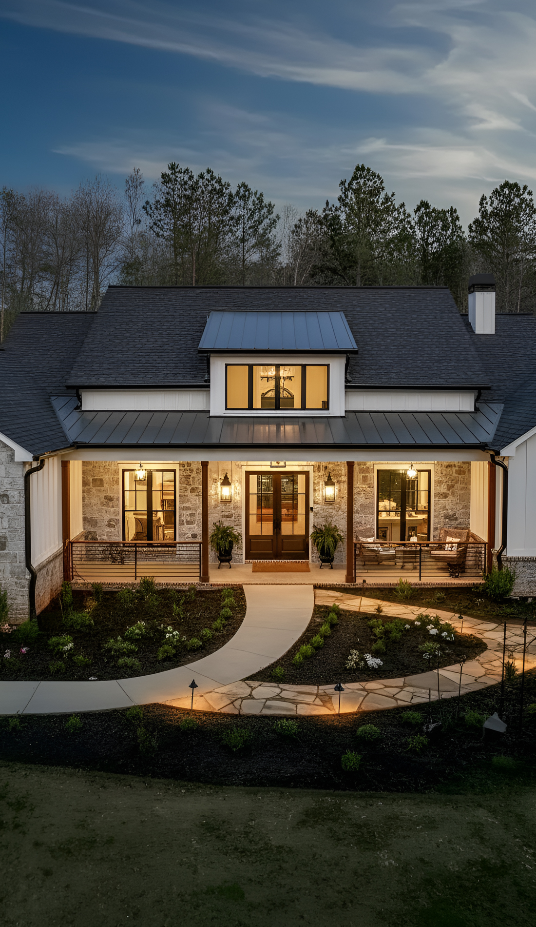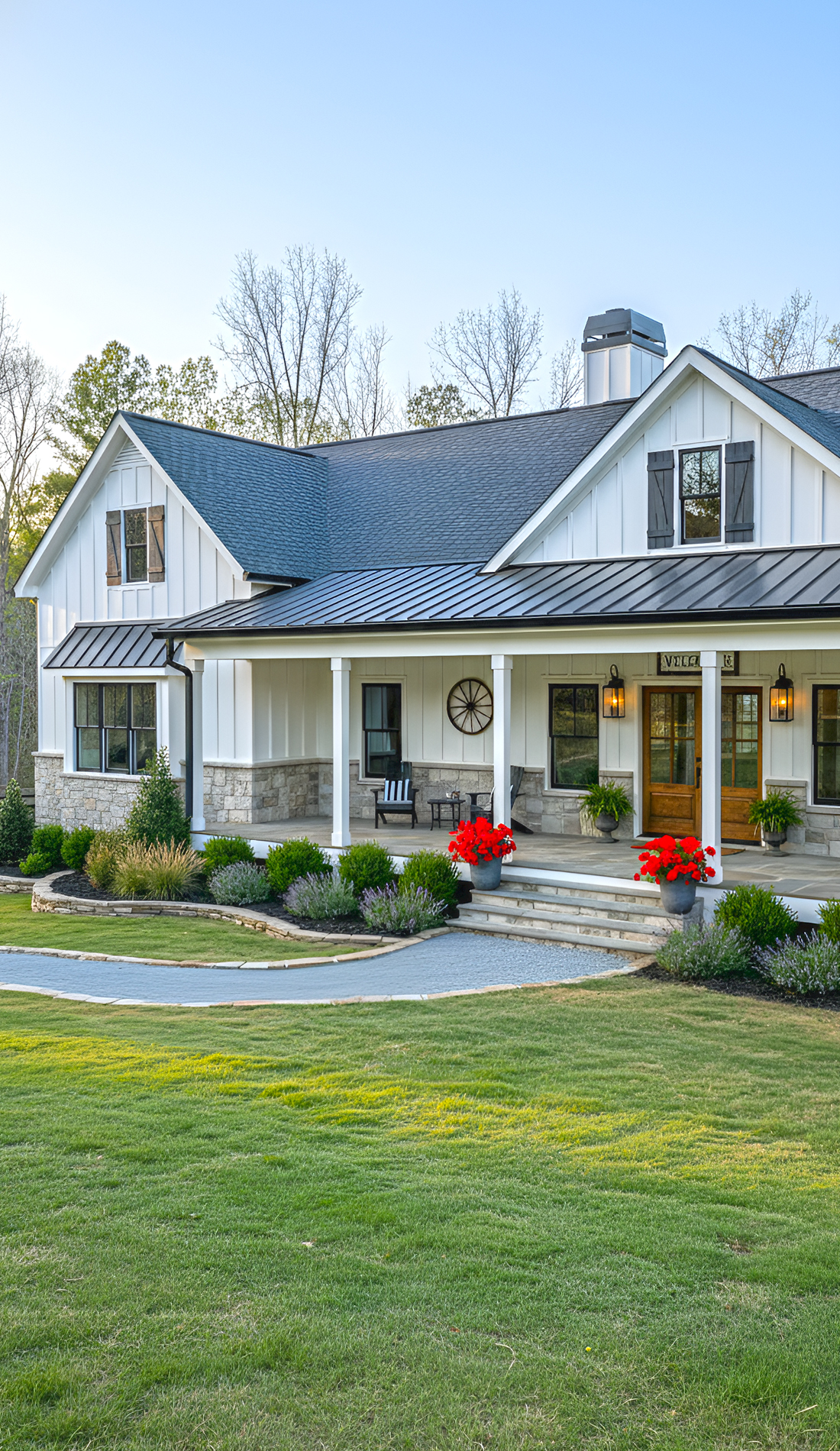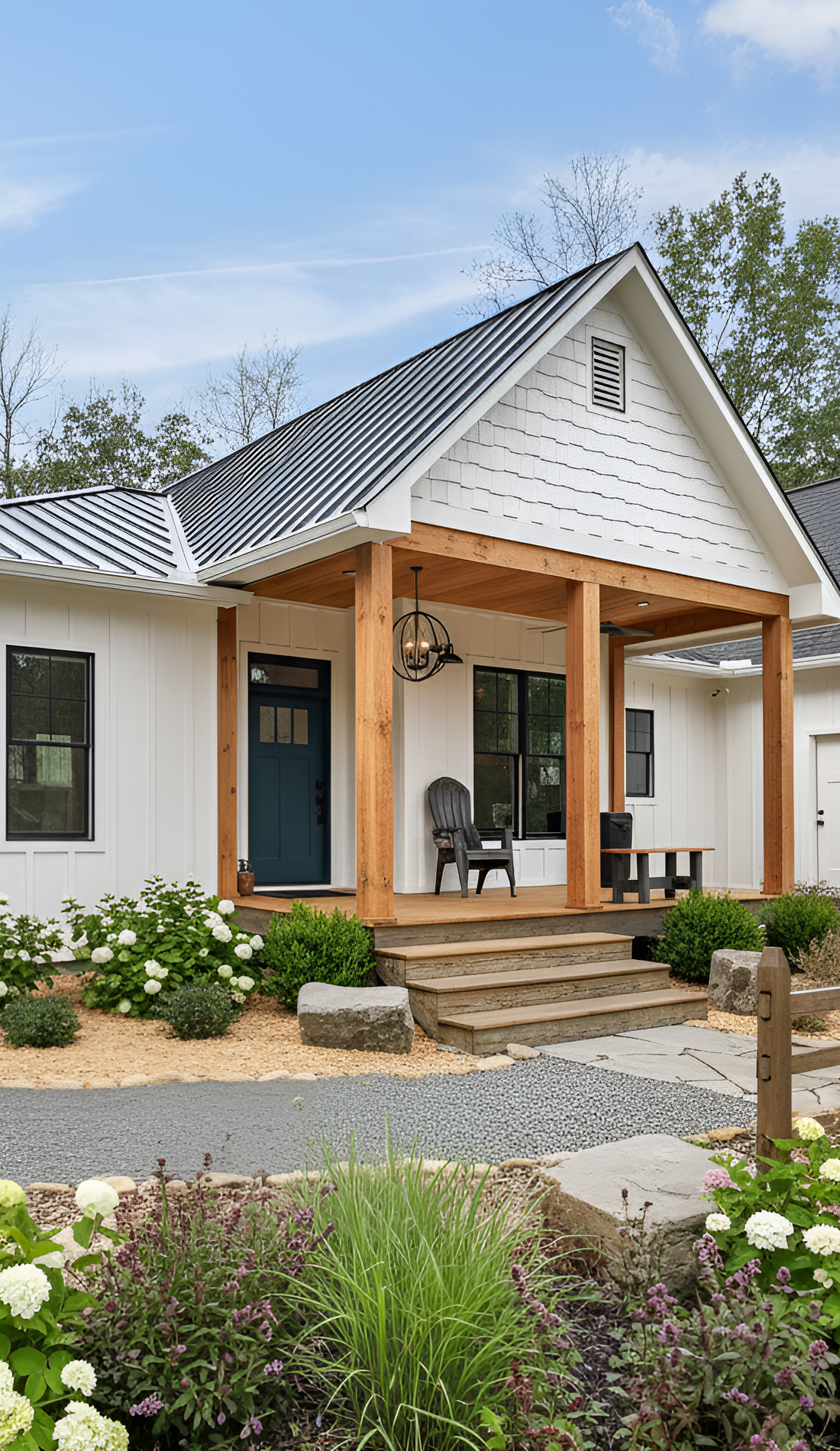 This look works best when the lines of the home are clean. A simple roofline, a welcoming porch, and uncluttered landscaping help the contrast shine. If the contrast feels too strong for your taste, soften it with wood elements. A stained front door, cedar posts, or warm planters can make the palette feel less stark.