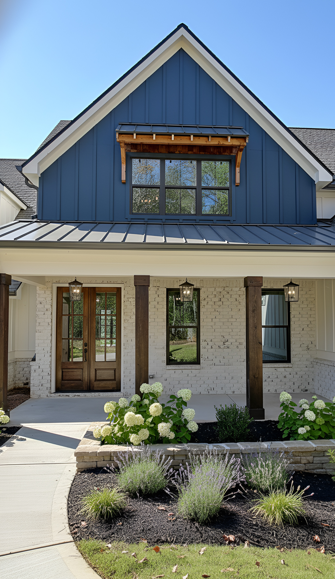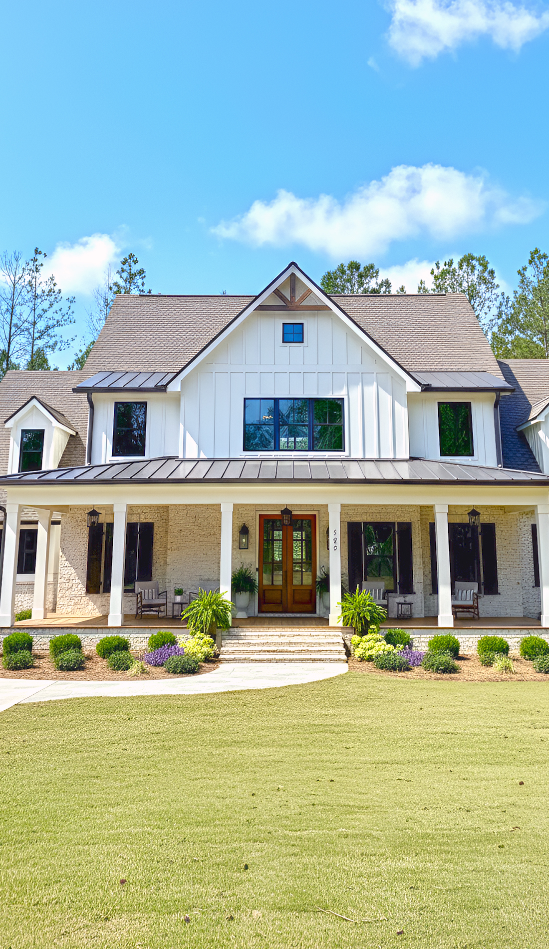 Nothing adds farmhouse character quite like a metal roof accent. It can sit above the porch, over a bay window, or across a small entry roof. That simple detail adds instant charm.