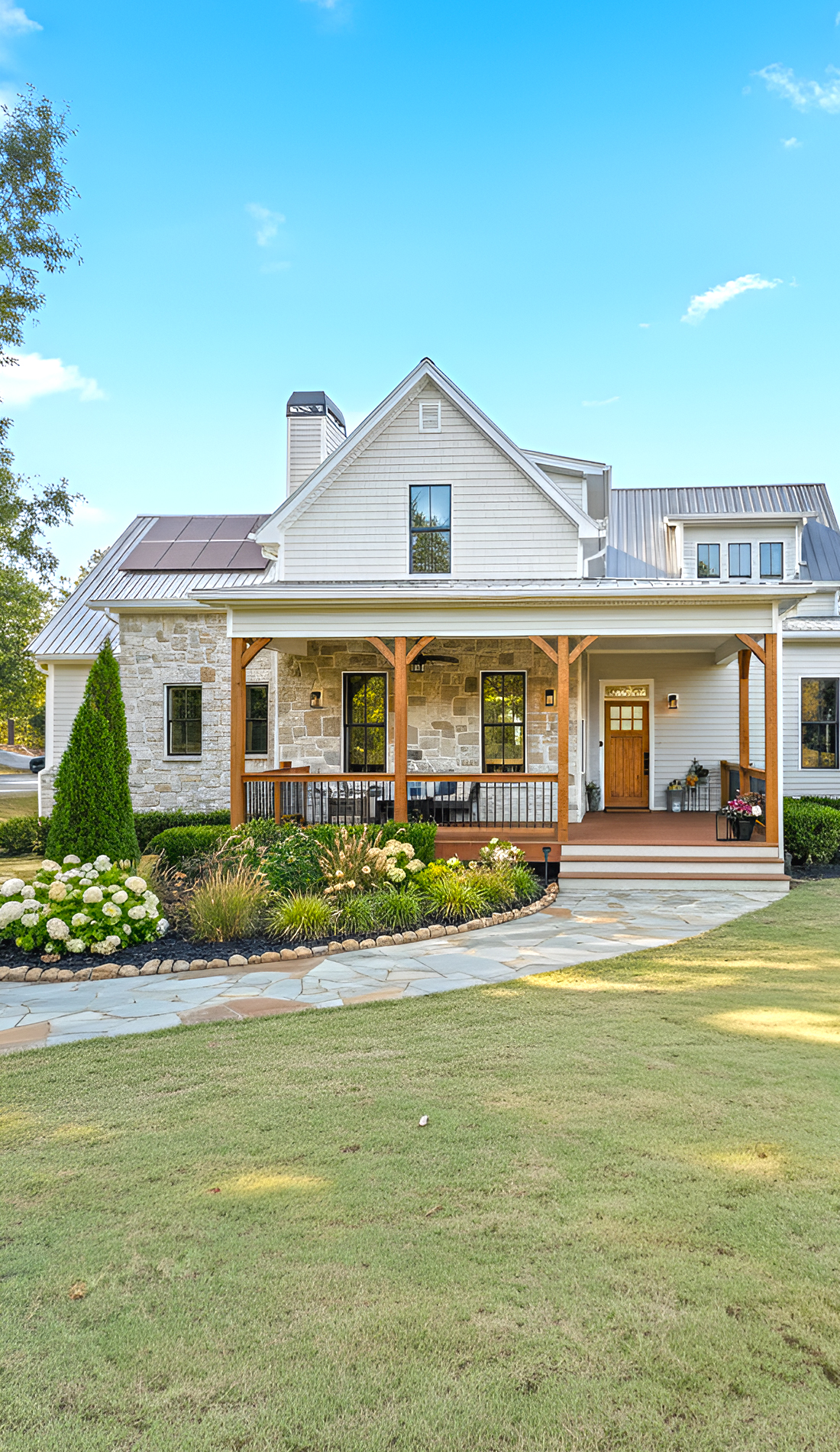 Farmhouse landscaping tends to look natural but tidy. Boxwoods, hydrangeas, ornamental grasses, lavender, white roses, and native shrubs all work well. The goal is not to make the yard look formal. It is to frame the house in a soft and easy way.