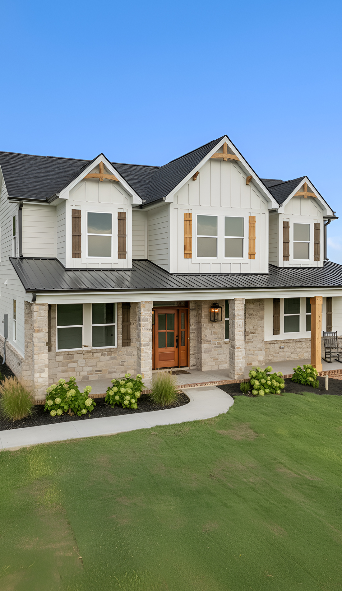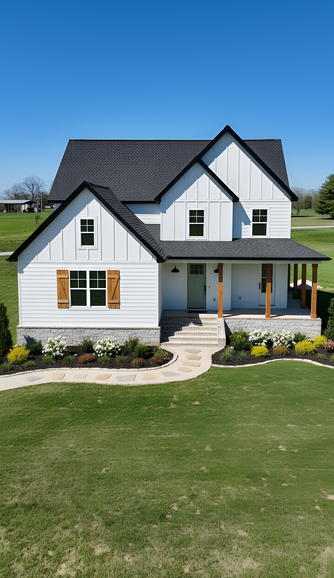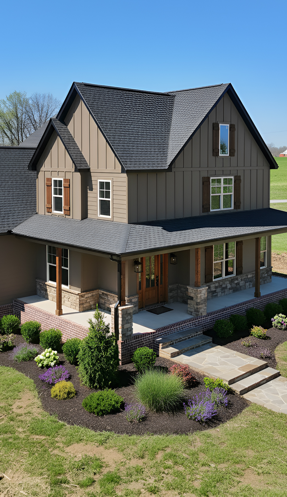 This palette works well for farmhouse homes that want a modern touch without looking cold. It is also a smart choice if your roof is gray, your stone has mixed warm and cool tones, or your landscaping changes a lot through the seasons.