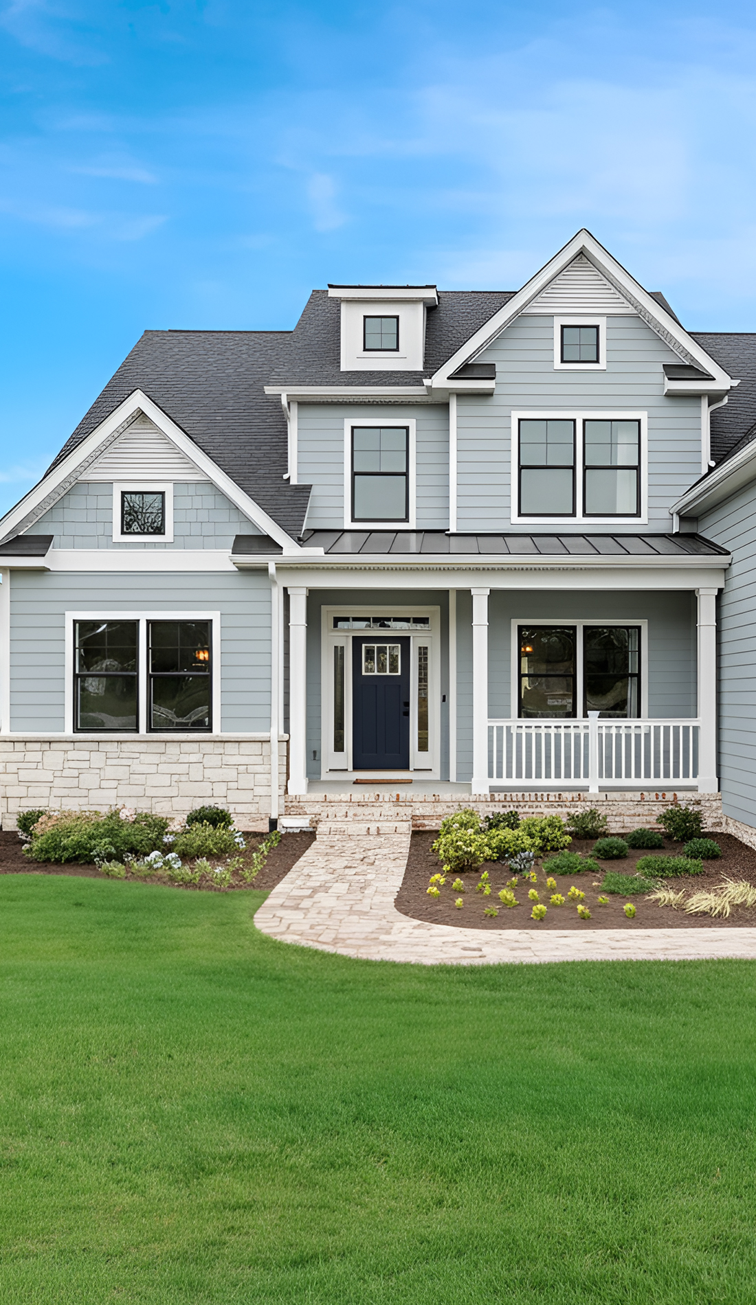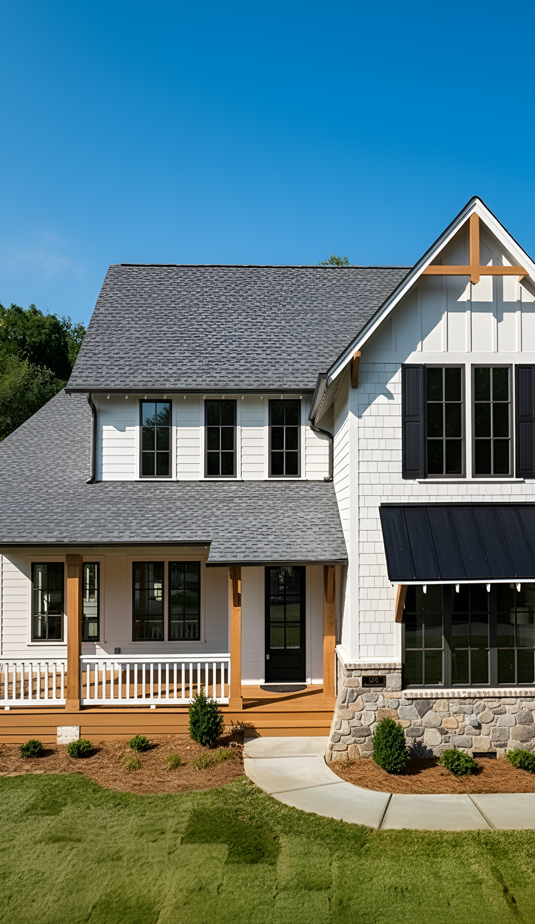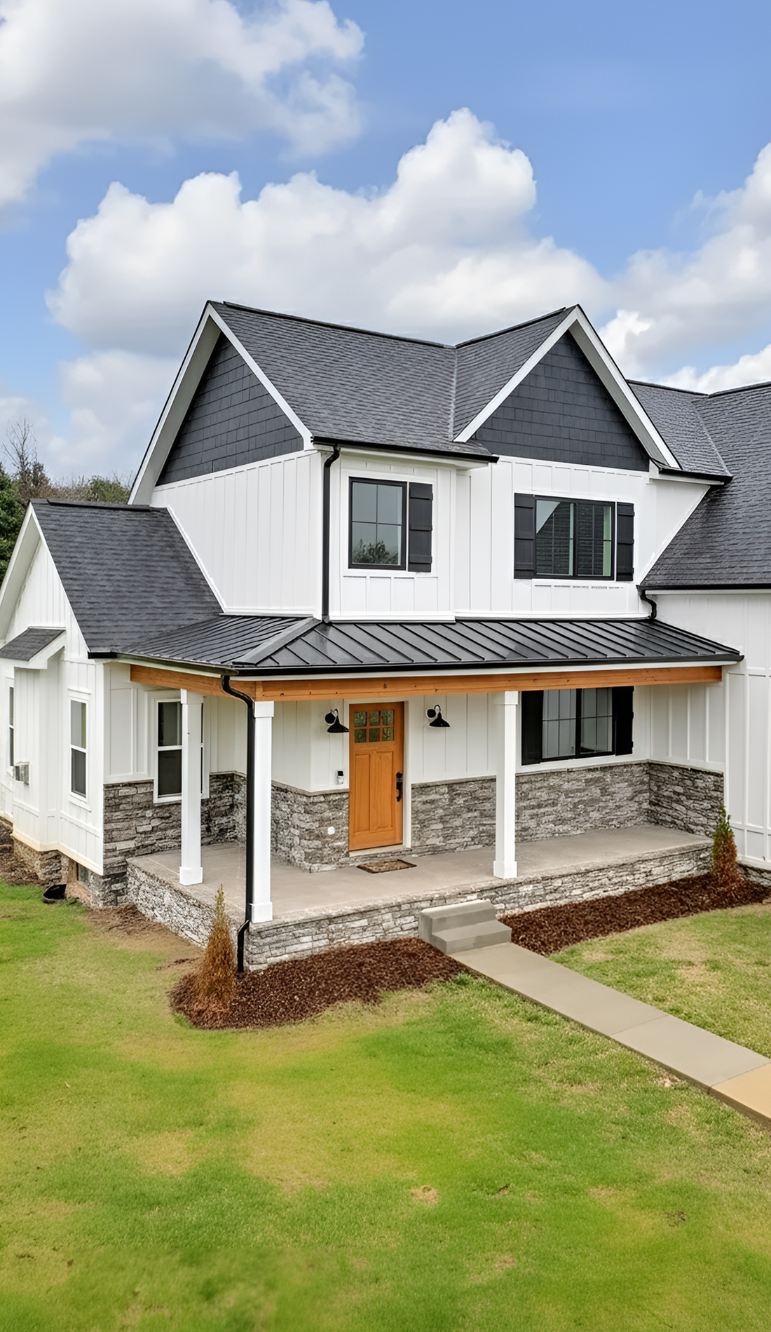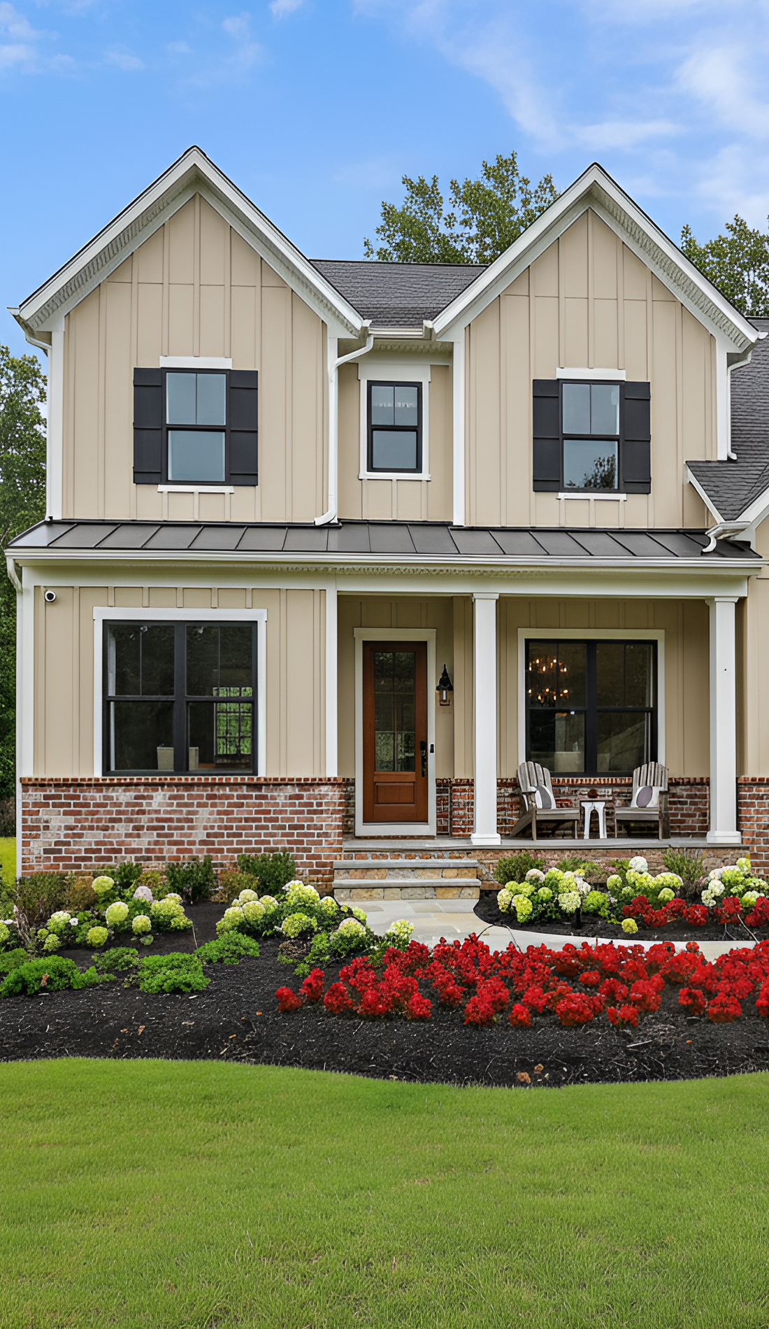 This palette works well for farmhouse homes that want a modern touch without looking cold. It is also a smart choice if your roof is gray, your stone has mixed warm and cool tones, or your landscaping changes a lot through the seasons.