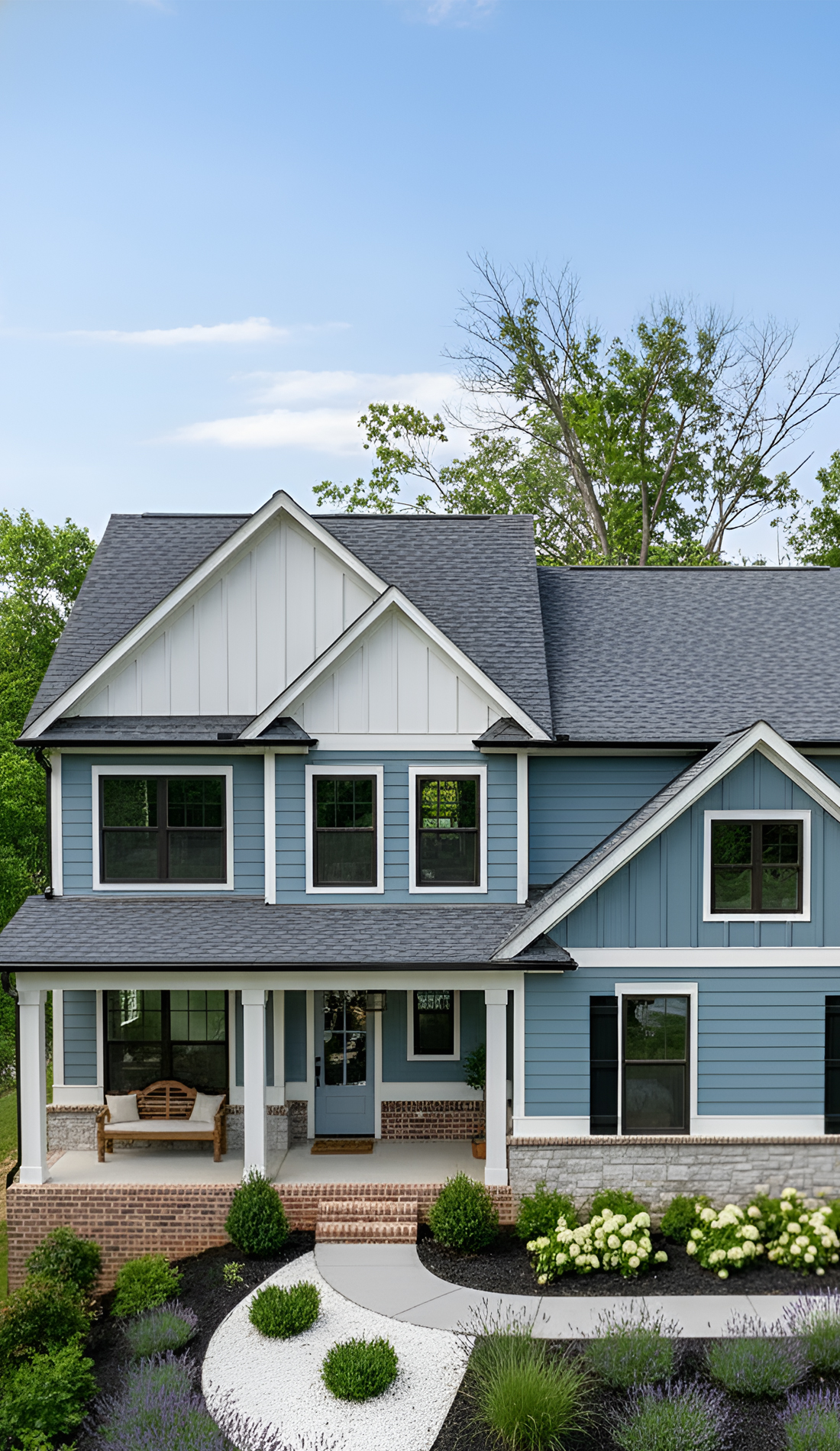 This palette feels especially lovely on farmhouse cottages, small country homes, and homes with lots of porch charm. It also works well near open fields, water, or coastal-inspired landscapes.