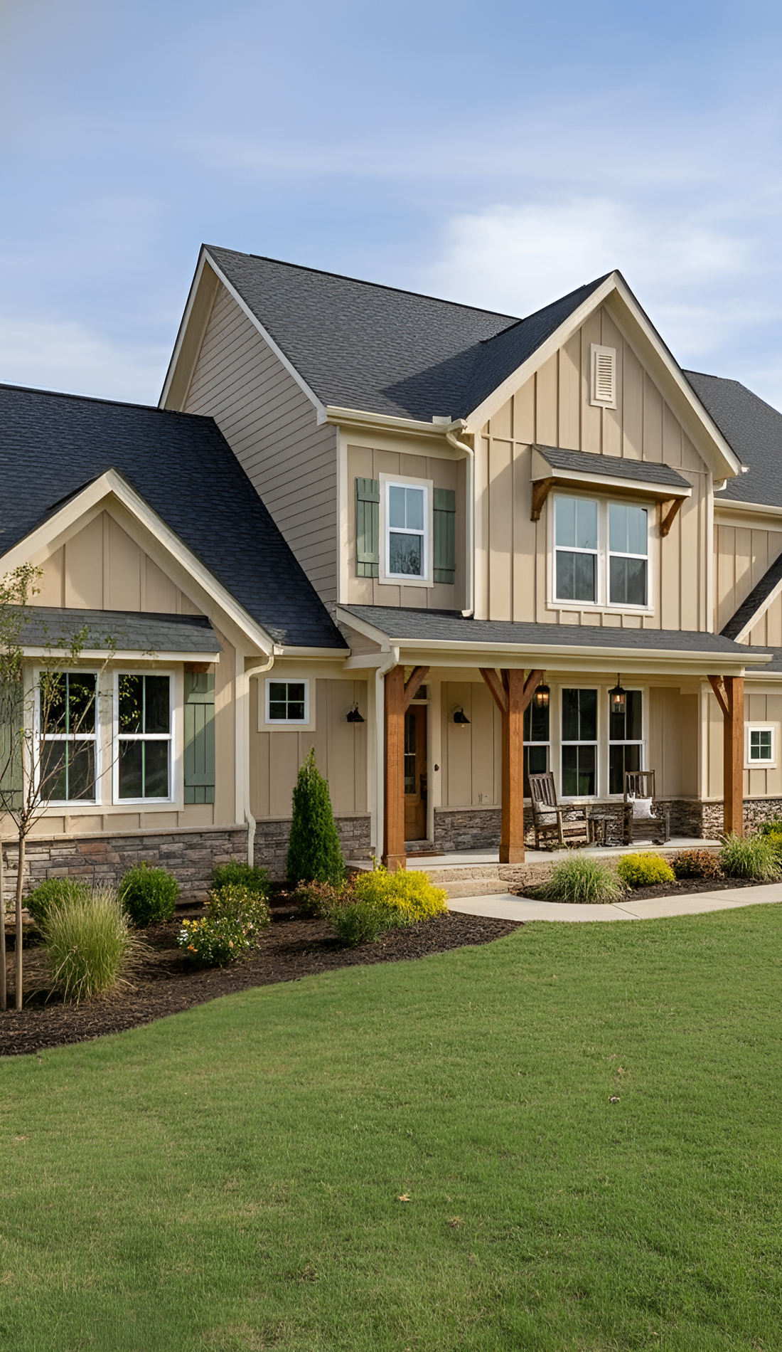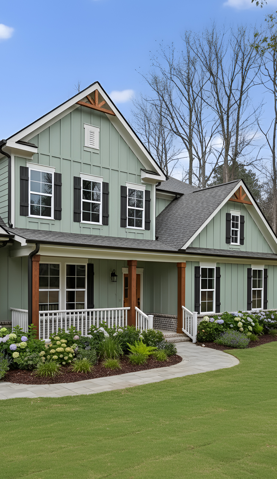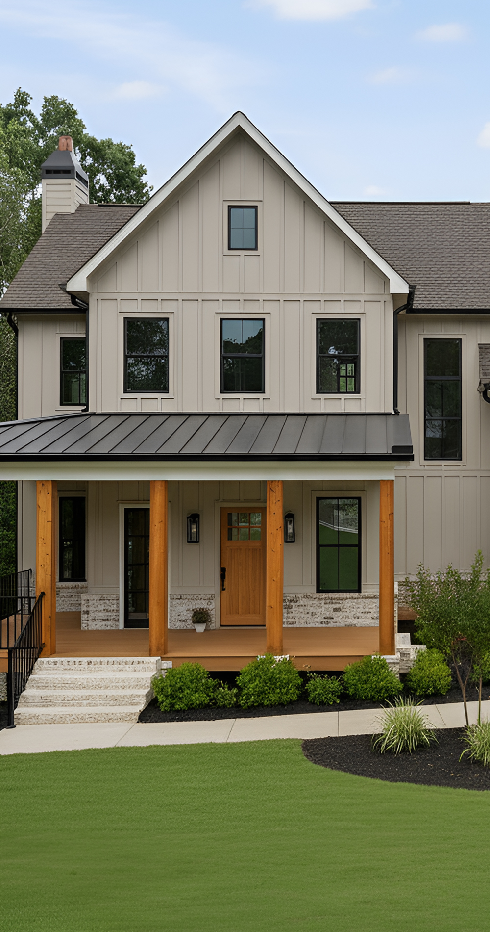 This palette works especially well on homes with gabled roofs, board and batten siding, deep porches, and symmetrical windows. It also pairs beautifully with natural wood front doors, black lantern lights, and simple landscaping.