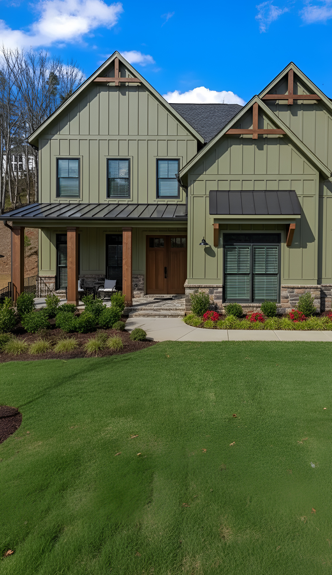 Olive green gives a farmhouse exterior a deeper, moodier earthy feel. It is richer than sage, so it creates more presence. Cream trim keeps it soft and helps the look stay warm rather than too dark.