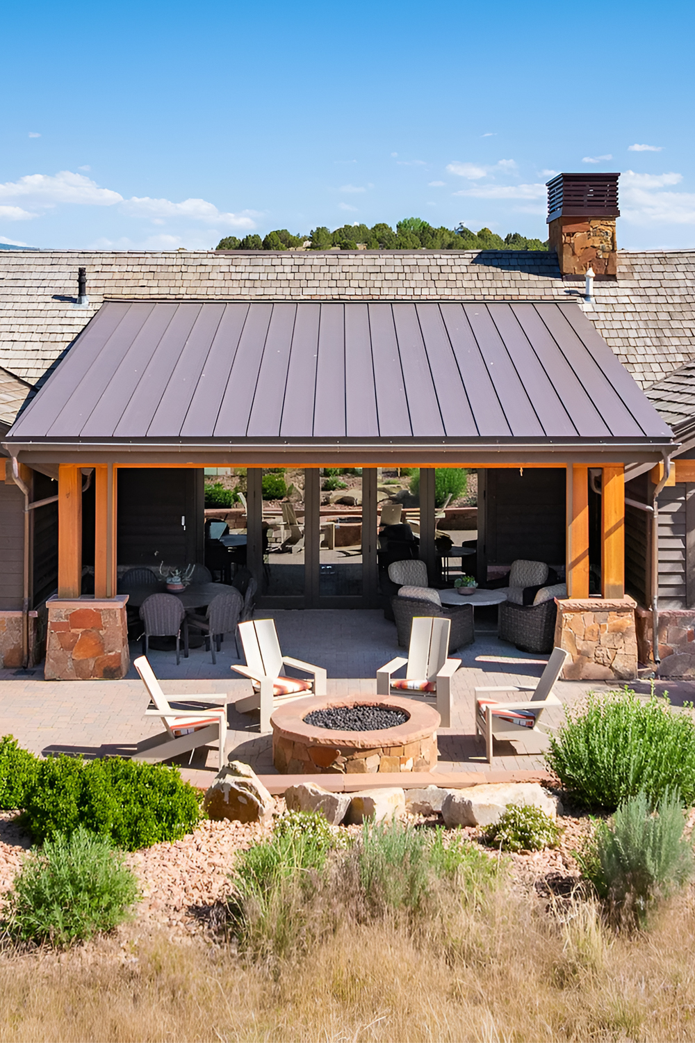 Use wood posts, metal roofing, and a stone base. Keep it simple. The structure should look like it grew out of the home.