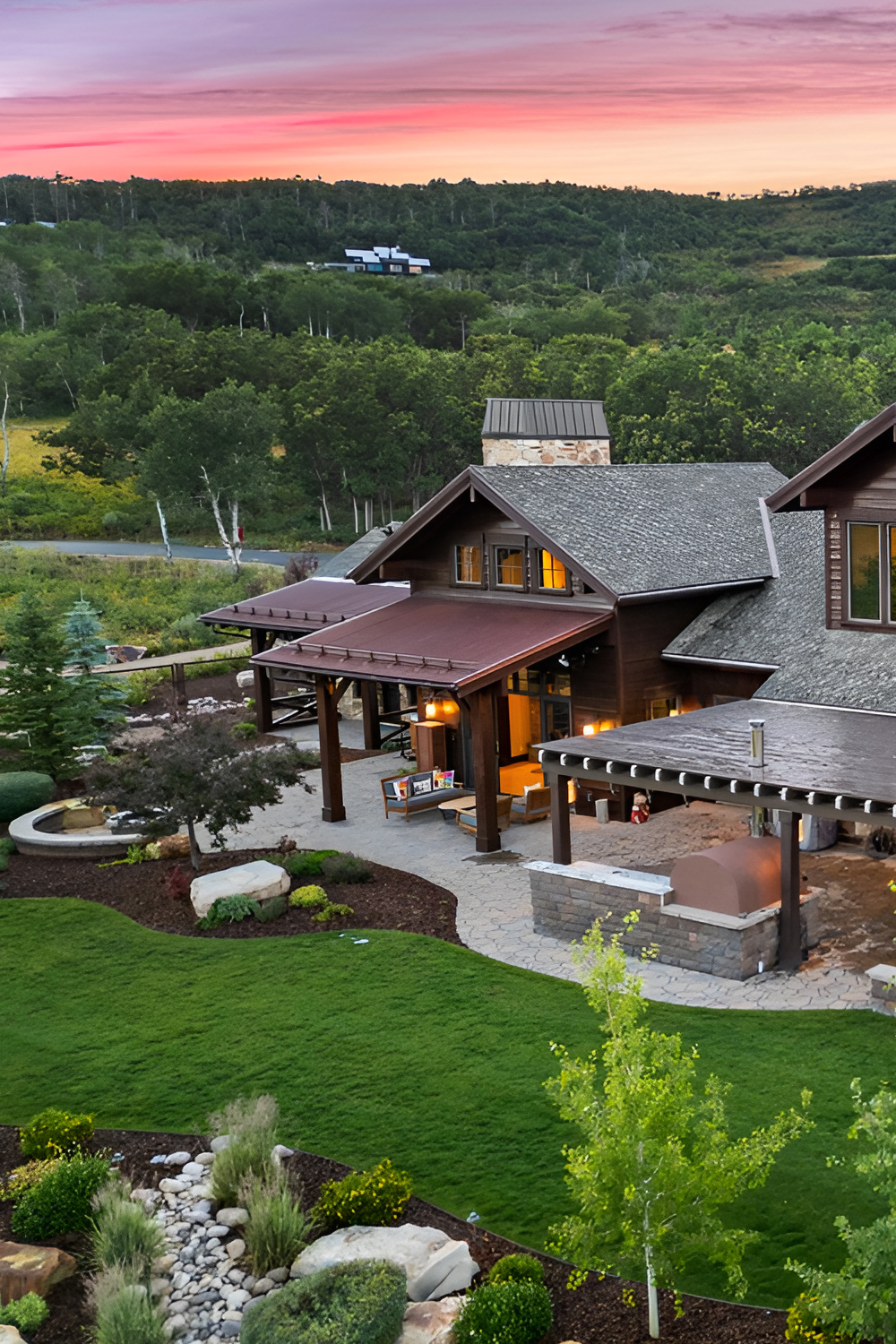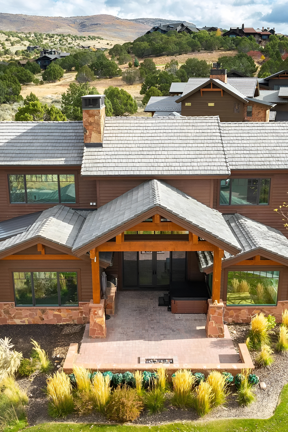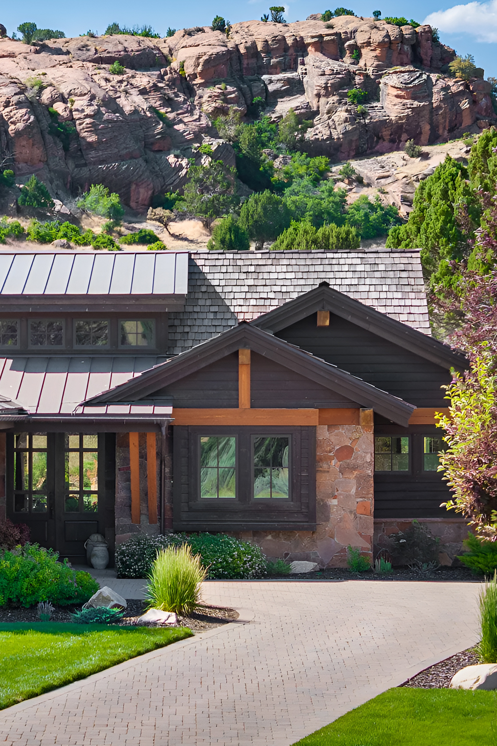 For a mountain look, avoid bright red brick pavers. They can fight the natural palette.