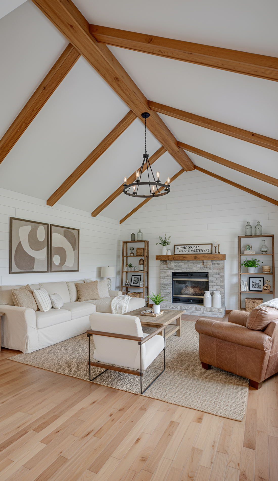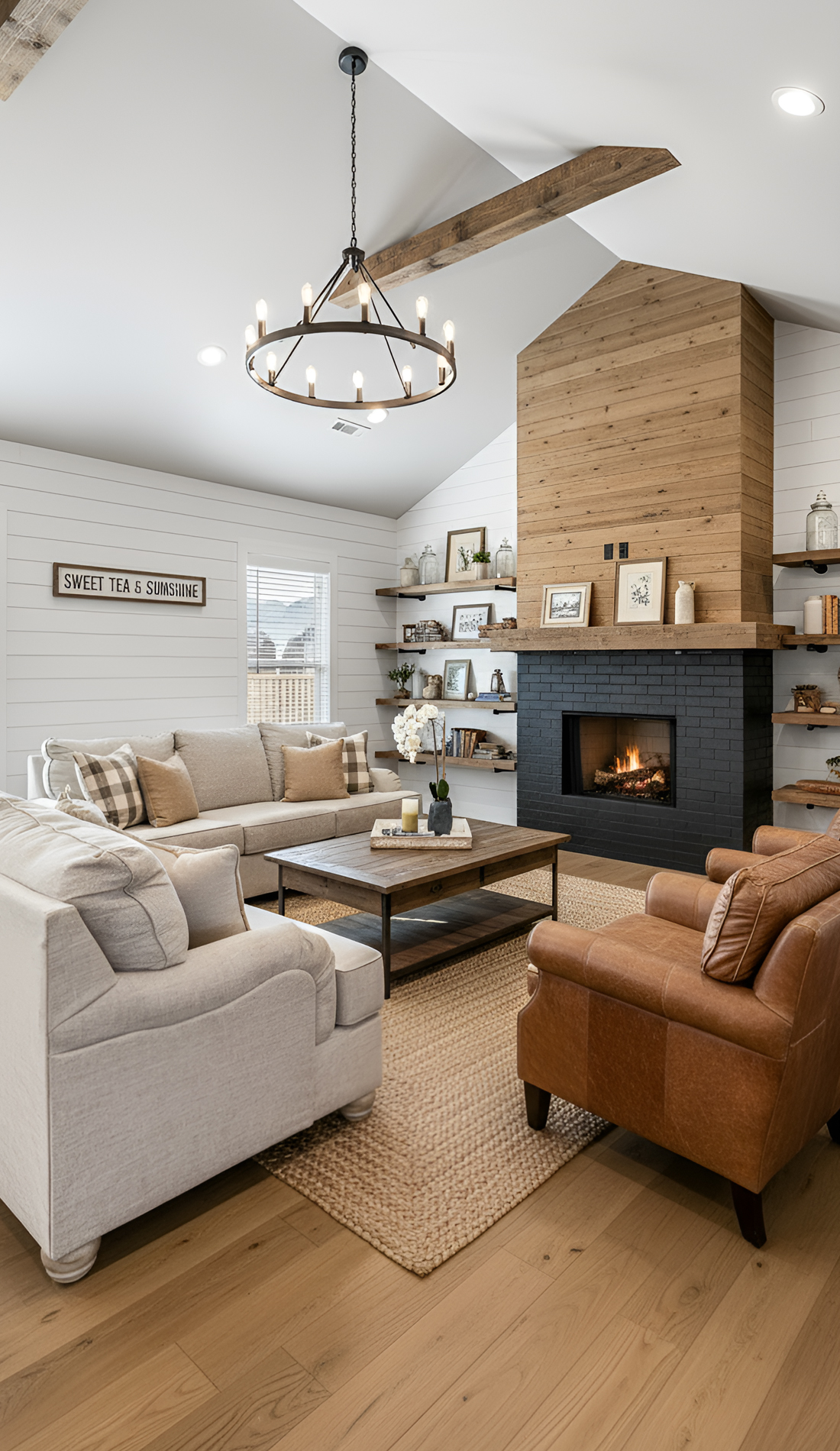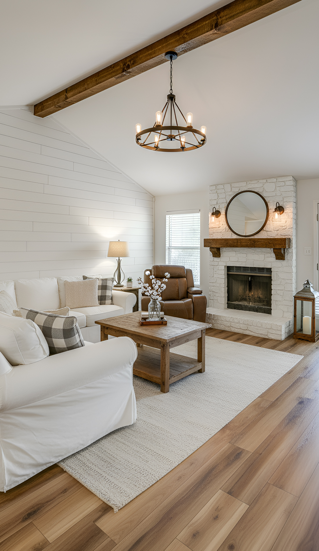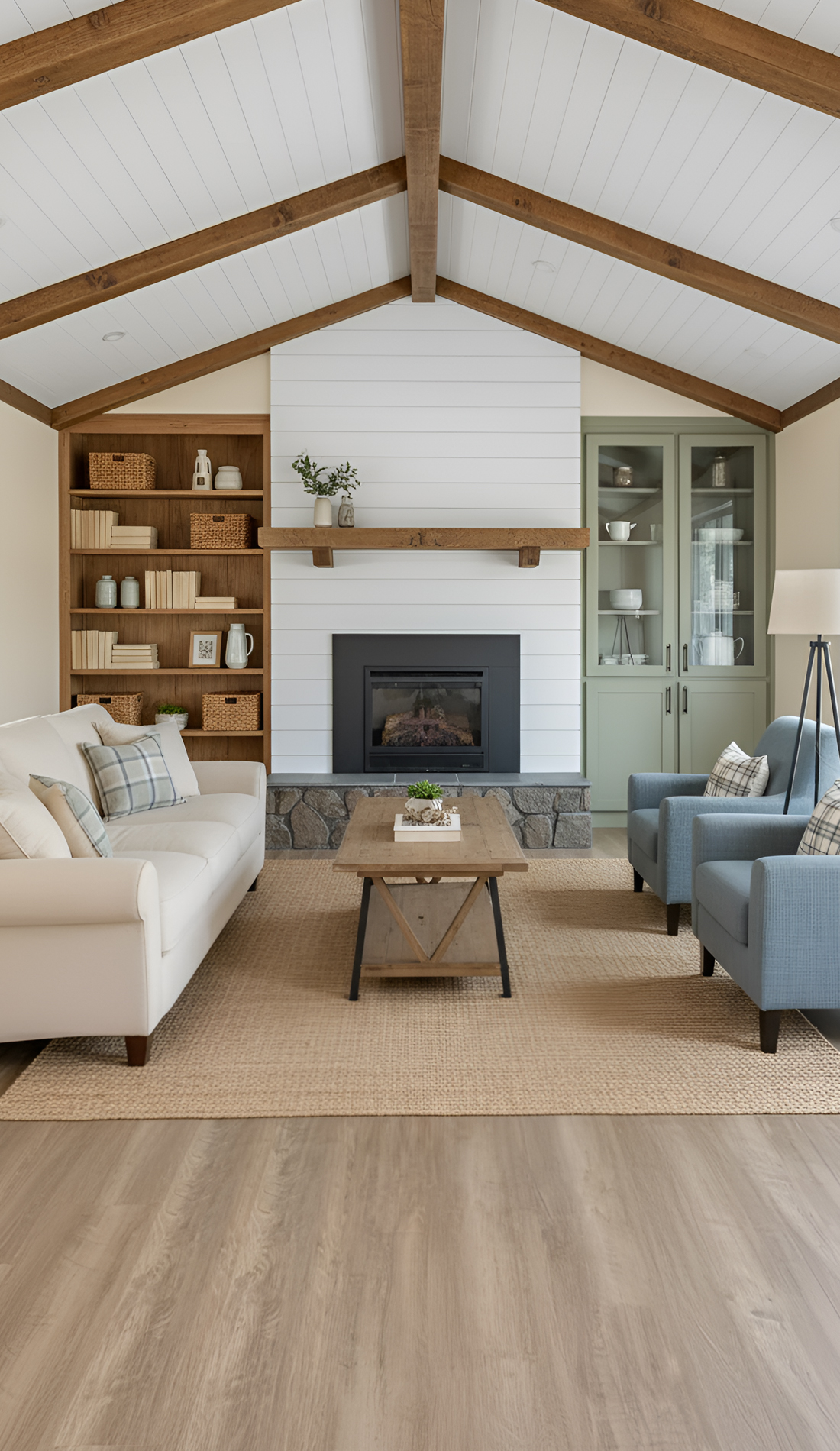 You do not need to cover the whole room. In fact, one shiplap accent wall can be enough. Use it behind the fireplace, around built-ins, or on the main wall behind the sofa. Painted white or soft cream, it adds quiet interest while keeping the room bright.