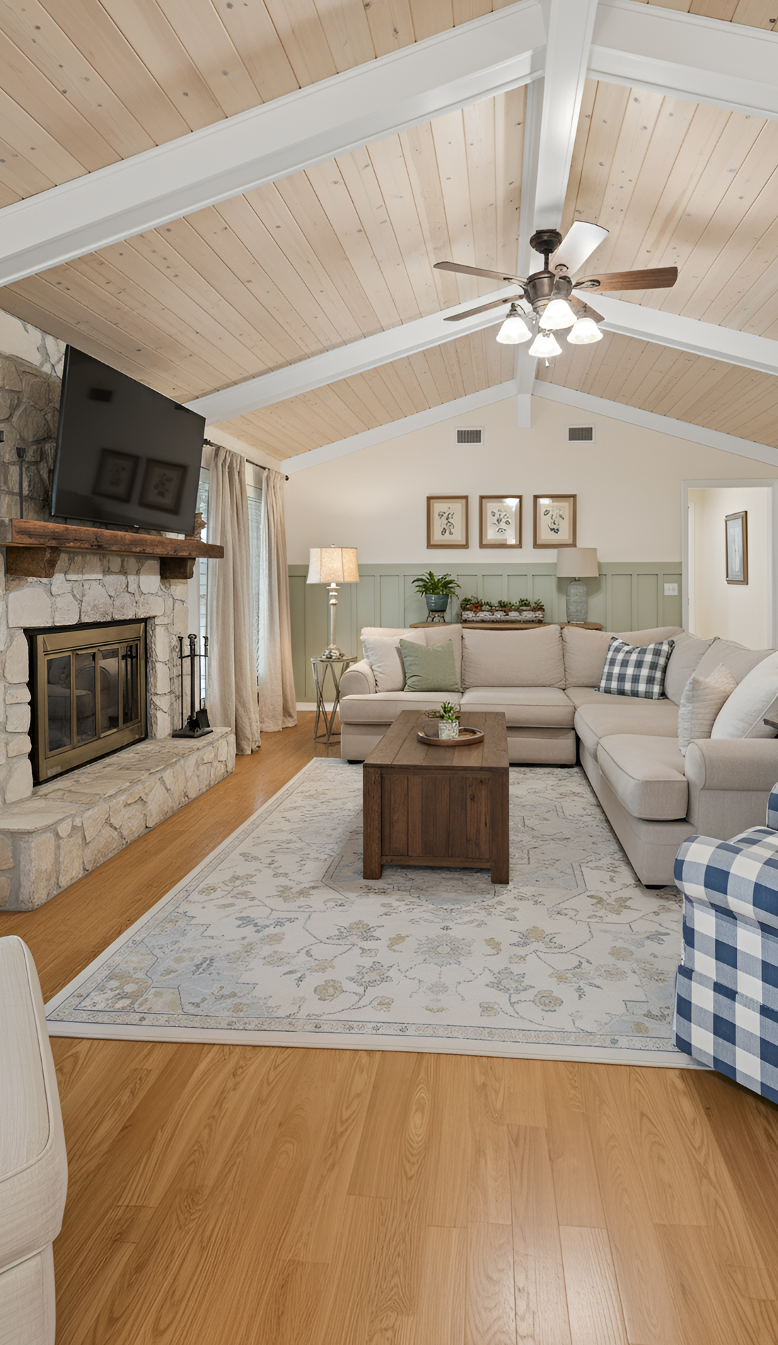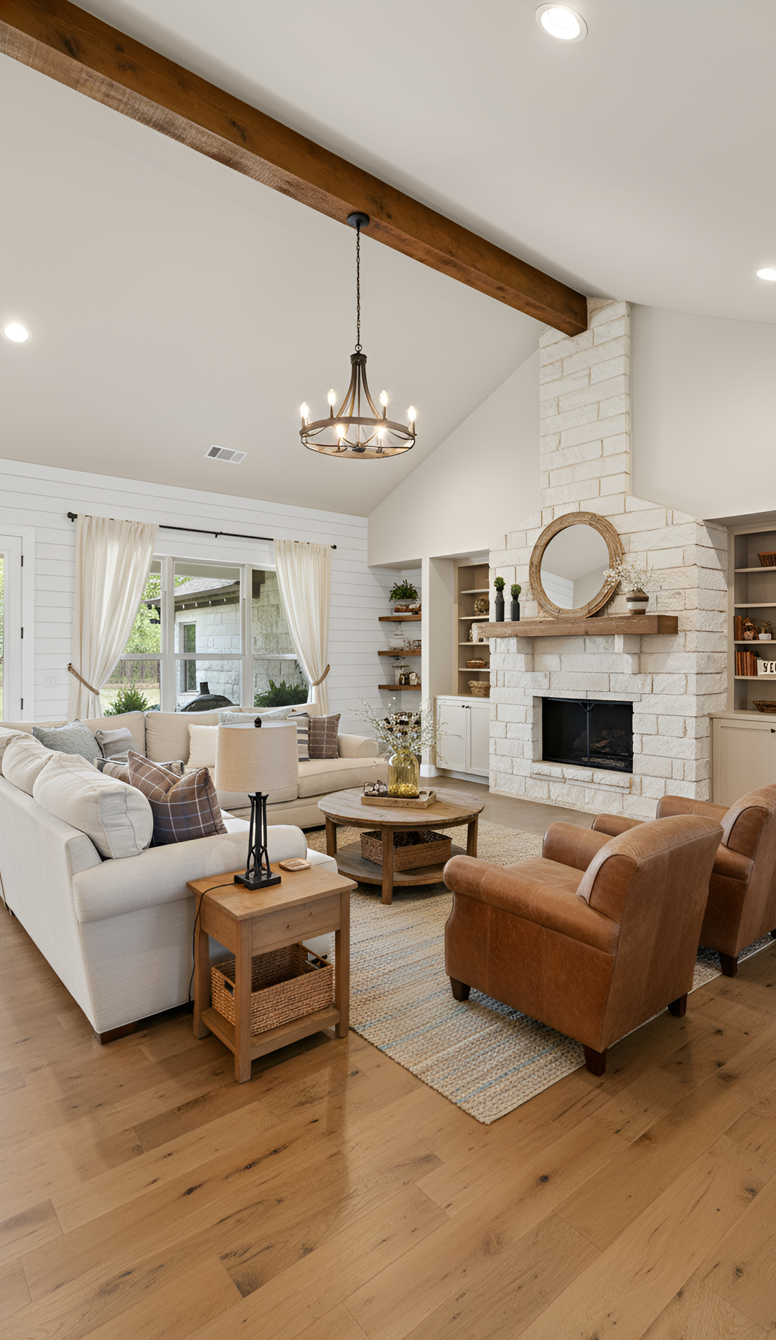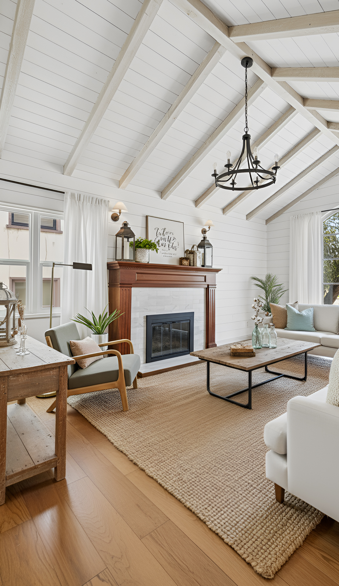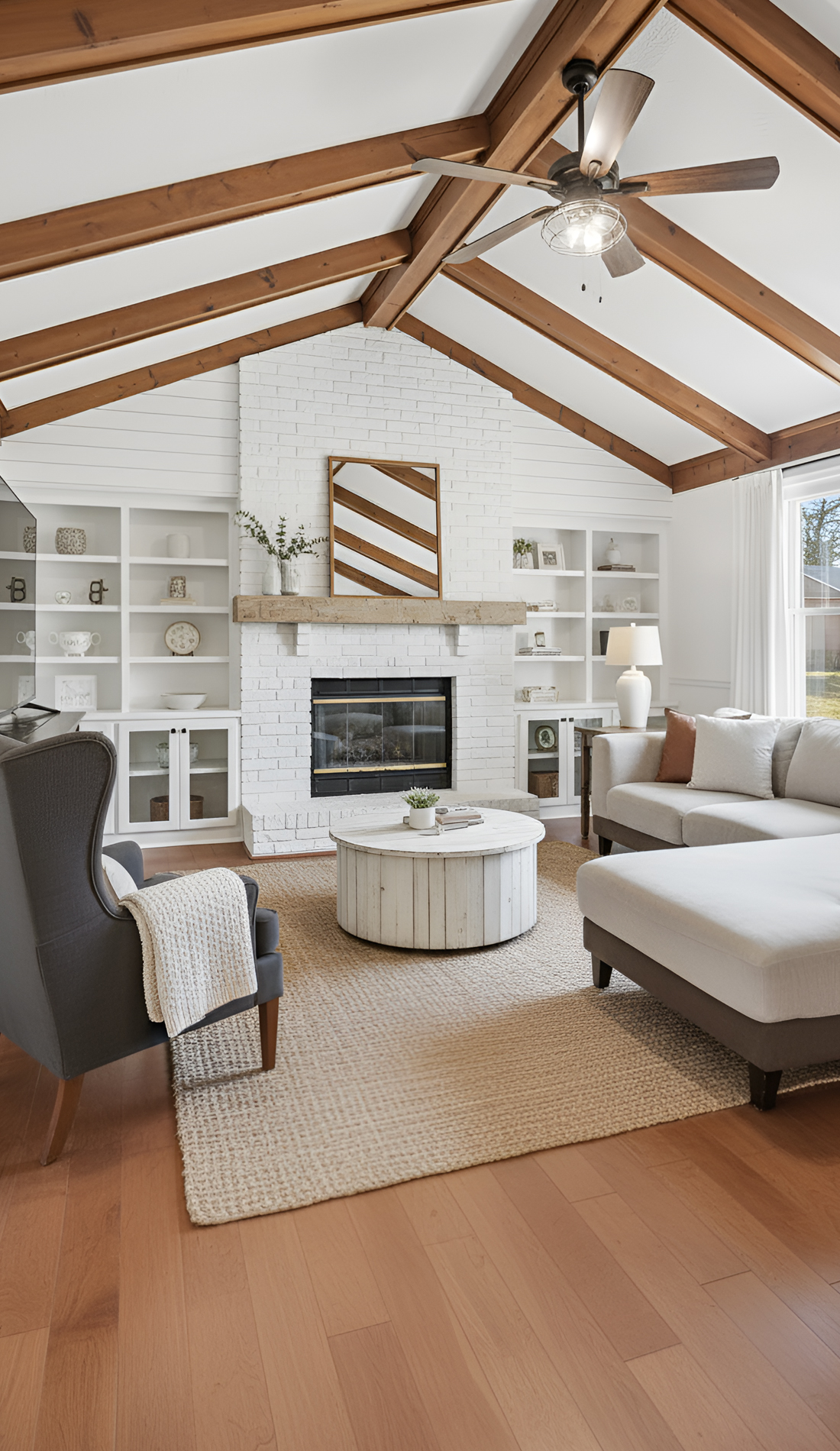 You do not need to cover the whole room. In fact, one shiplap accent wall can be enough. Use it behind the fireplace, around built-ins, or on the main wall behind the sofa. Painted white or soft cream, it adds quiet interest while keeping the room bright.