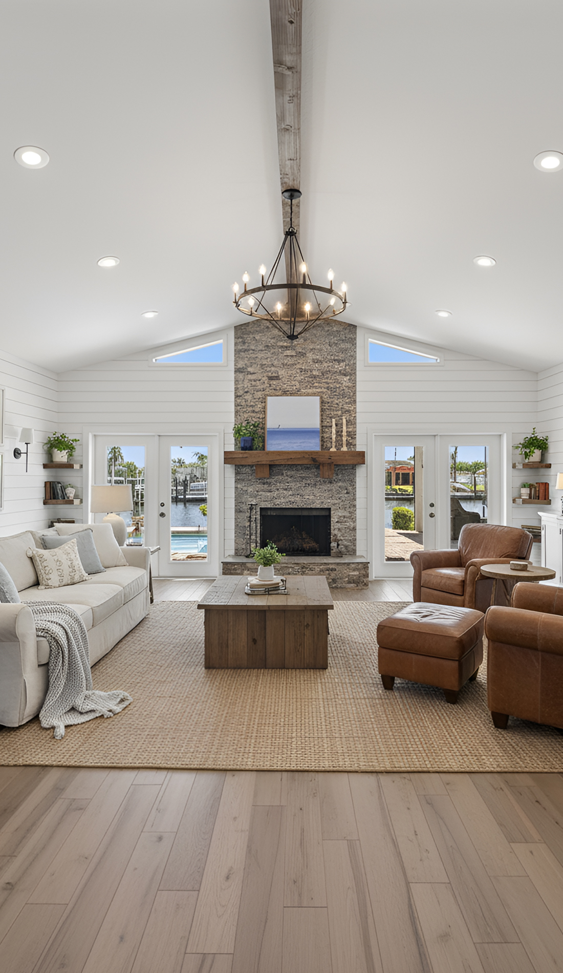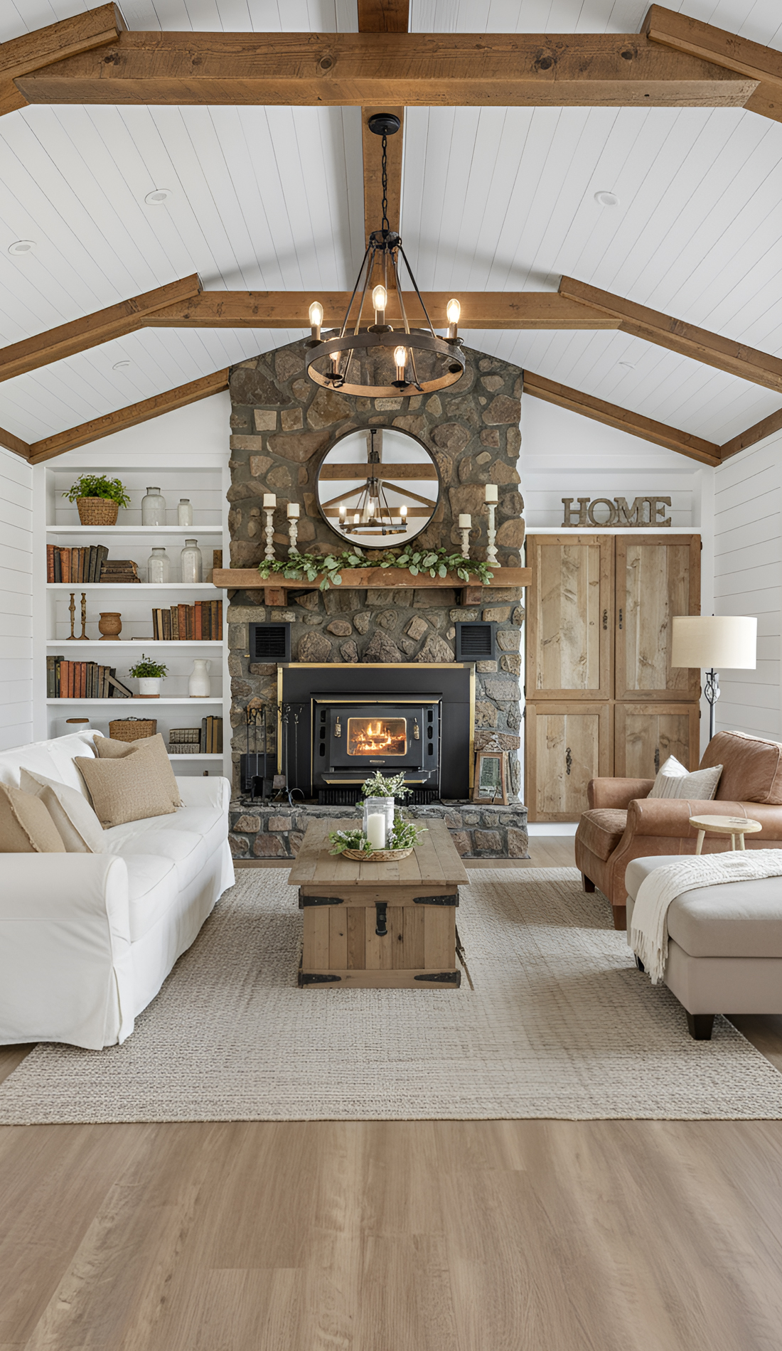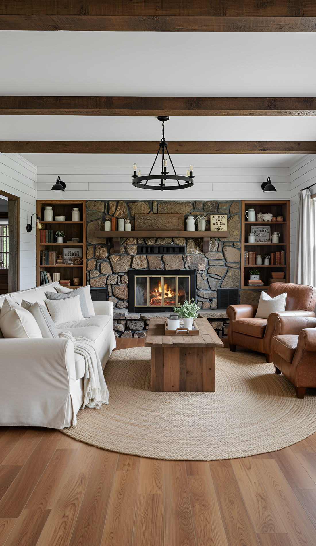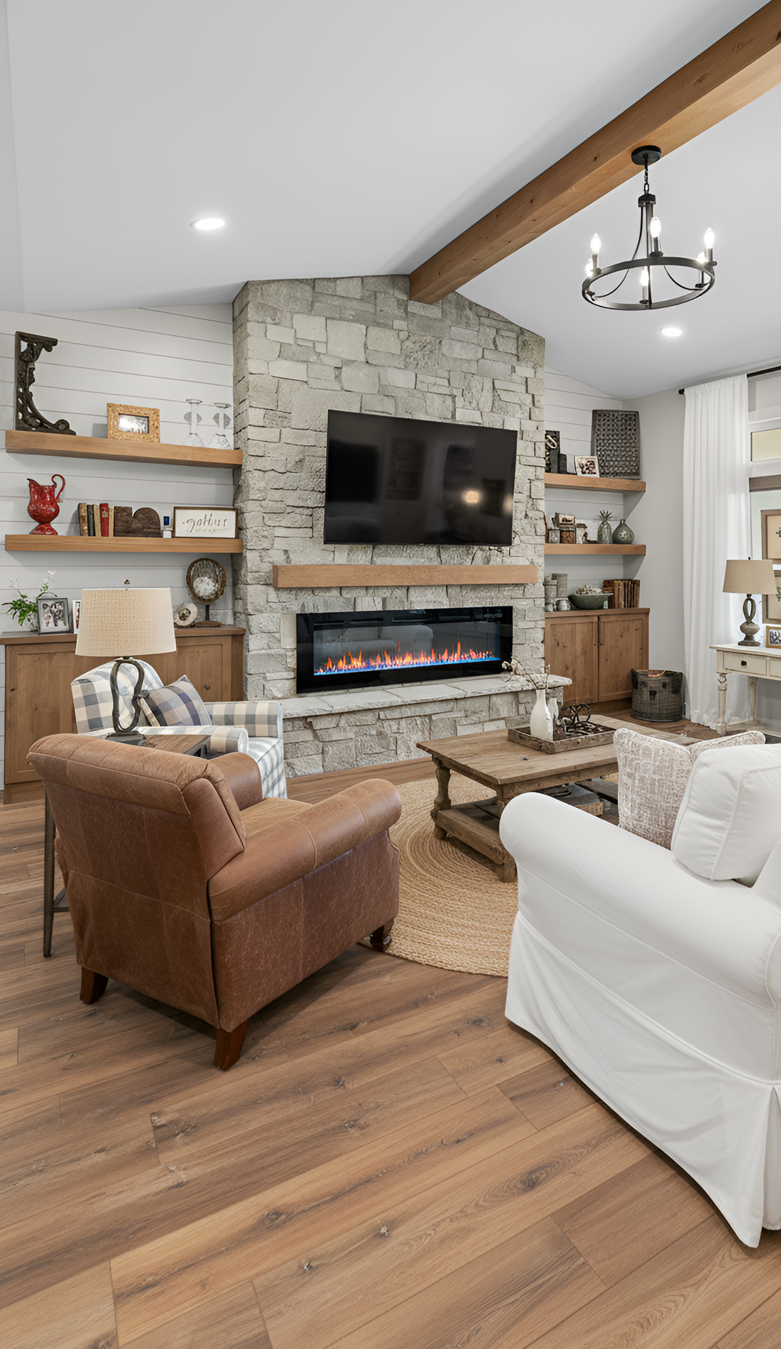 You do not need to cover the whole room. In fact, one shiplap accent wall can be enough. Use it behind the fireplace, around built-ins, or on the main wall behind the sofa. Painted white or soft cream, it adds quiet interest while keeping the room bright.