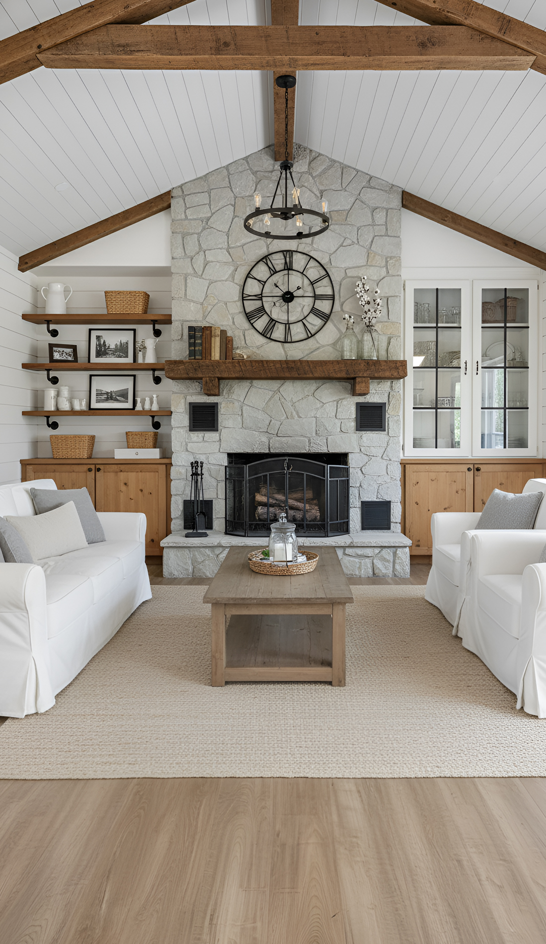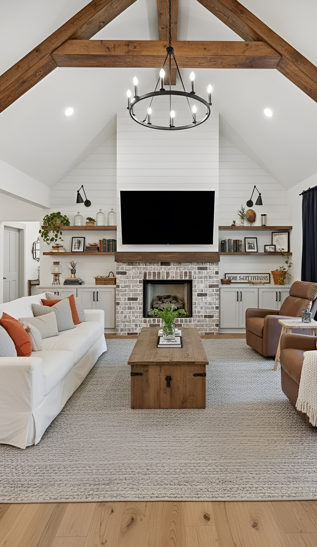 Open shelves can look beautiful in a farmhouse living room, but they need a light hand. If you add too much, the room starts to feel cluttered. If you keep them simple, they add charm and ease.