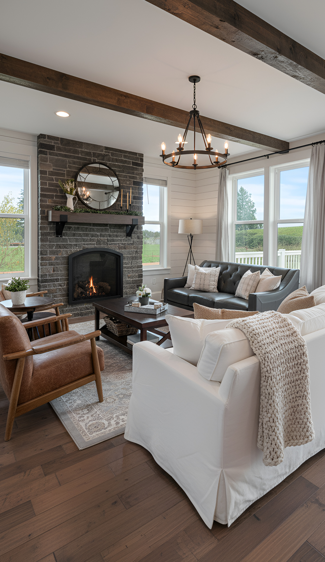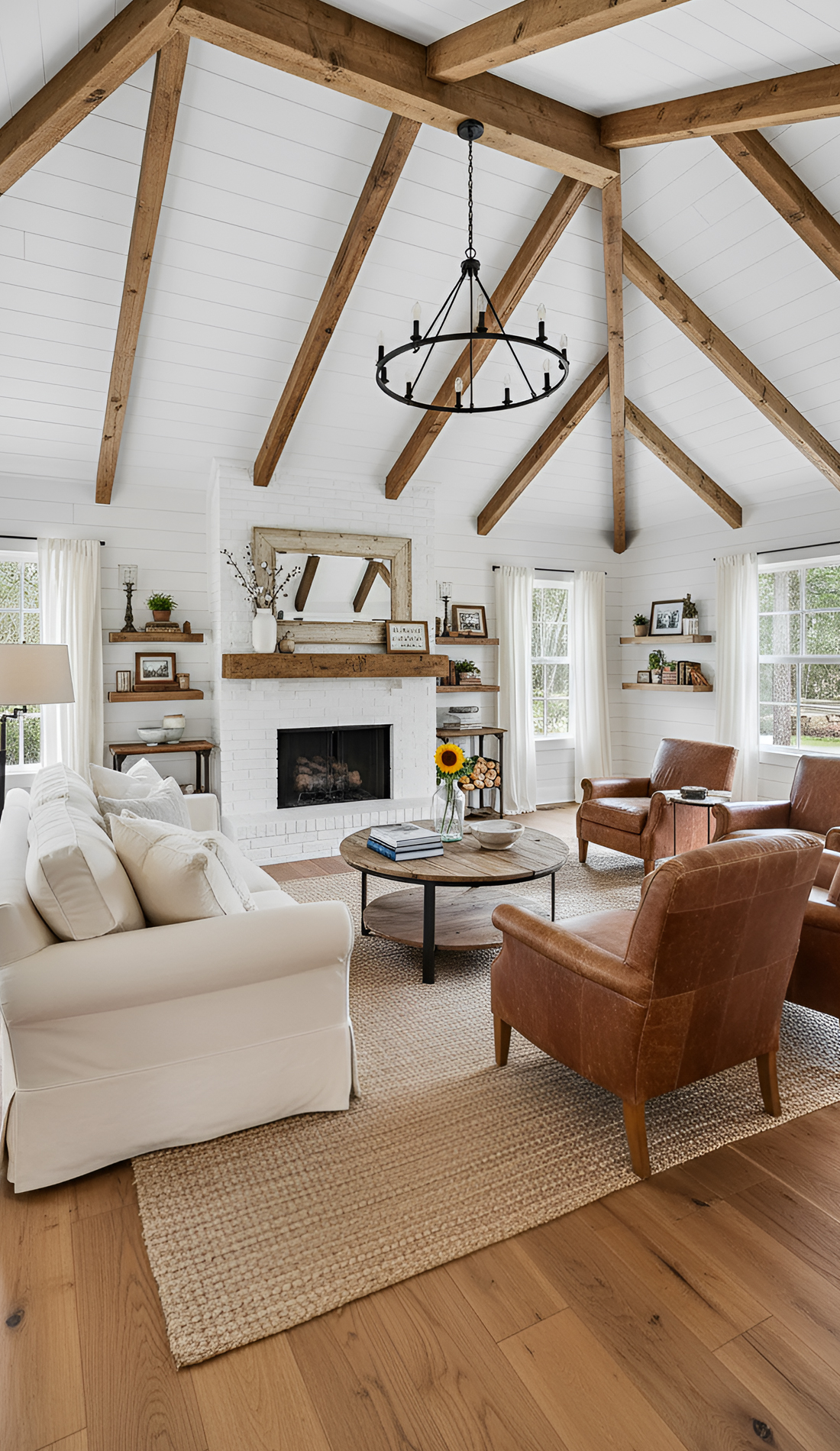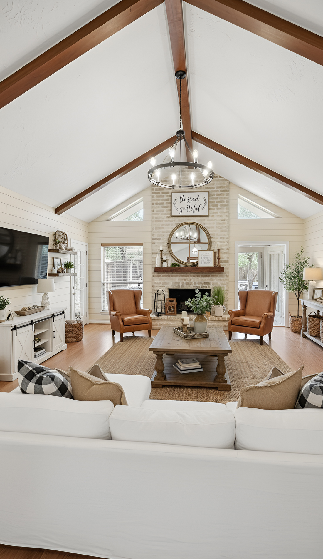 The cue is gathering. A farmhouse living room should feel like a place where people naturally come together.