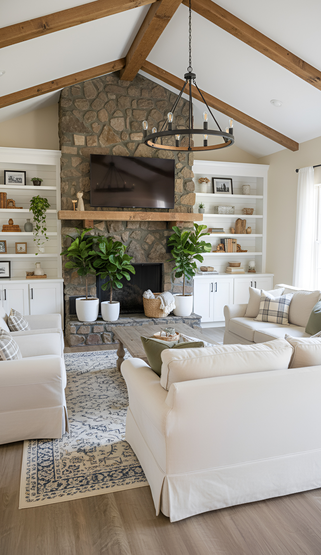 Built-ins are a smart addition in a farmhouse living room because they combine storage and style. They help the room feel custom, and they give you a place to display meaningful pieces without creating clutter.