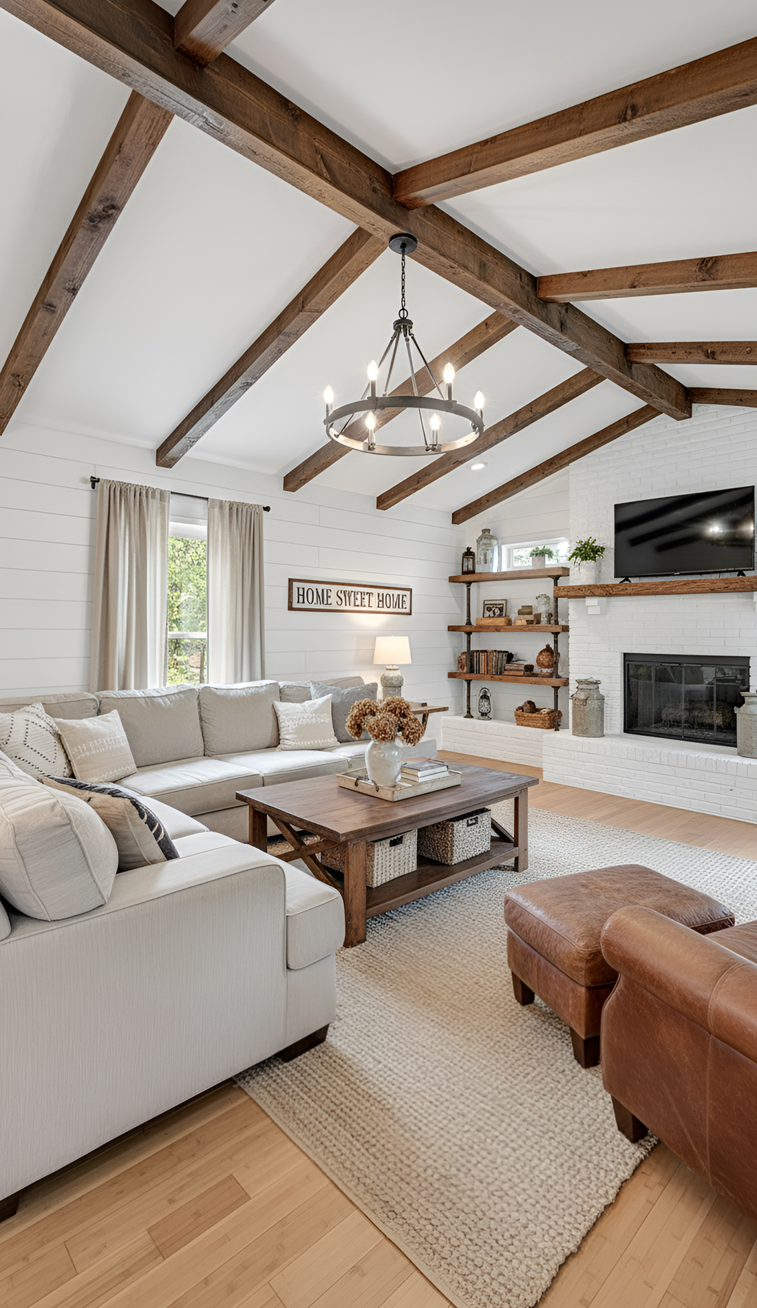 Exposed beams bring farmhouse charm to a living room in a big way. They add architecture, contrast, and warmth to the ceiling, which helps the room feel more complete.