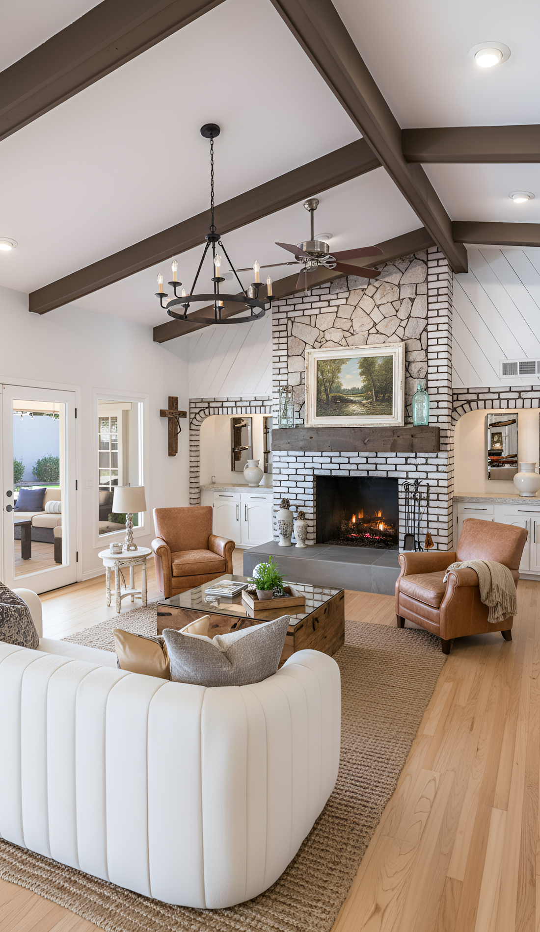 Try pairing a new sofa with a vintage trunk as a coffee table. Add old wooden frames, an antique crock, or a distressed cabinet beside a modern lamp. This mix keeps the room feeling warm and collected instead of showroom-perfect.
