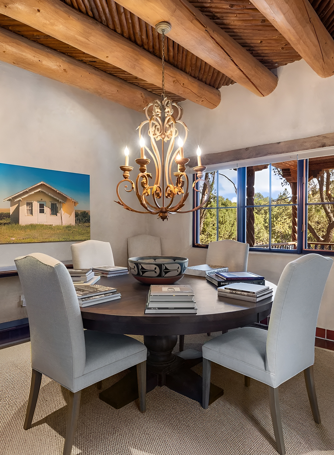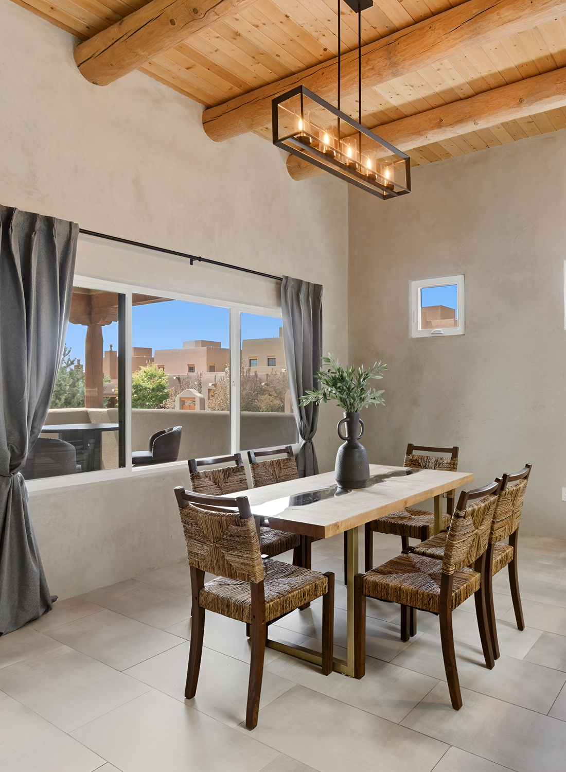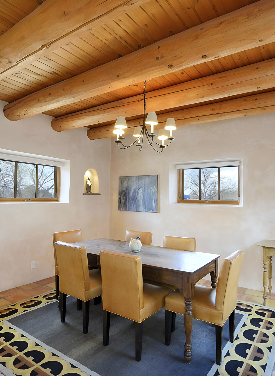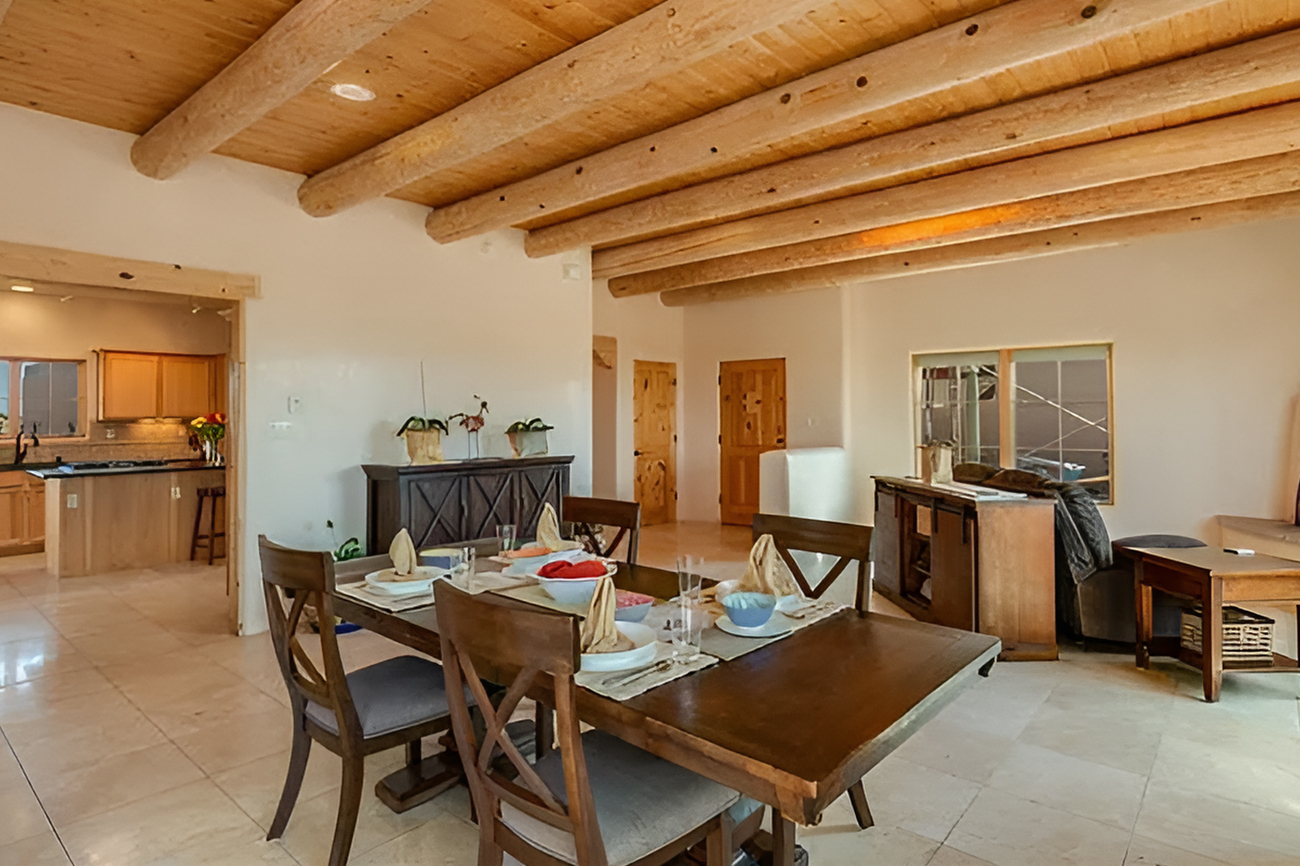 This dining room feels warm, simple, and deeply grounded. The first thing that stands out is the ceiling. Thick round log beams bring instant Santa Fe character. They frame the whole room and make the space feel old-world in the best way. Then your eye moves down to the soft plaster walls, which add that classic adobe look.