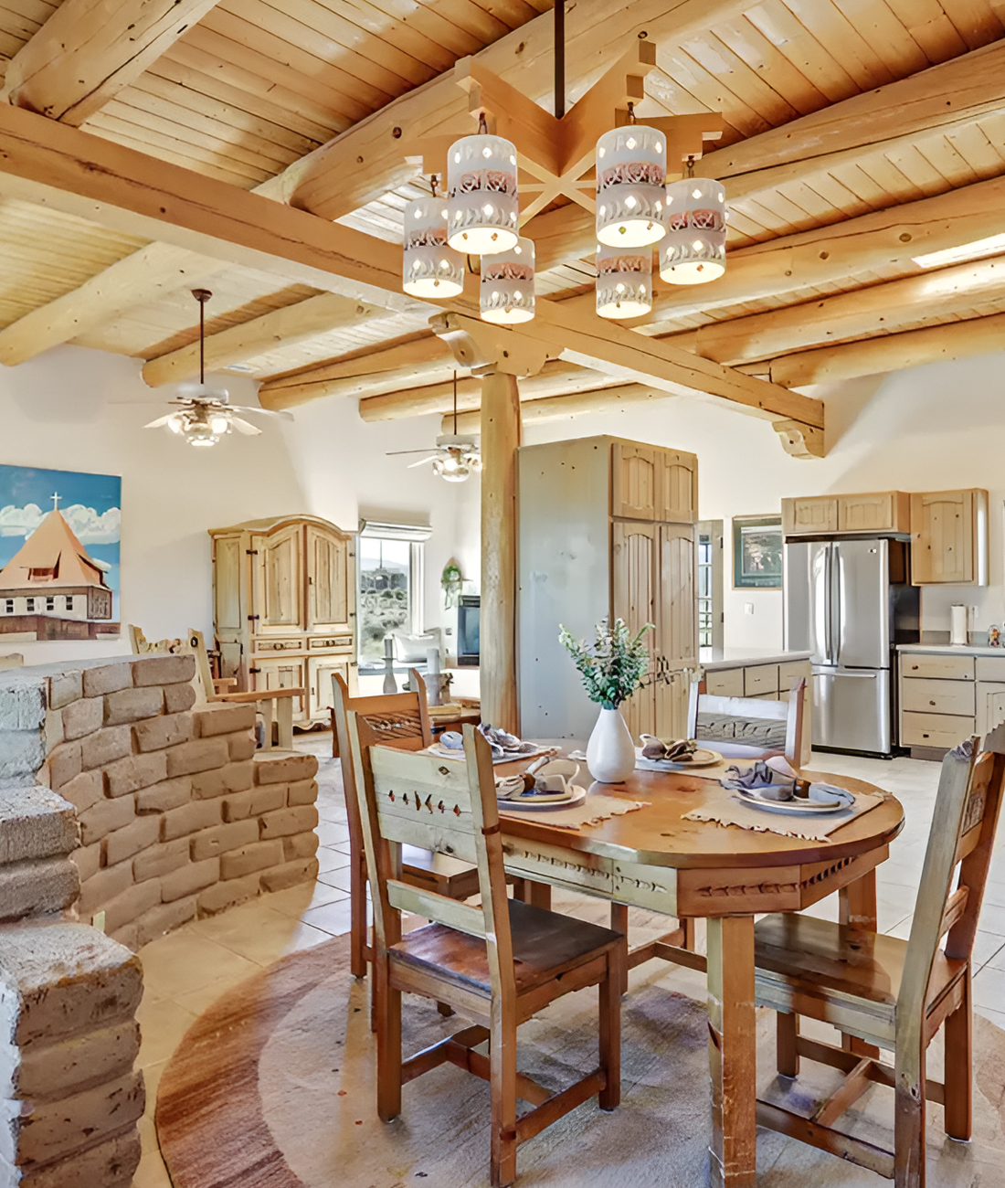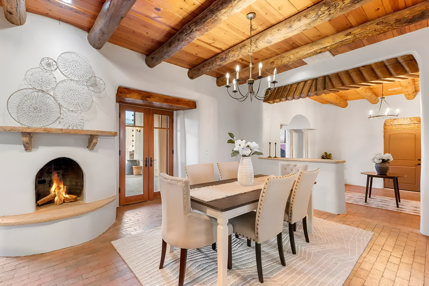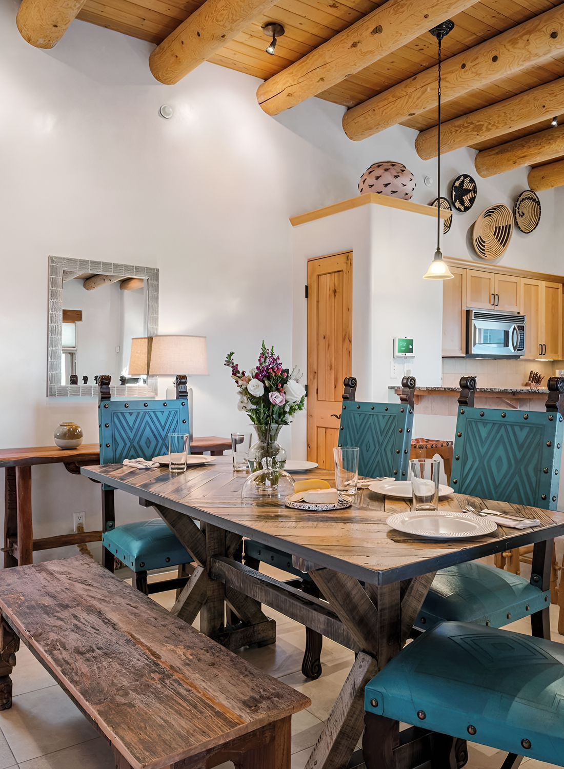 This dining room feels warm, simple, and deeply grounded. The first thing that stands out is the ceiling. Thick round log beams bring instant Santa Fe character. They frame the whole room and make the space feel old-world in the best way. Then your eye moves down to the soft plaster walls, which add that classic adobe look.