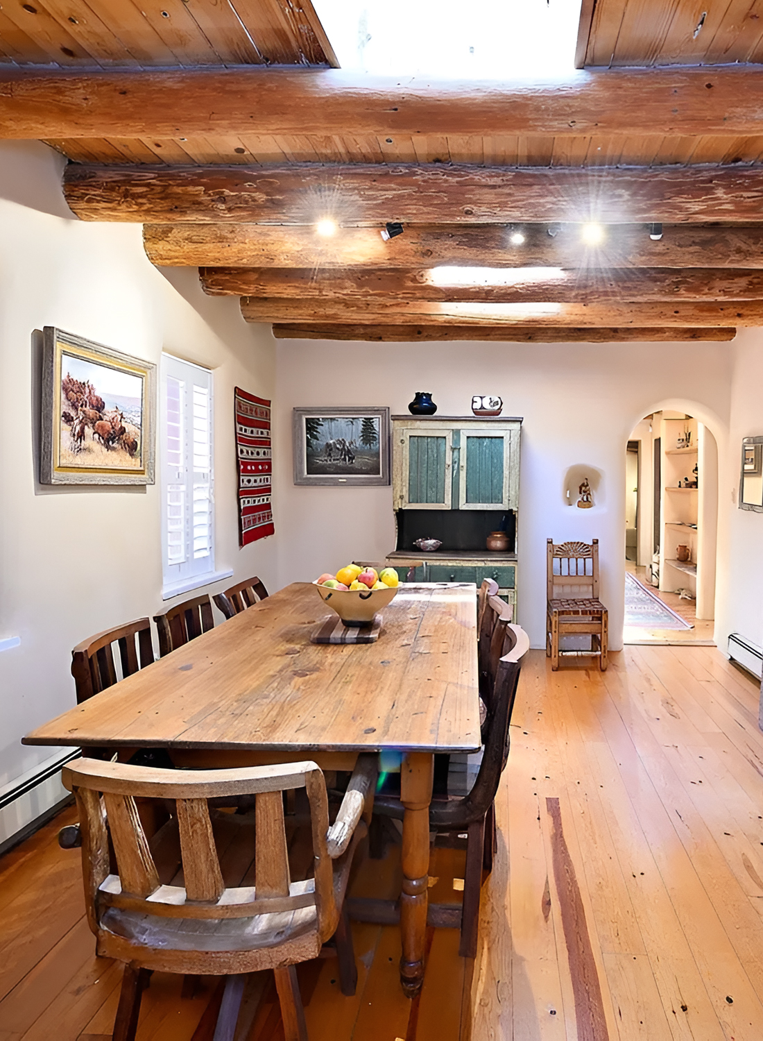 The heavy ceiling beams and wood planks bring strong rustic texture overhead. Then the wood floor adds warmth underfoot. The room is not flashy, but that is exactly what makes it so charming. The antique storage pieces, framed art, niches, and soft archway at the back all create that layered Santa Fe look that feels built over time, not bought in one afternoon.