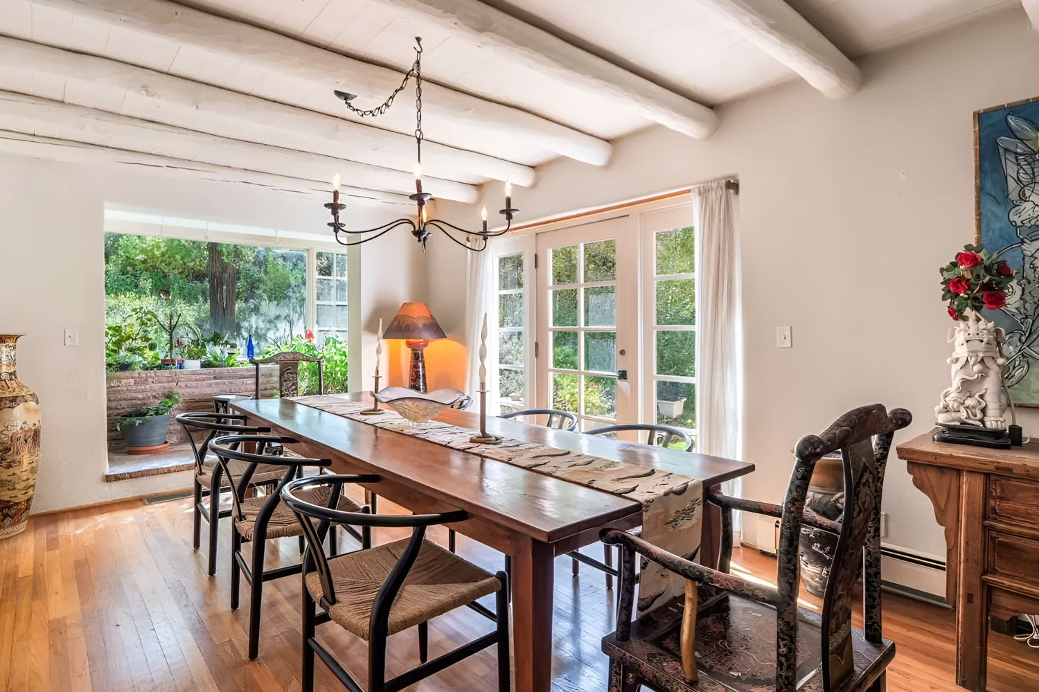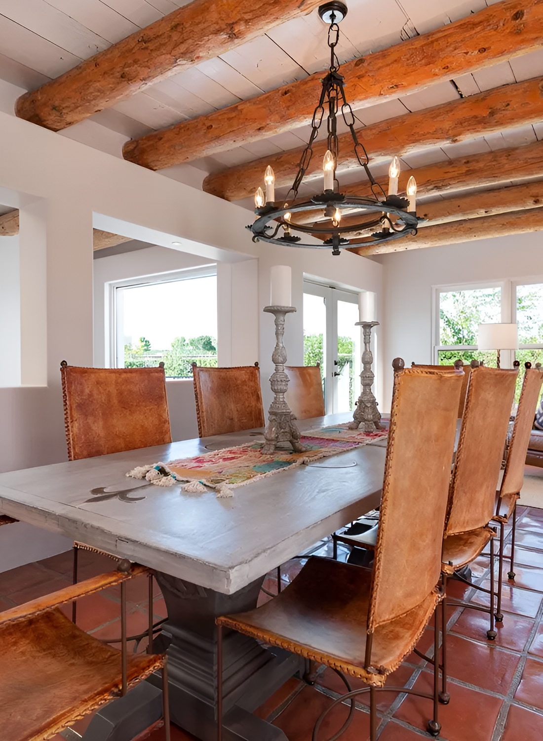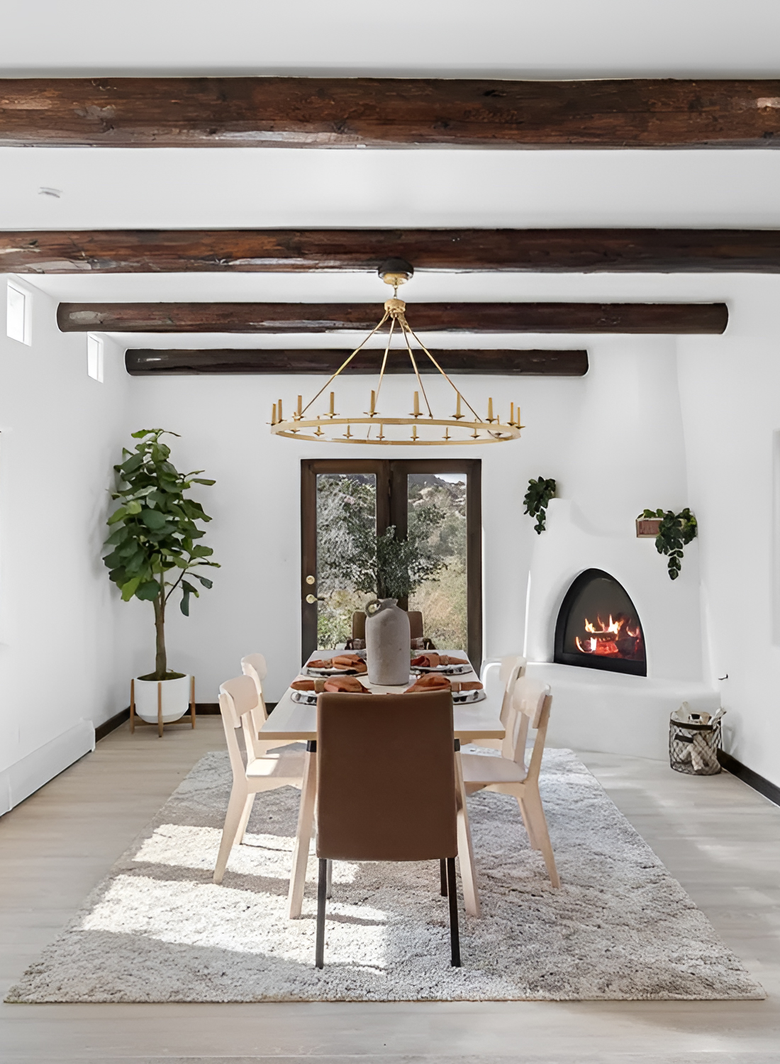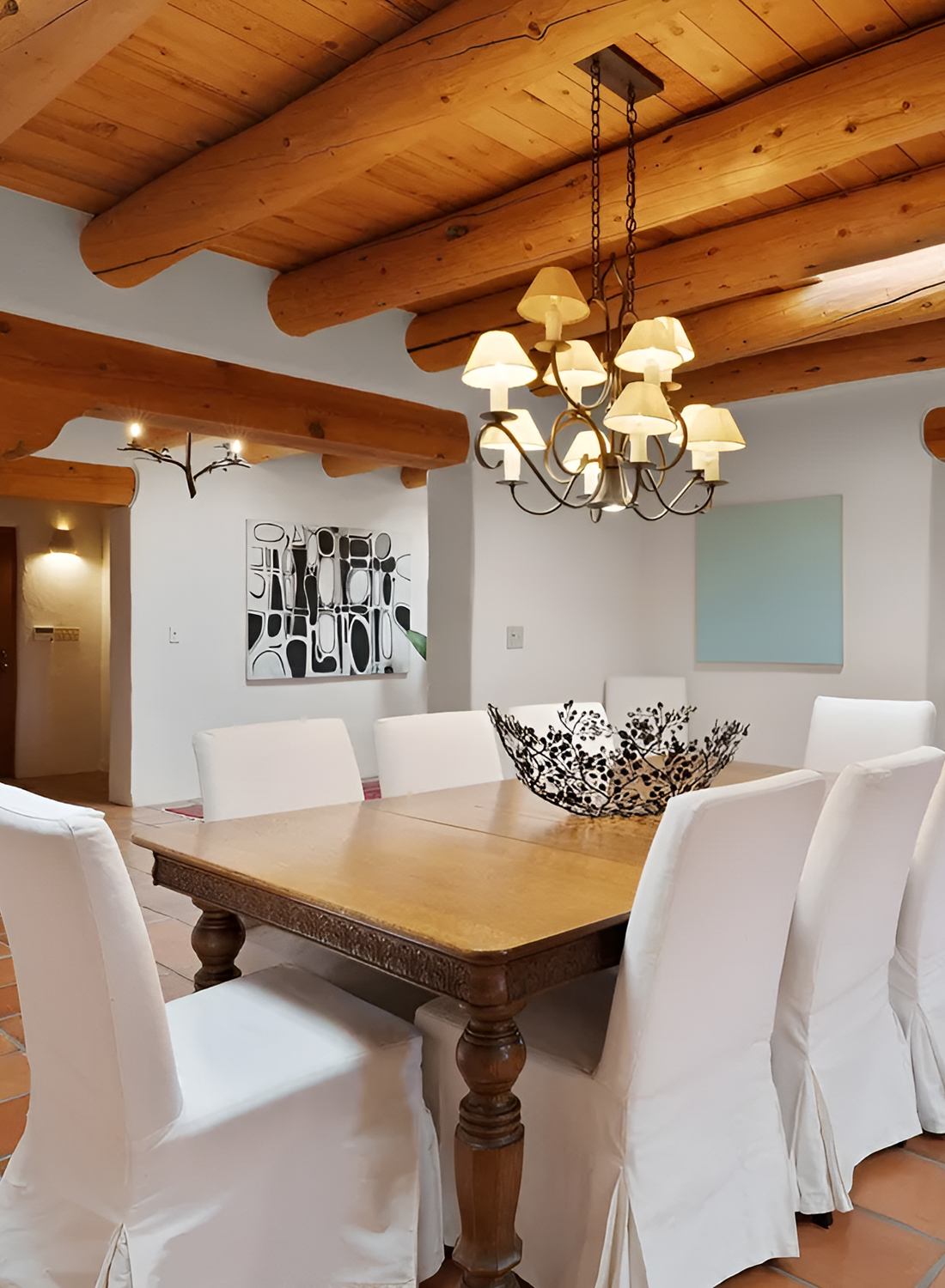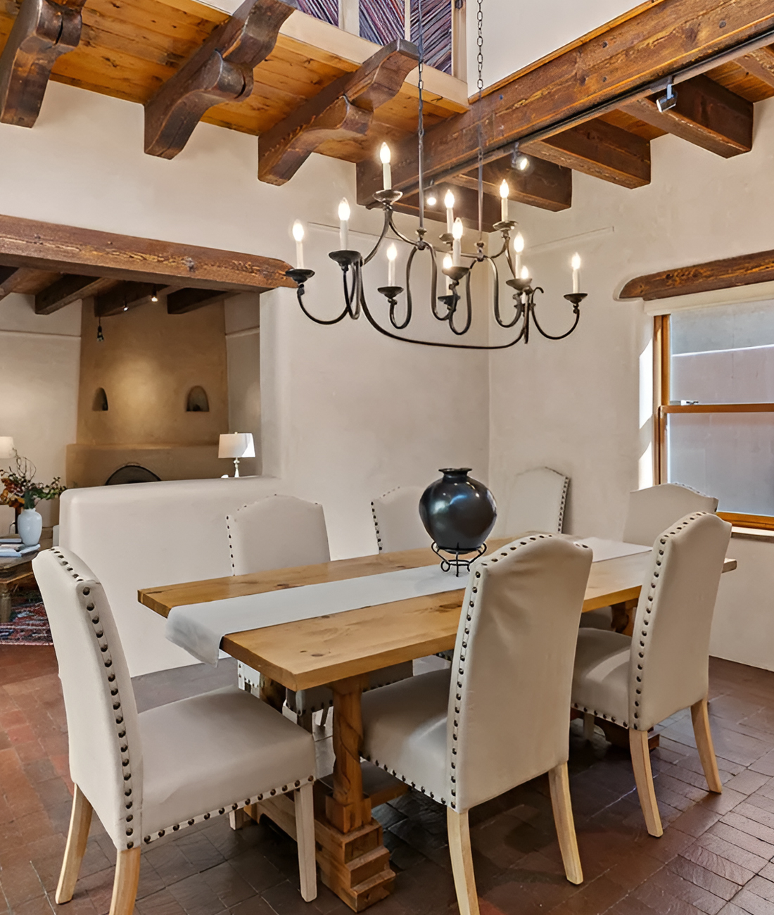 This dining room feels fresh, quiet, and beautifully edited. At first glance, the white walls make the space feel light and open. Then the dark wood beams step in and add the drama. That contrast is what gives the room its strong Santa Fe look. It feels clean, yet still rooted in tradition.