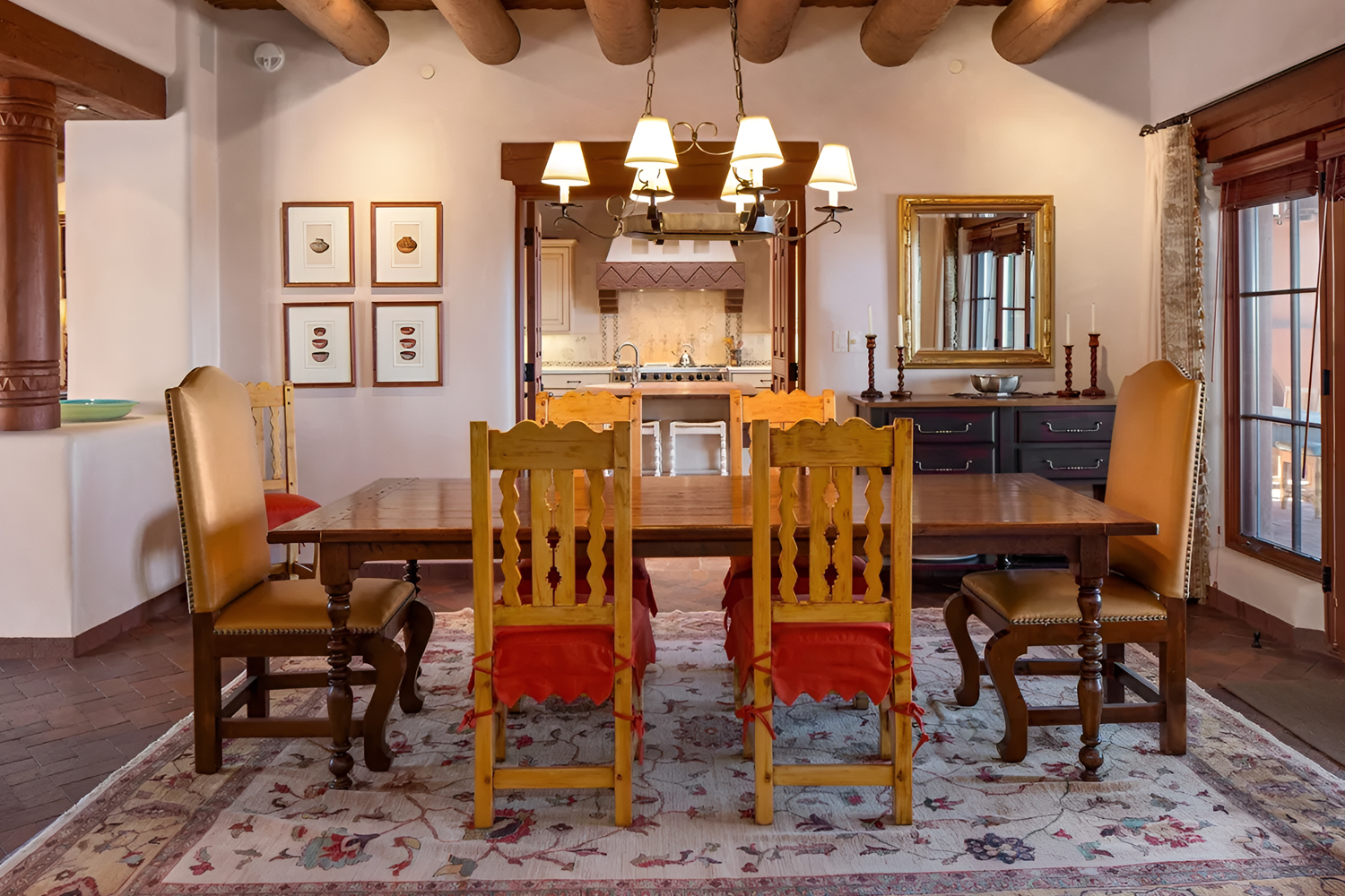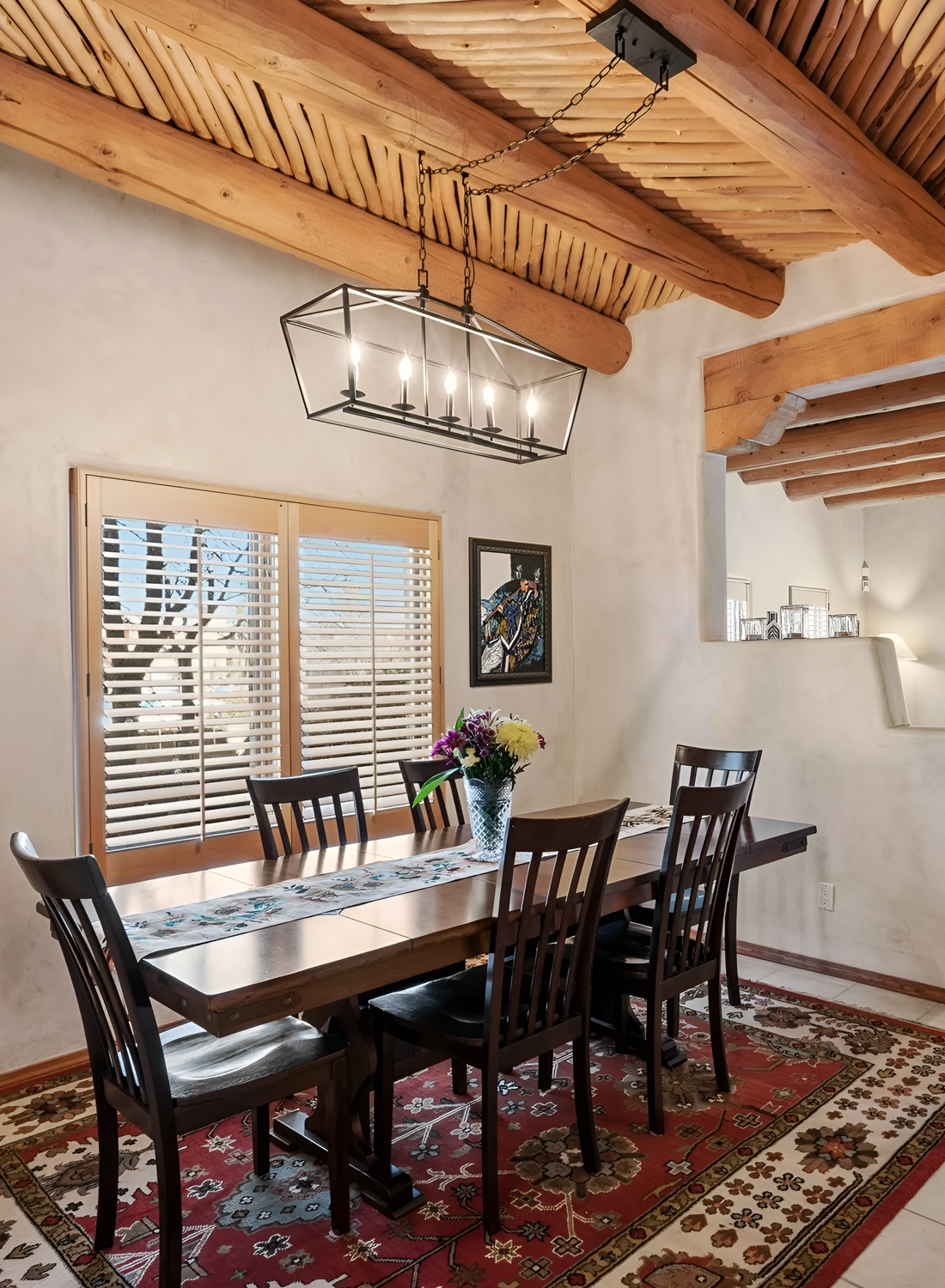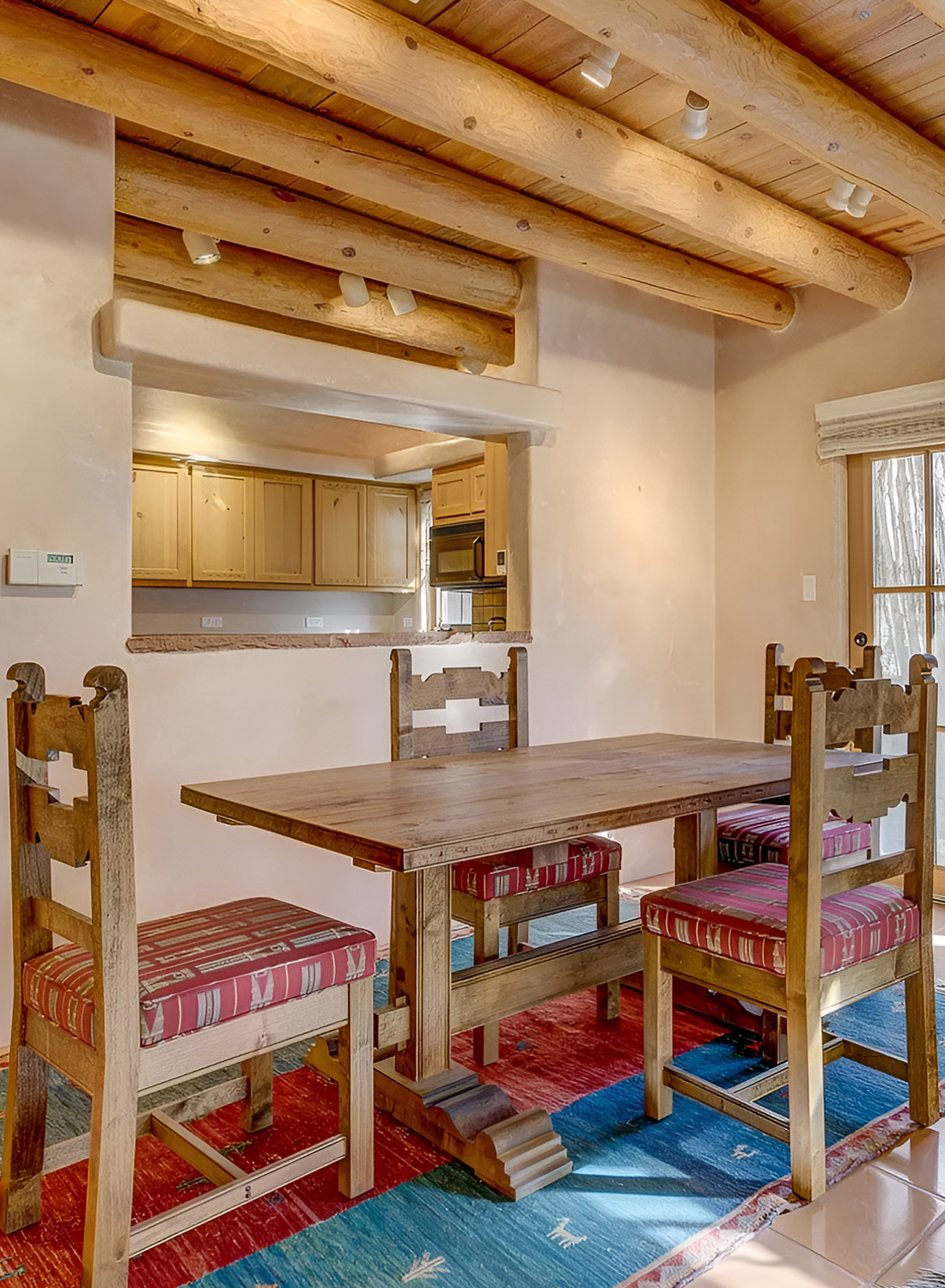 This dining room feels intimate and comfortable. It has a simpler layout, but it still carries that classic Santa Fe charm. The plaster walls, wood ceiling, and exposed beams set the tone right away. Then the red patterned rug under the dining table brings warmth, color, and a sense of tradition.