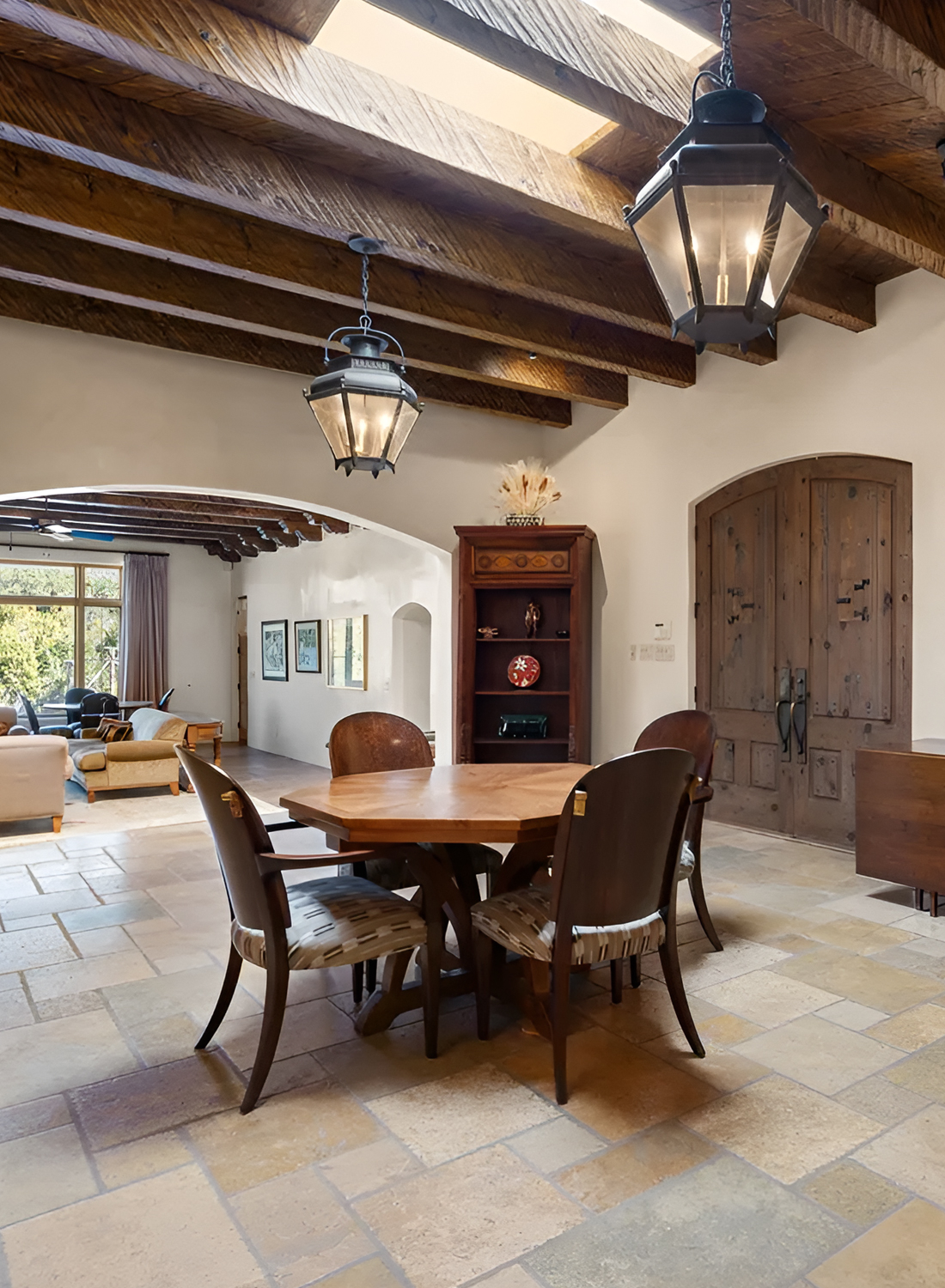 This room feels open, dramatic, and very grounded. It has a more formal look, but it still holds onto the natural warmth that defines Santa Fe style. The stone floor sets the base. It gives the room texture, weight, and a cool earthy tone. Above it, the dark wood ceiling and lantern lights create a beautiful sense of depth.
