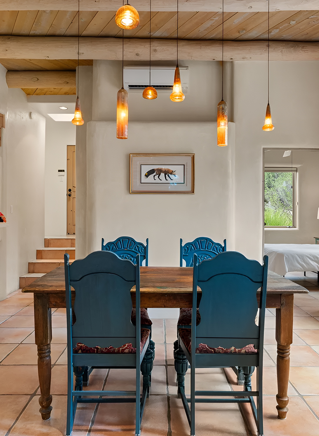 This dining room feels warm, handmade, and full of color. The first thing that grabs your attention is the set of deep blue chairs. They bring so much life into the space. Against the terracotta floor and creamy plaster walls, that color feels bold, but still true to the Southwest.