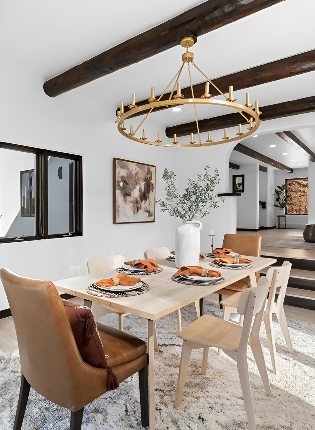 The room also feels very open. The steps leading into the next area create depth and make the dining space feel connected to the rest of the home. That open flow is a smart design move. Santa Fe interiors often feel best when they are relaxed and easy, not boxed in. The soft rug, light floors, and white walls keep the room calm, while the dark beams overhead give it structure.