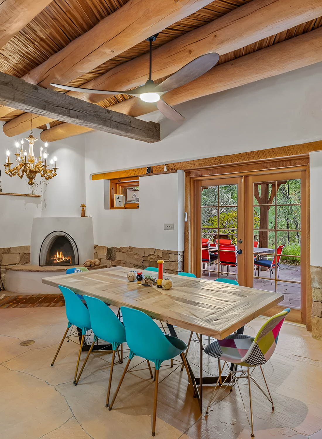 This room feels lighter and more playful. It still has that Santa Fe base, but it leans into a more eclectic look. The raw wood post, exposed vigas, plaster walls, and corner fireplace all root the room in Southwestern tradition. Then the colorful molded chairs break the rules a little, and that is exactly why the room feels fresh.