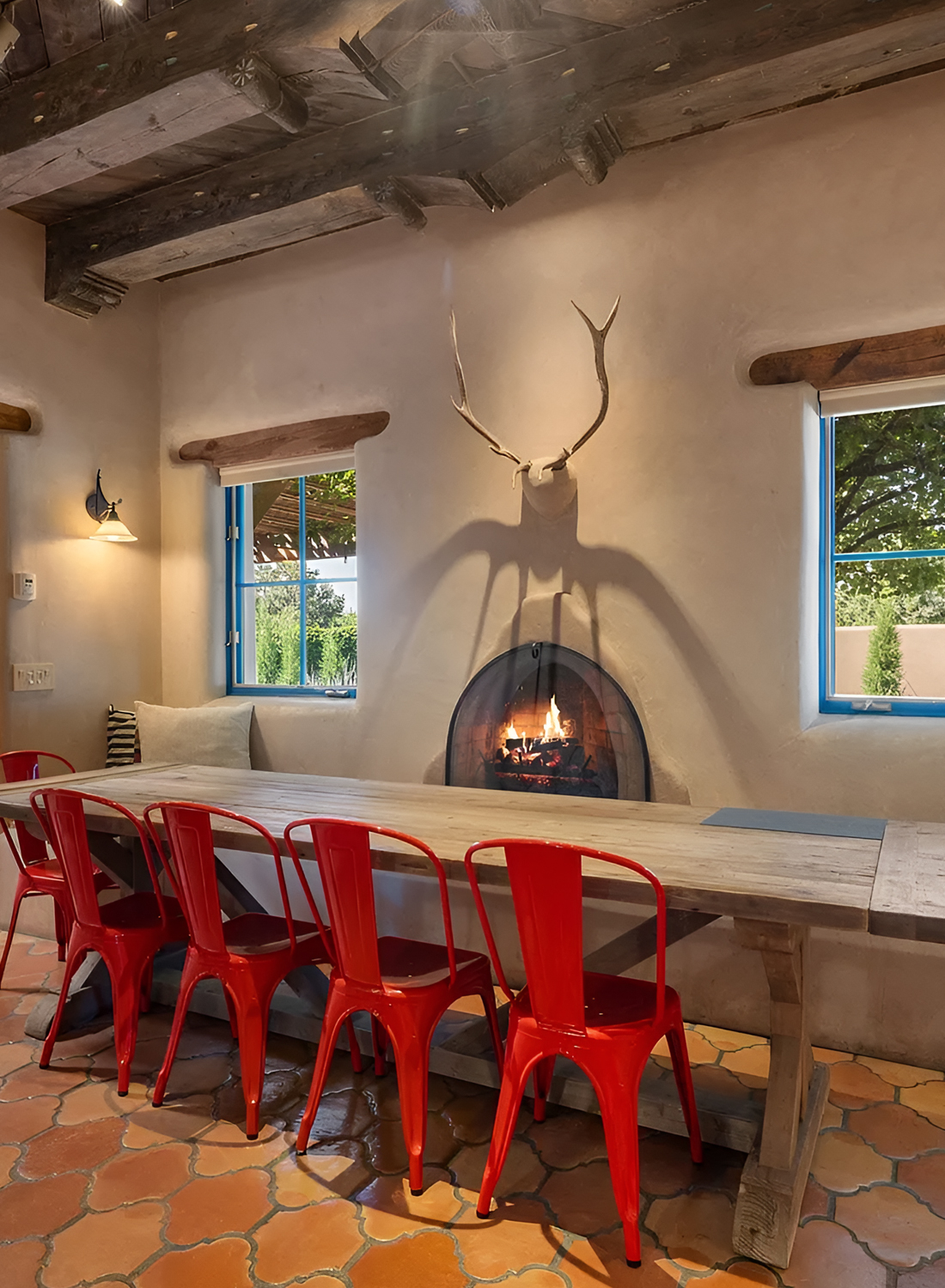 This dining room has a playful spirit, and that is what makes it memorable. At its core, the room has all the right Santa Fe details. There are dark wood ceiling beams, plaster walls, terra-cotta-style floors, and a fireplace with a curved opening. Yet the bright red chairs change the whole mood. They bring contrast, energy, and a fun modern edge.