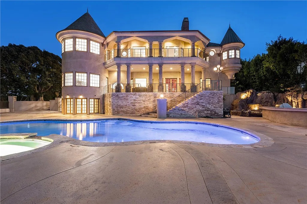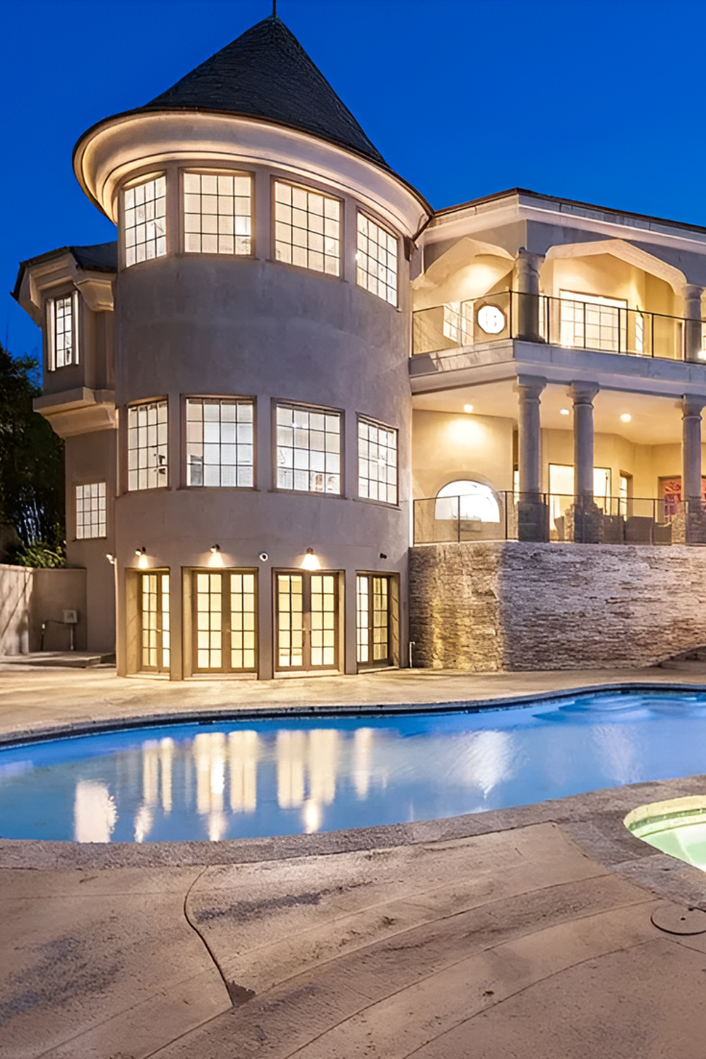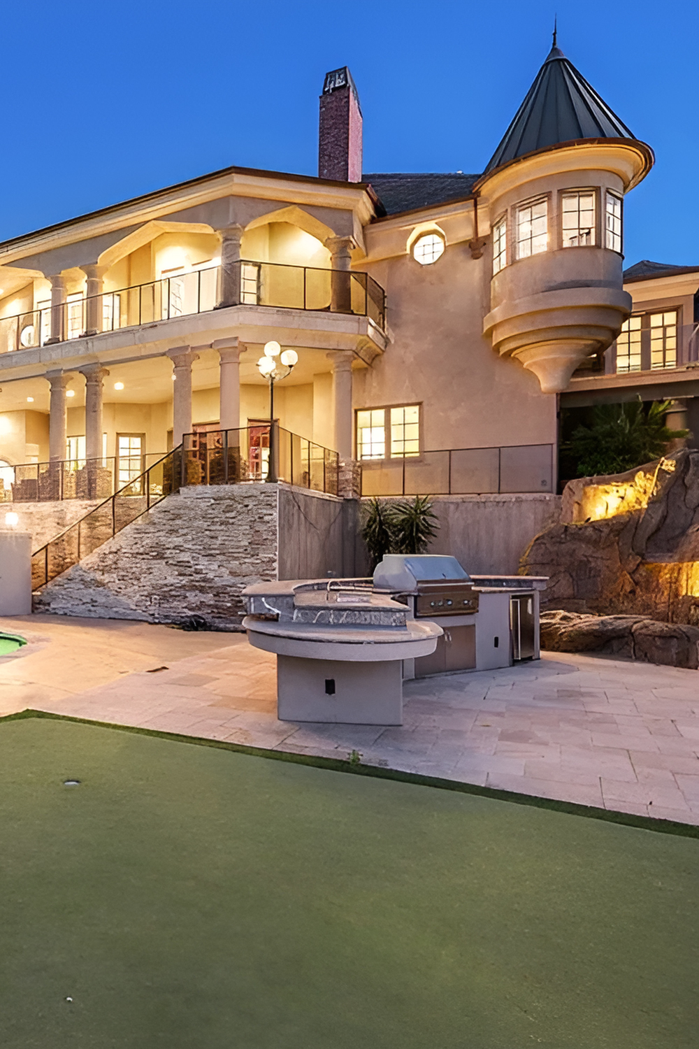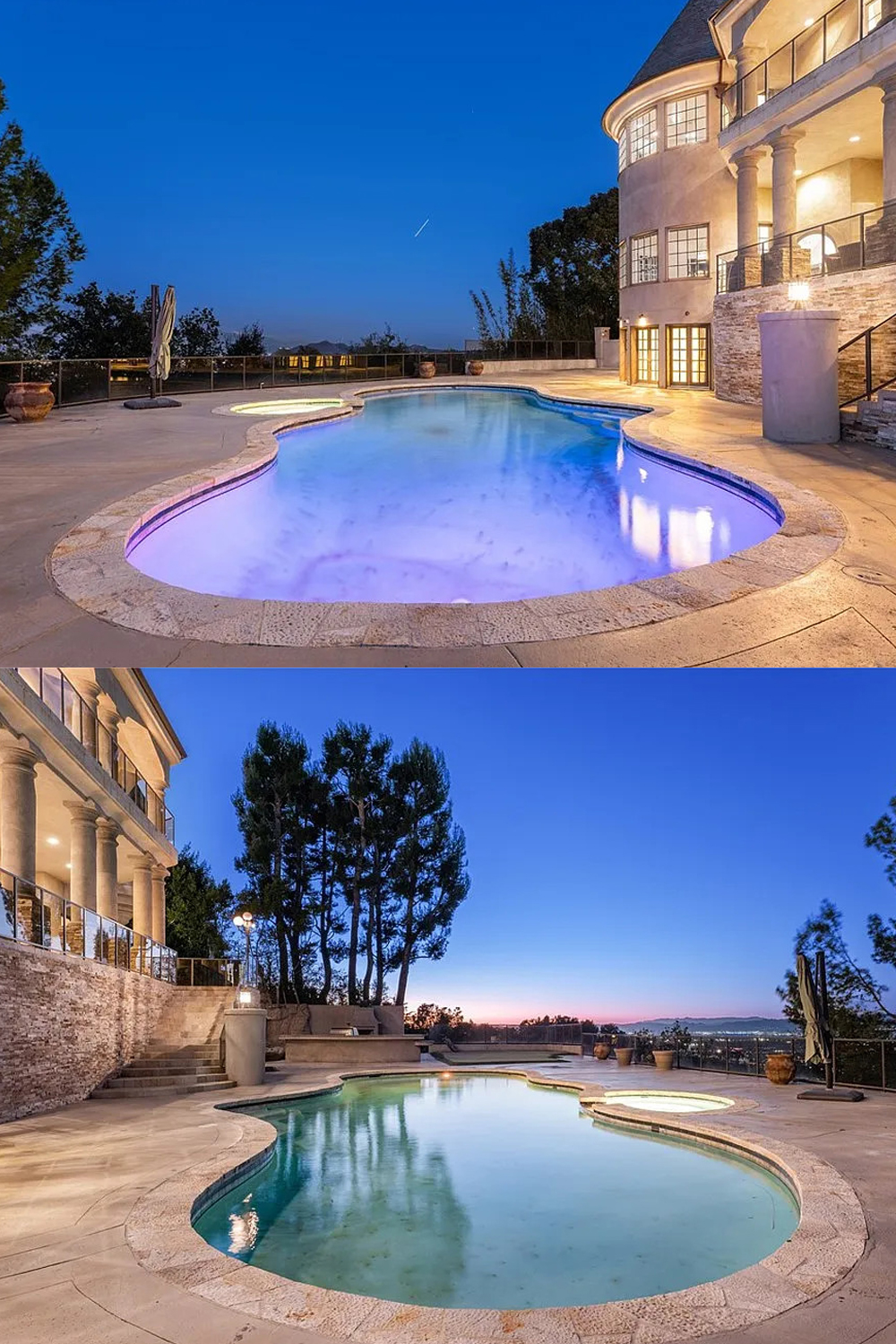 Take a few steps down from the terrace and you’ll find yourself in a backyard paradise. There’s a large, curvy pool and a round spa for relaxing soaks. The patio around the pool is finished with smooth stone tiles that stay cool under your feet. The pool area is big enough for pool parties, family fun, or just lounging by the water. To one side, there’s a built-in grill with a stone counter—perfect for cookouts. The whole space is designed for easy living and outdoor fun. You can play, relax, and entertain, all in one spot.