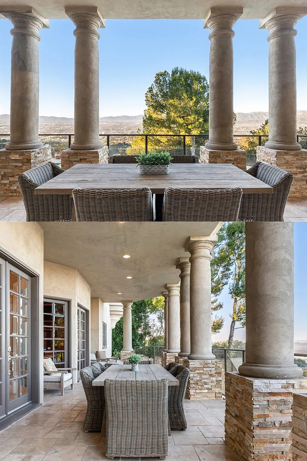 Around the back and sides of the house, you’ll find wide terraces with massive columns. These round columns stand tall, supporting a deep roof that keeps the patio cool and shaded. The columns rise up from short stone walls, which add a nice rustic touch. On the terrace, there’s plenty of room for a big dining table and cozy chairs. You can imagine having breakfast here on a sunny morning or gathering with friends at sunset. The columns give the outdoor spaces a strong, graceful look. At the same time, they make everything feel open and connected to the view.