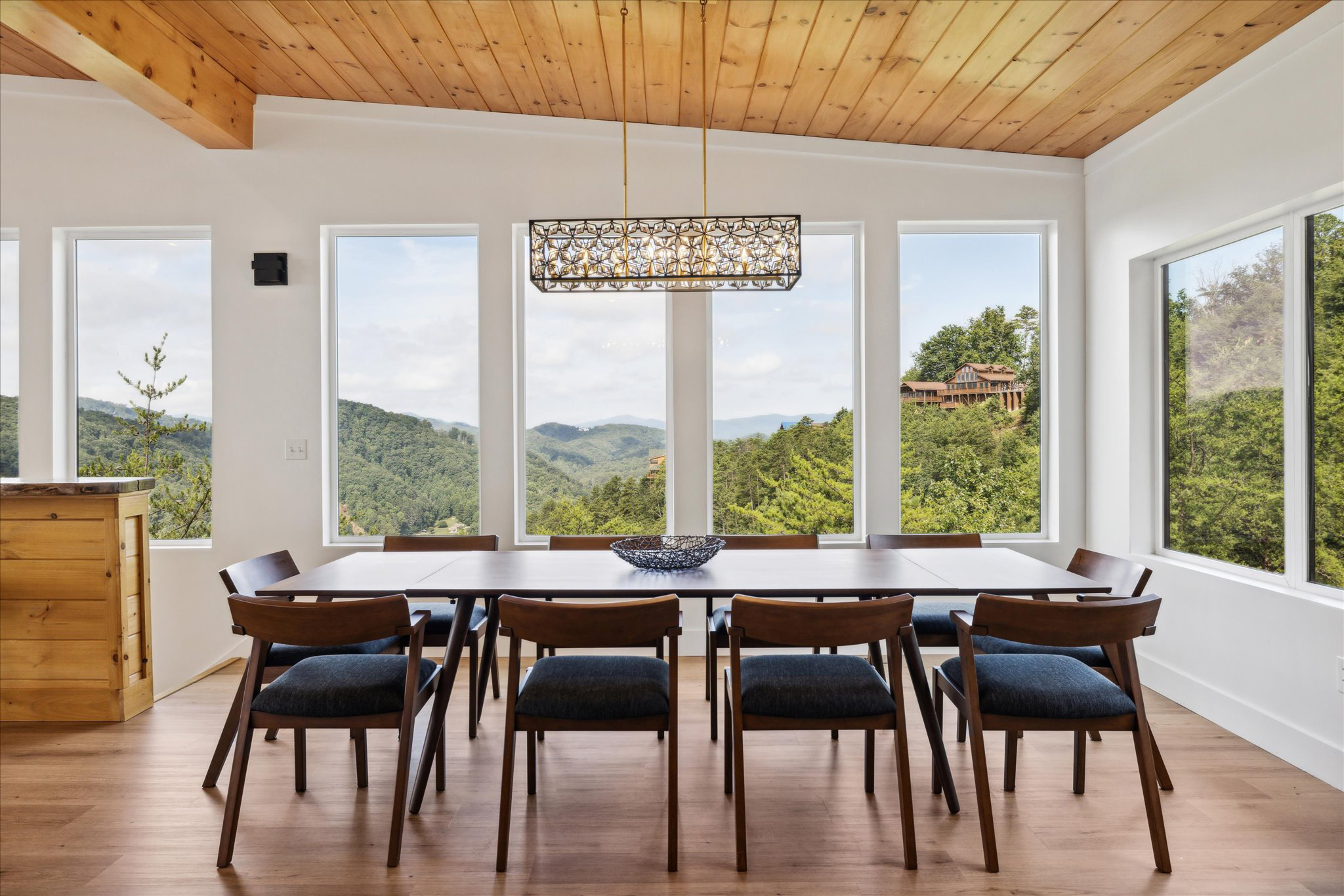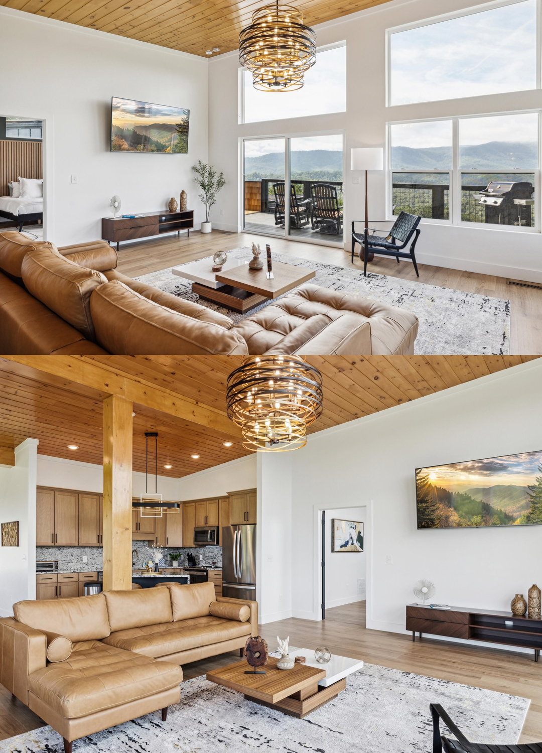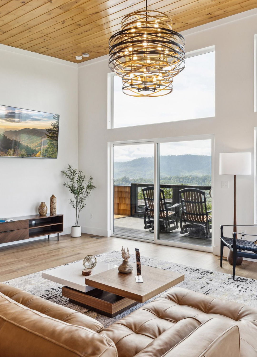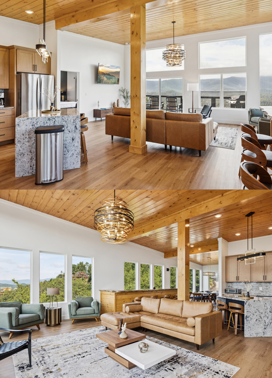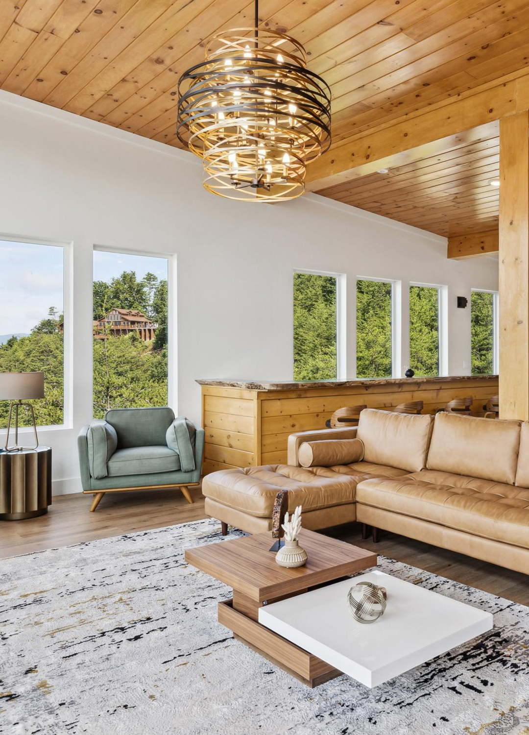 The main living area greets you with floor-to-ceiling windows. These windows bring the outside in, filling the space with sunlight and framing breathtaking mountain views. The ceiling is finished in golden-toned wood planks, which match the exposed wood beams. This adds instant warmth and a natural touch.