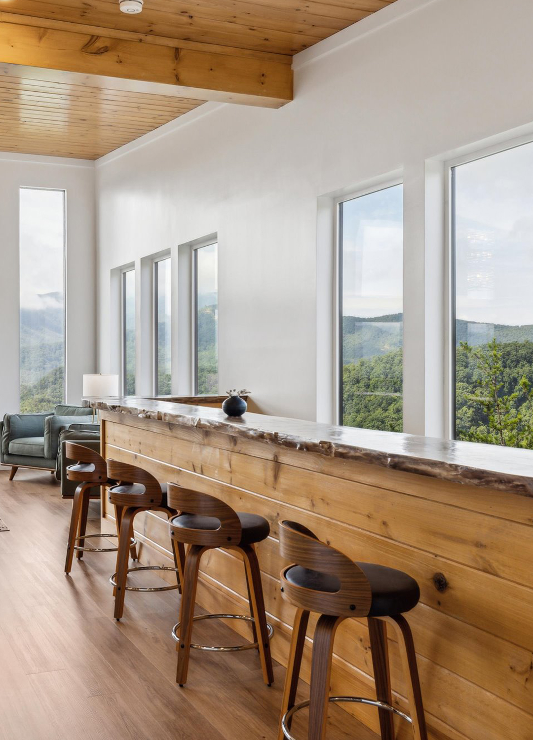 Just beyond the dining area, a stunning bar stretches along the windows. The bar is made from solid, knotty pine with a live-edge countertop, which keeps the look natural and a bit rugged. Sleek, curved barstools in dark wood and black leather offer style and comfort. This is the spot for morning coffee with sunrise views—or evening cocktails as the sun dips behind the hills.