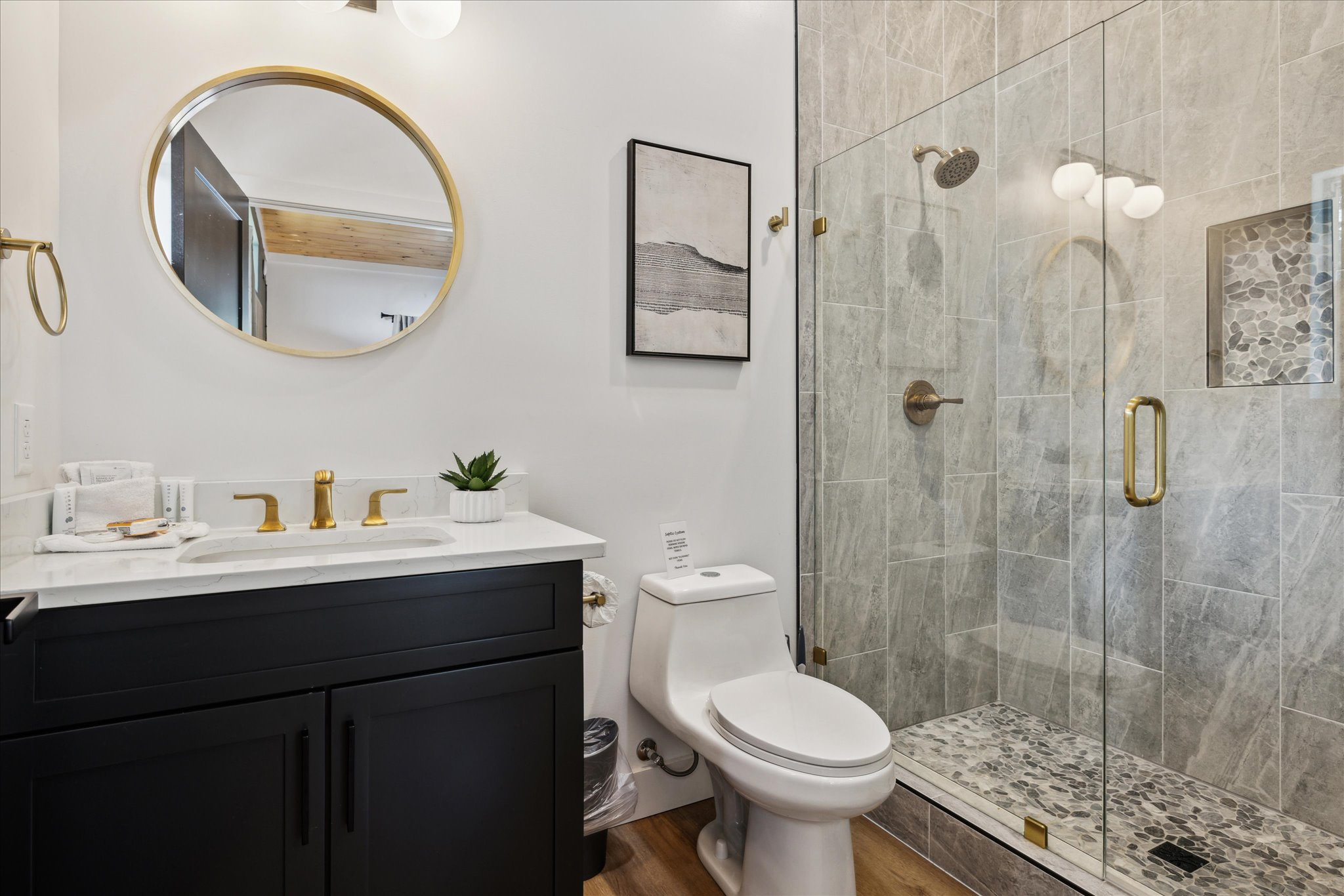 The bathrooms in this home look and feel like a five-star resort. Sleek black vanities are topped with marble-look countertops. The round, gold-framed mirrors reflect both light and luxury. Brass hardware and fixtures add a touch of glam without feeling out of place.