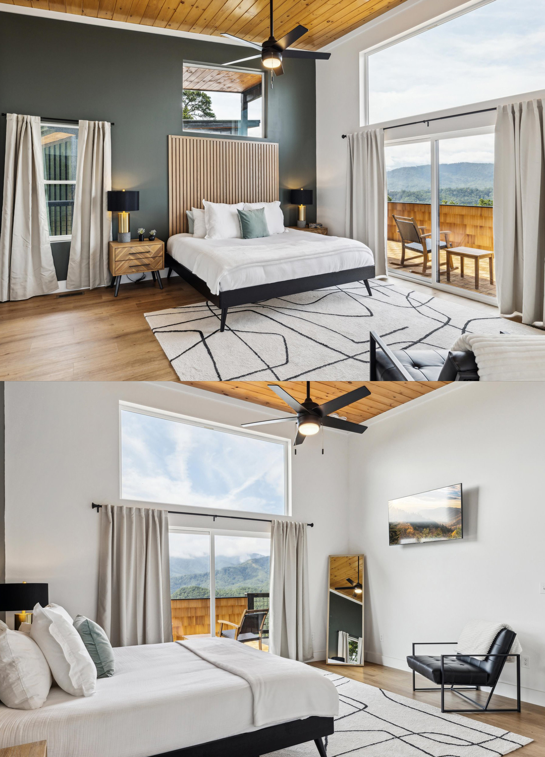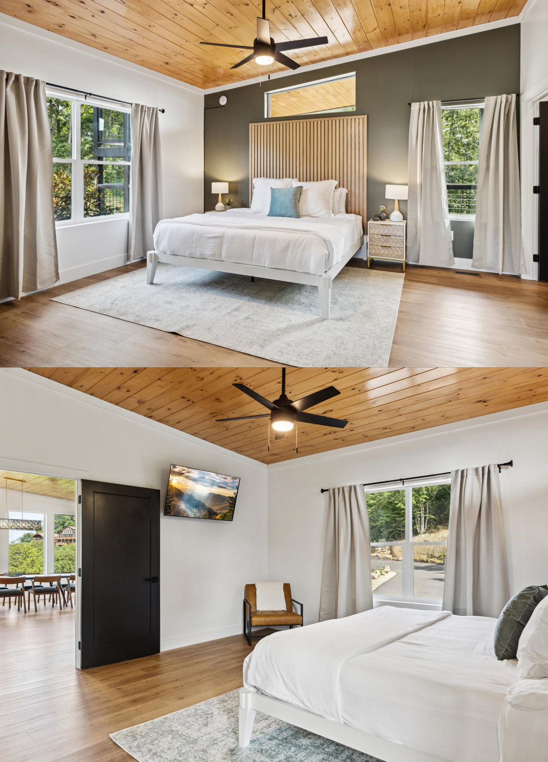 The bedrooms are designed as peaceful retreats. Large windows and sliding doors ensure you never miss a sunrise or sunset. The main bedroom features a dramatic accent wall in forest green, paired with a tall, slatted wood headboard that draws the eye up. Crisp white linens, plush pillows, and a soft area rug make the bed extra inviting.