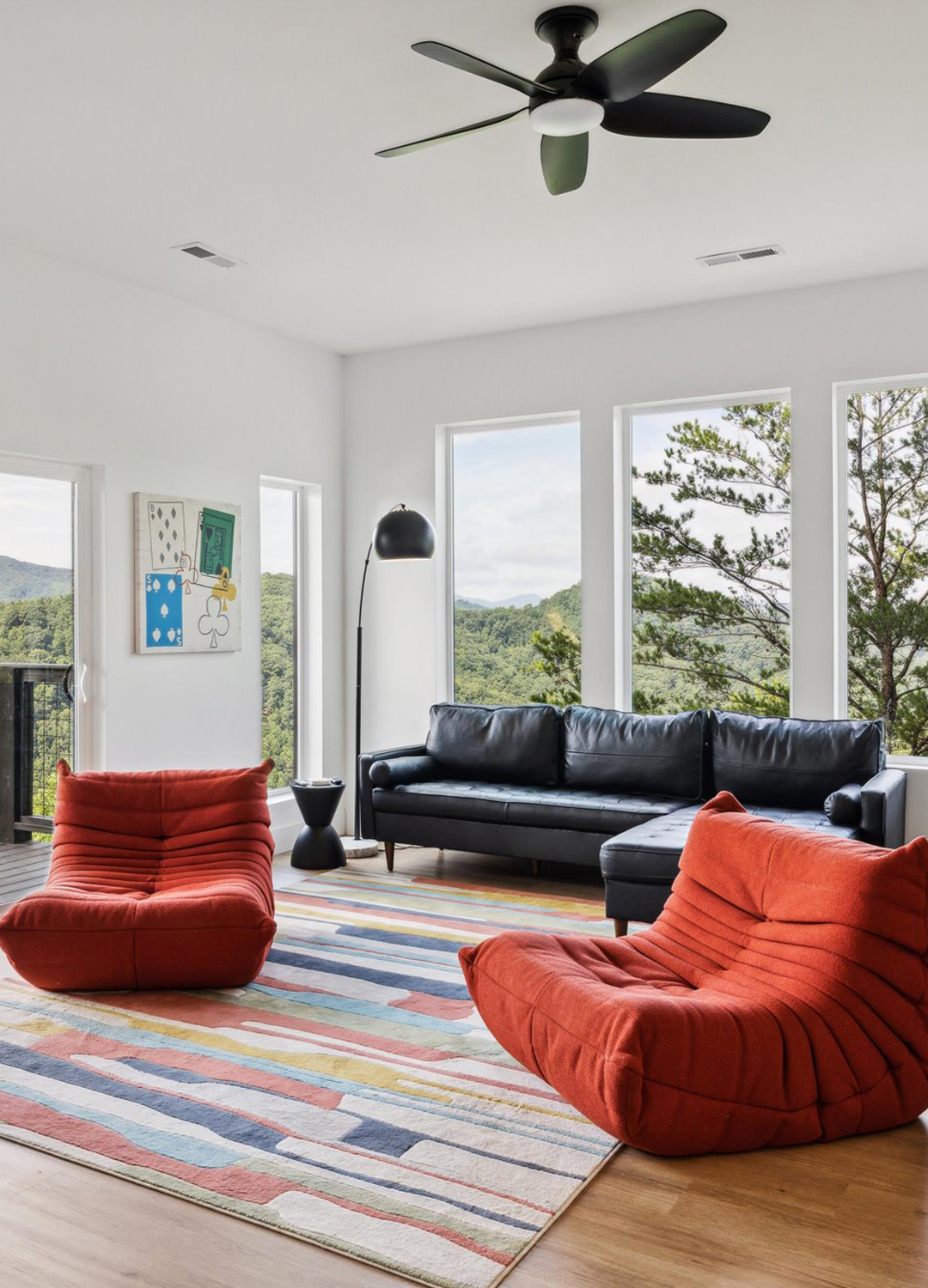 A separate lounge features playful seating—think bold, red accent chairs that are easy to move around. A striped rug adds color and energy. Art and accessories in this room are quirky and fun, making it a favorite hangout spot for both kids and adults.