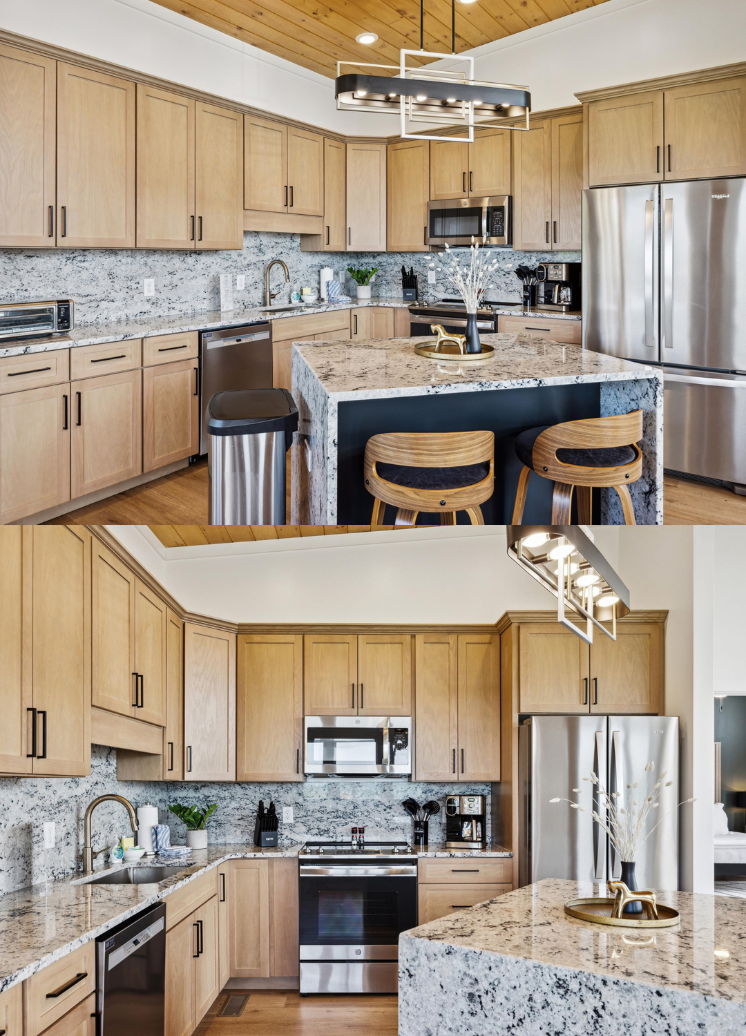 The kitchen combines high-end finishes with mountain-inspired materials. Light wood cabinets create a fresh and welcoming vibe. The countertops and backsplash are stone-look granite in shades of white, gray, and black. This adds a touch of luxury while echoing the colors of the surrounding mountains.