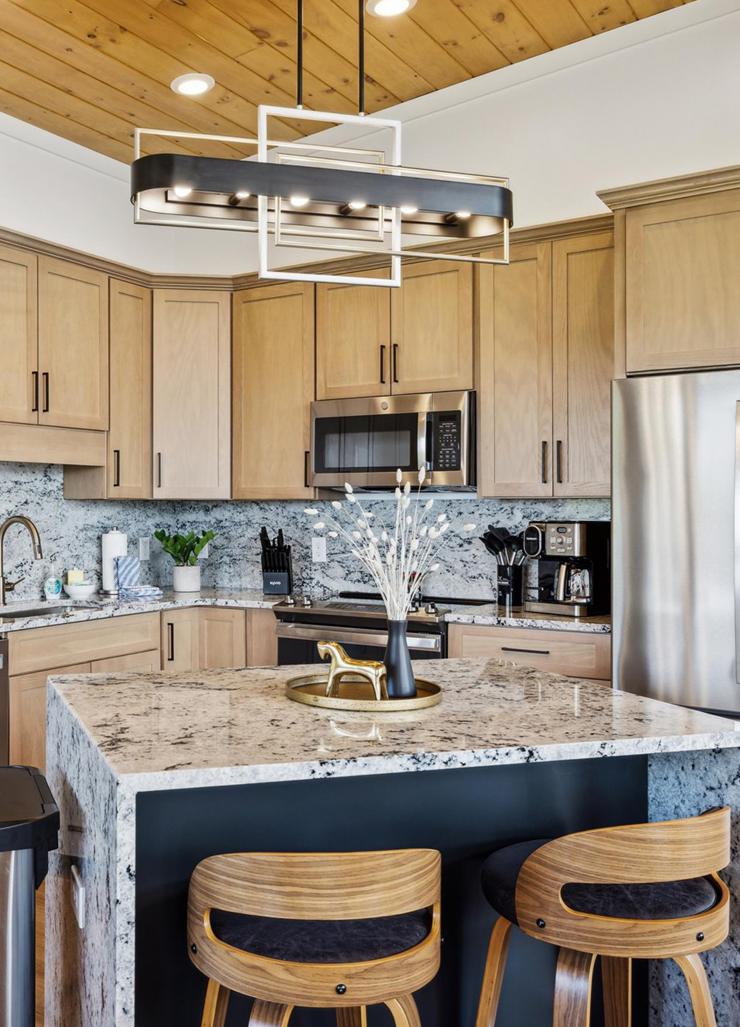 Stainless steel appliances bring in a modern note. Black metal hardware keeps the look sharp. Over the island, a geometric pendant fixture adds just the right amount of drama and ties in with the lighting elsewhere in the home.