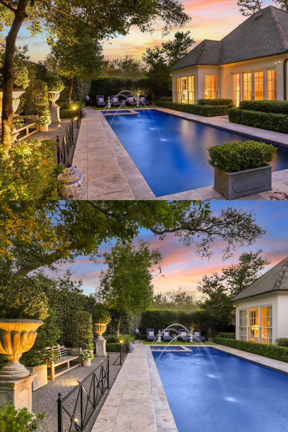 The backyard is a showstopper. There’s a sparkling pool lined with pale stone, perfect for a dip on a sunny day. Hedges and shrubs form neat green walls, giving you privacy without feeling closed in.