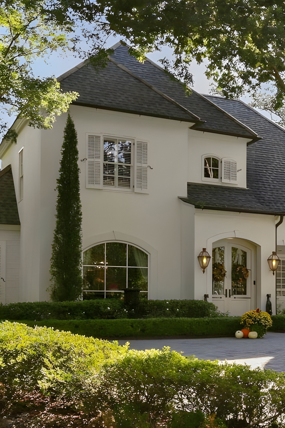 Let’s start outside. This home has undeniable curb appeal. The façade is crisp and welcoming, painted in a soft white that glows against the deep charcoal roof. Tall, slender cypress trees frame the entrance and lend a touch of European formality. The lush green lawn is edged with manicured boxwood hedges and mature shade trees, making the entire property feel private and peaceful.