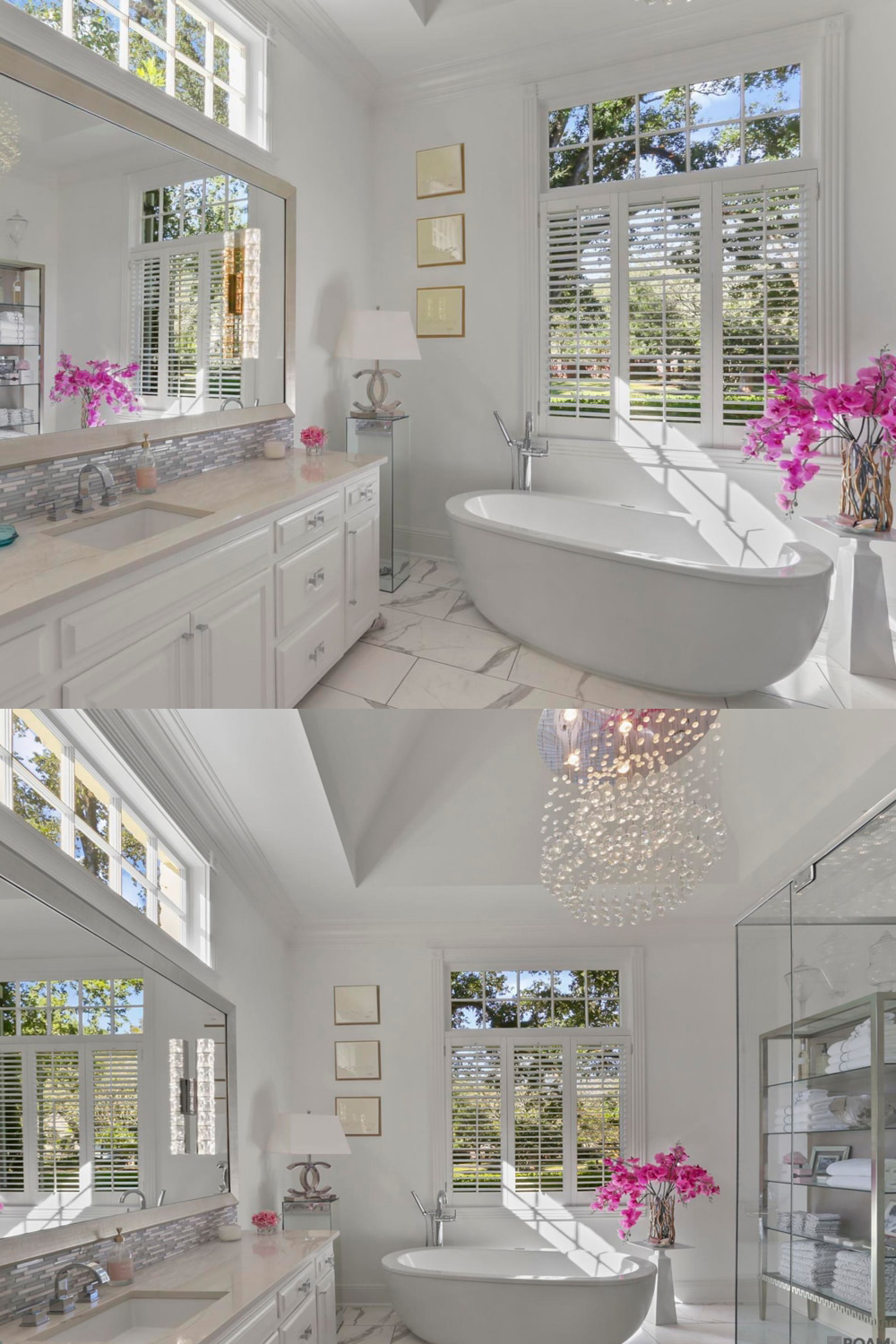 Start your day with sunshine in this bathroom. White marble floors lead to a deep soaking tub under a big window. There’s a huge vanity with two sinks, a wall of mirrors, and a sparkling glass shower. Soft gray tile adds texture behind the sinks. The room pops with pink orchids and fresh towels, making it feel cheerful and new. Plantation shutters offer privacy, but still let the daylight pour in. It’s bright, it’s fresh, and it feels like your own mini-spa.